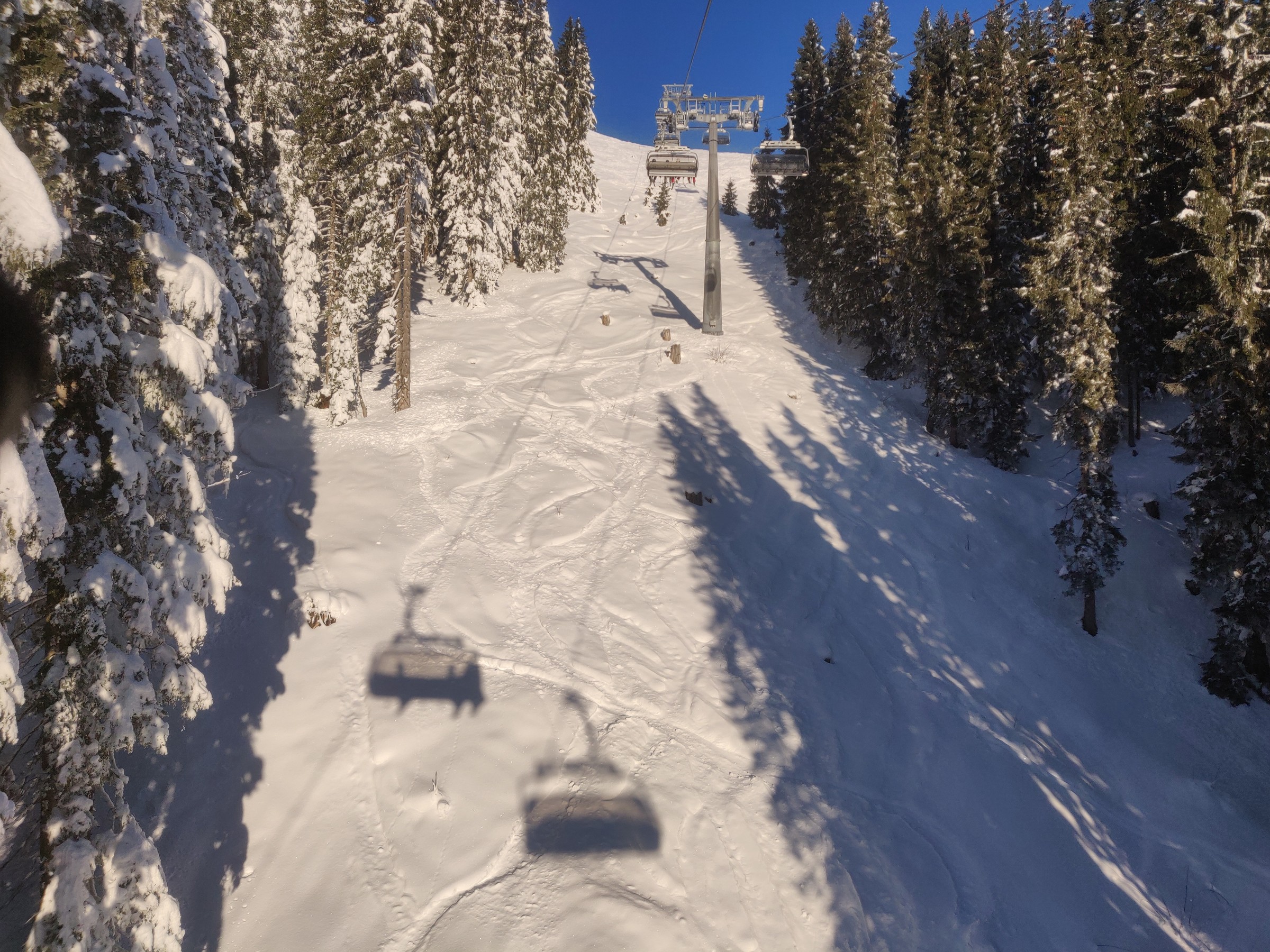 Diese Piste hat einen wirklich perfekten Zustand. Der Schnee war griffig, aber gleichzeitig auch ein bisschen weich und trocken. So, dass man mit Leichtigkeit carven kann und bei seiner Hoch-Tiefbewegung von der Federwirkung des Schnees mit dezenter Geräuschkulisse unterstützt wird. Ich vermute, die geschützte Lage der Naturschneeabfahrt sorgt für die wirklich idealen Pistenbedingungen.