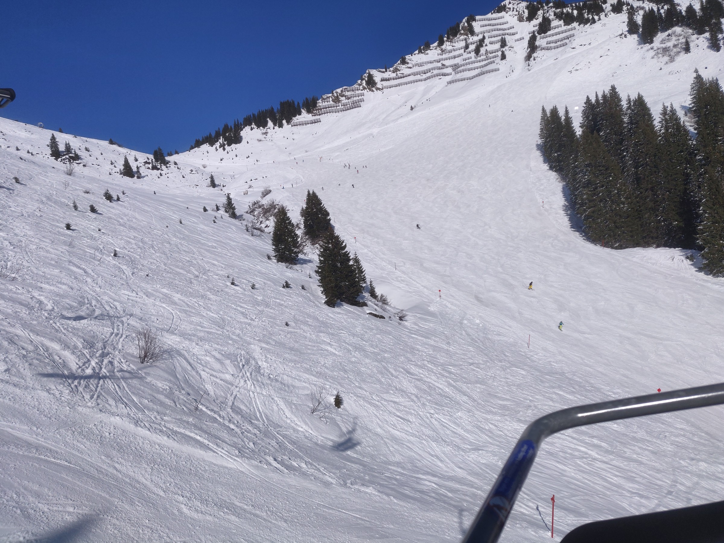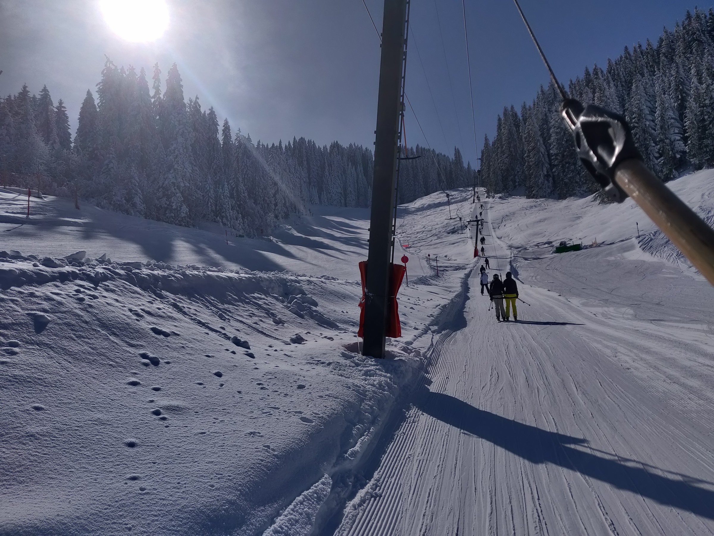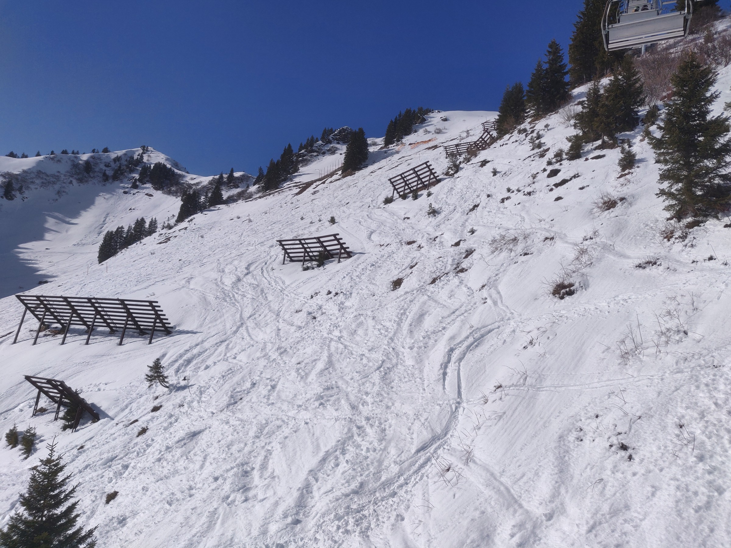 Oben schließlich der Blick auf den Sessellift Muttelberg. Die Pisten hier oben sind herrlich aufgefirnt, aber nicht bucklig. Es ist leer und auch die eher langsamen Lifte tragen zur Entschleunigung bei. So sehr kann man beim Skifahren selten entspannen. Zur Wahrheit gehört aber auch: Es fehlt hier an einigen Stellen der Schnee. Zum Beispiel an der Piste unter der Doppelsesselbahn: