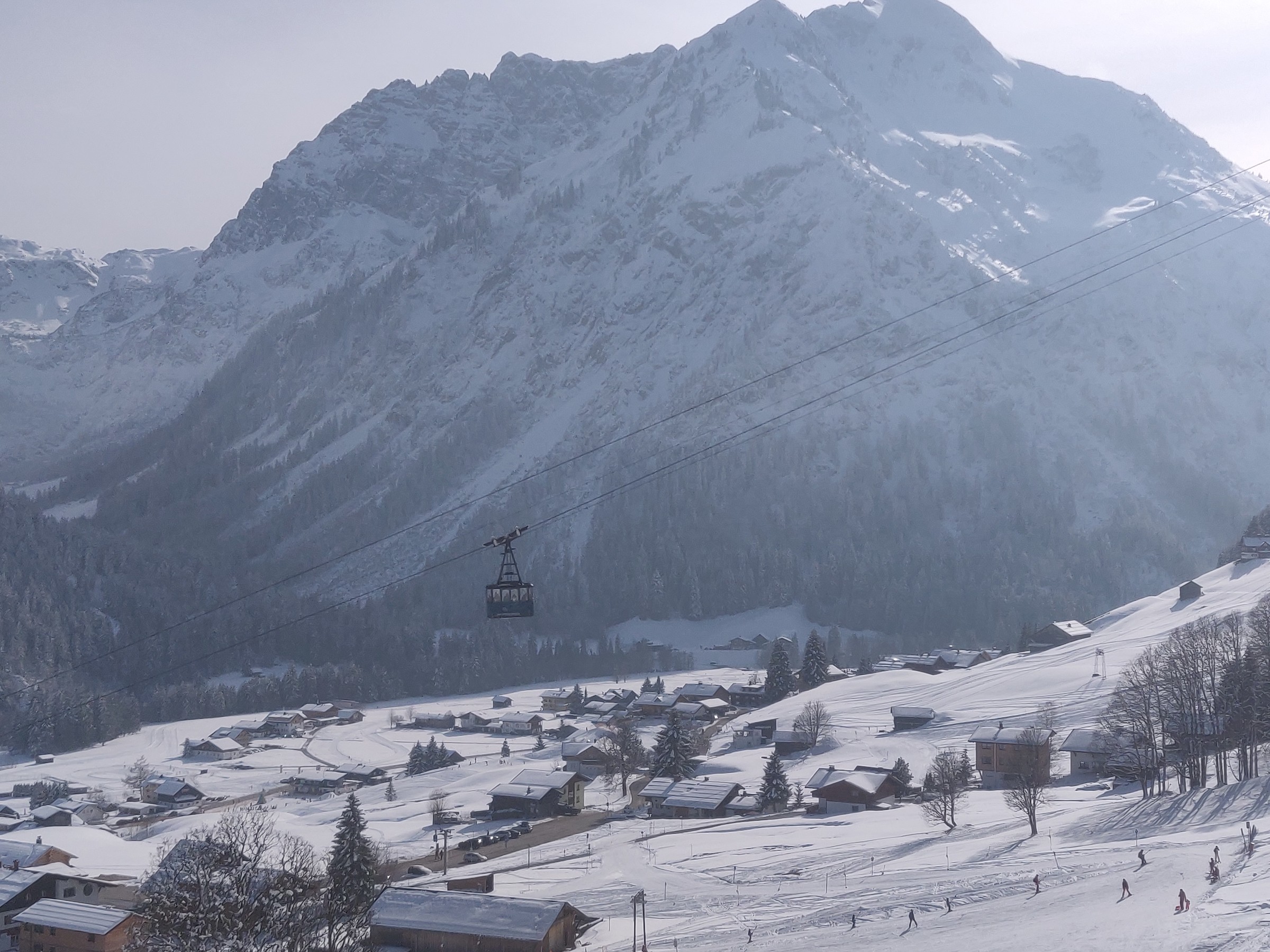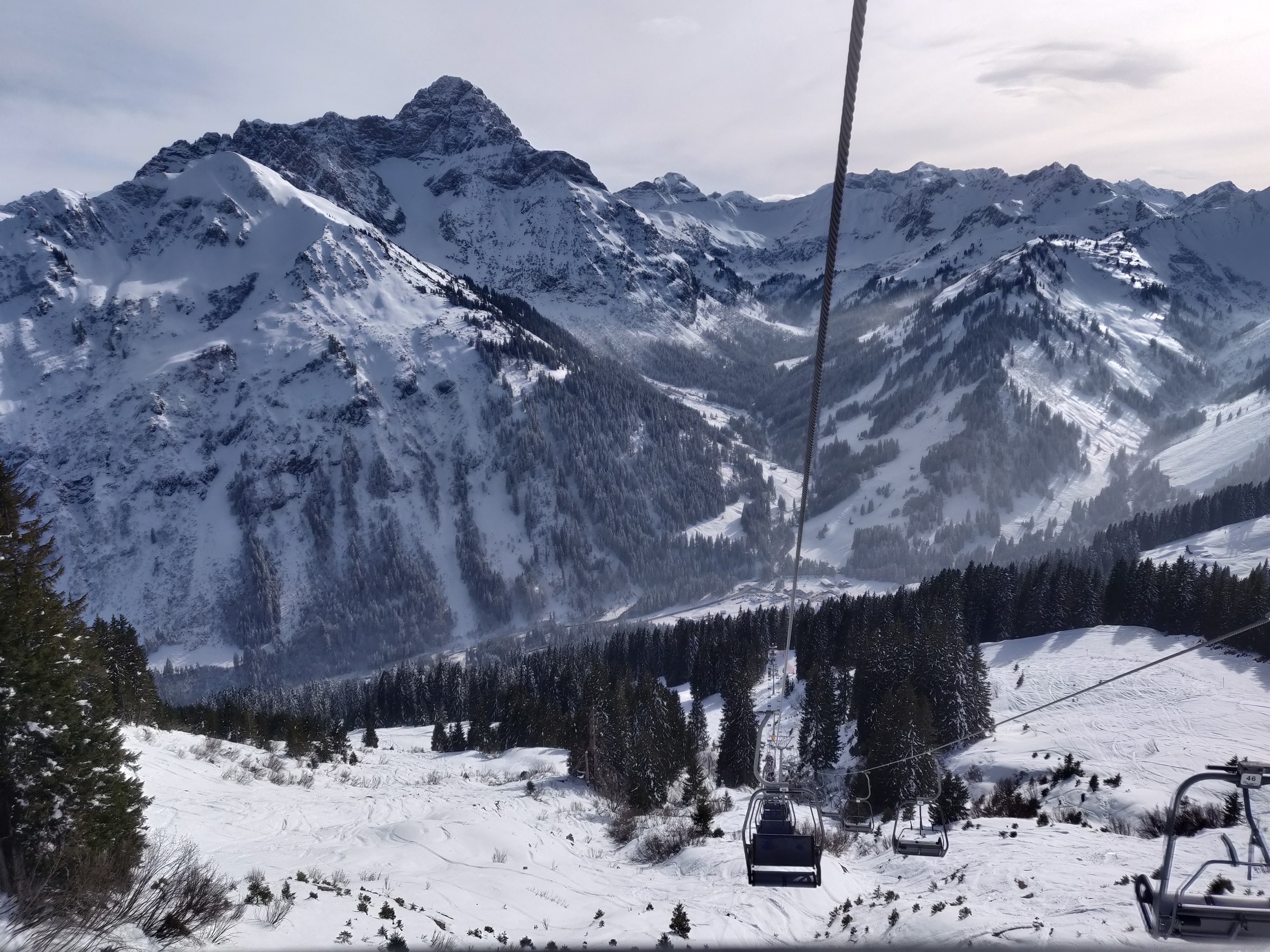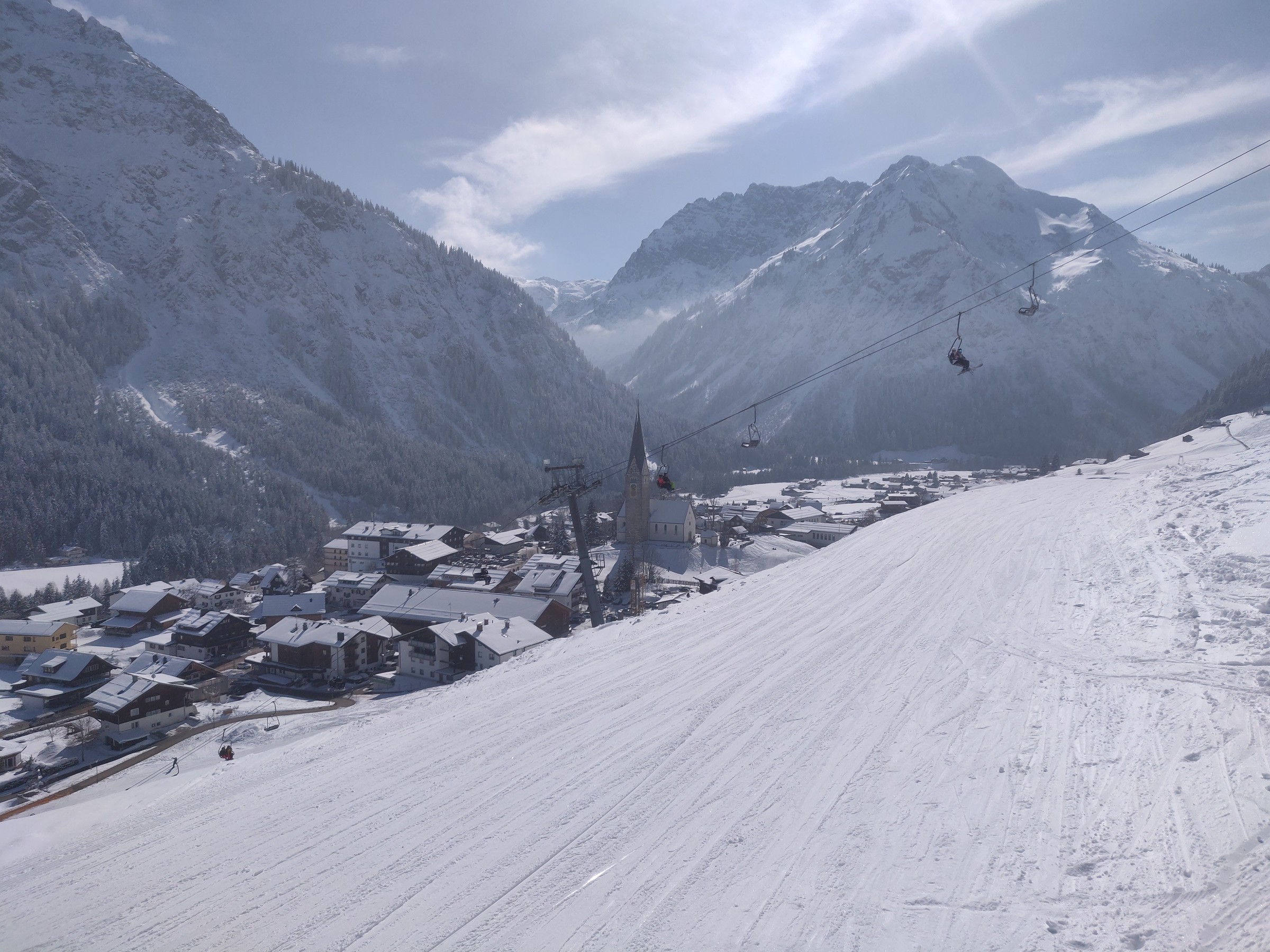 Wieder oben zeigt sich aus der steil trassierten Doppelsesselbahn auch das Örtchen Baad. Durch die steile Trasse fällt die langsame Fahrgeschwindigkeit der Anlagen nicht so ins Gewicht. Hoffentlich bleibt dieser Berg, wie er ist. Dass es inzwischen zuzieht, ist überhaupt nicht schlimm, denn noch mehr Sonne würde die Haut (und insbesondere die Lippen) wohl nicht vertragen.