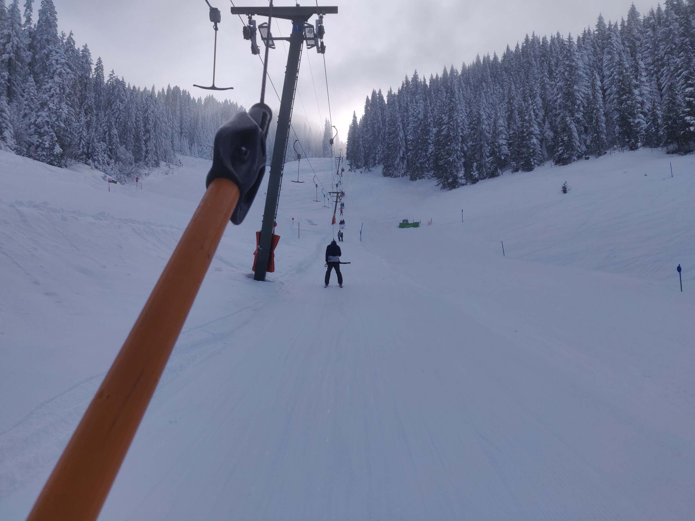 Dabei bietet sich eine kleine Runde am Gaisbühllift an. Inzwischen ist deutlich mehr los im Skigebiet. Von der Bergstation des Übungsliftes aus lassen sich die Wartezeiten abschätzen: