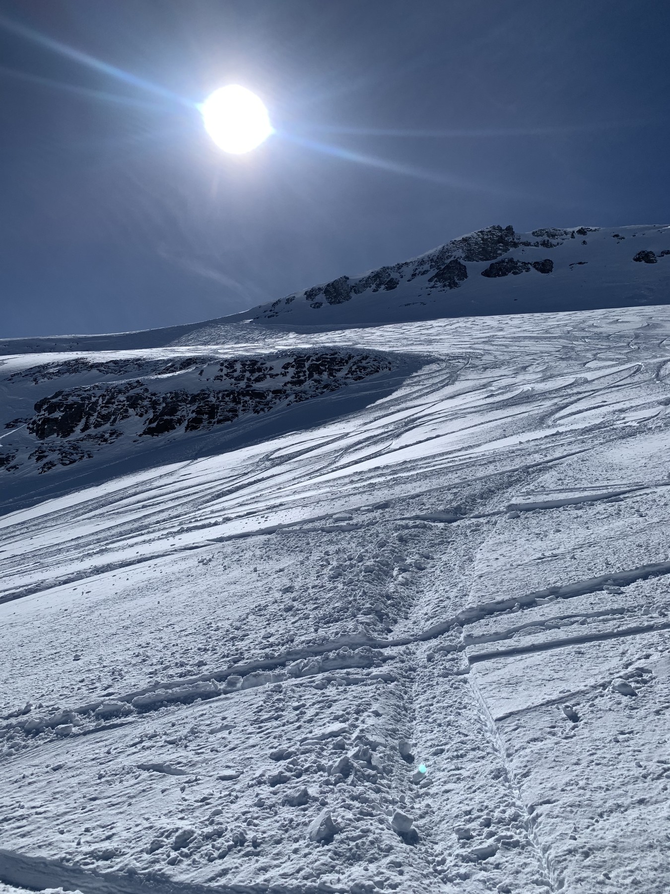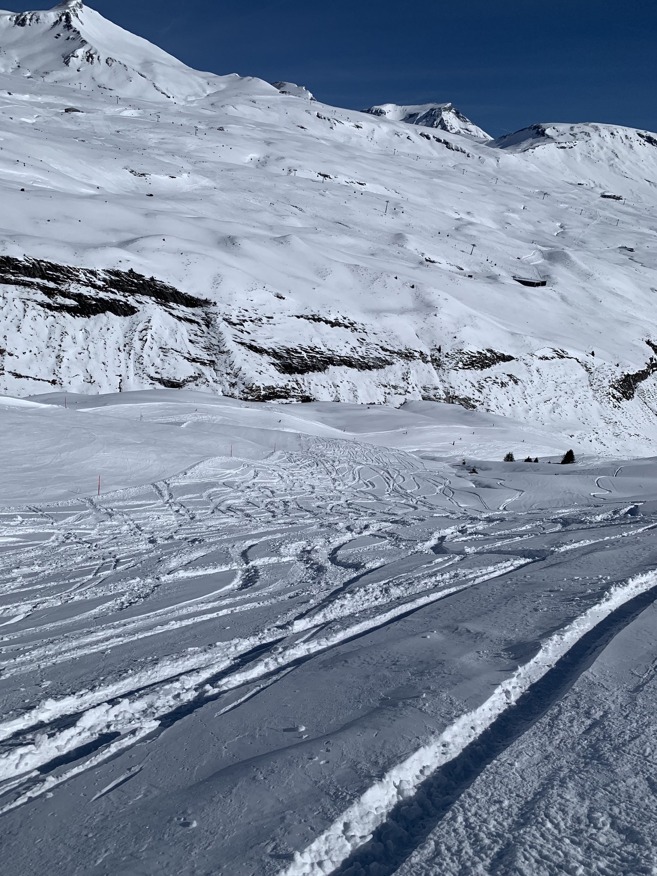Mein Horror wäre verbreiteter Bremsschnee gewesen. Den gab es nur ganz kurz auf der Talabfahrt. Gut hat es nicht reingeregnet und der Neuschnee konnte sich gestern und in der kalten Nacht setzten.