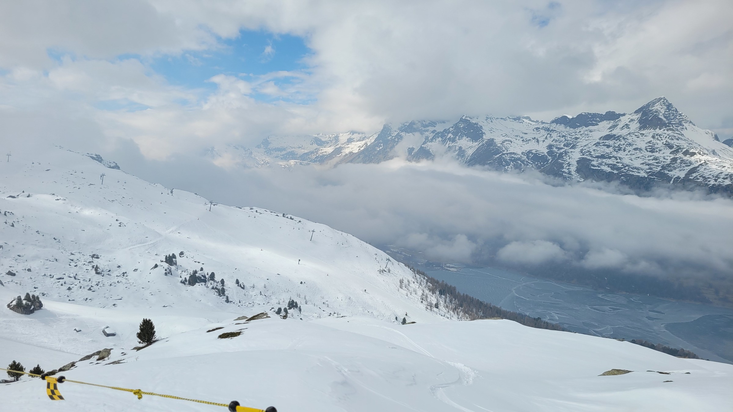 Früh aufstehen hatte sich heute gelohnt, bis 11.30h war das Wetter auf der Corviglia ganz gut, danach eher bedeckt. Allerdings hat die Sonne immer noch durchgedrückt, weswegen die Pistensicht noch relativ gut war. Alp Giop lief heute nicht und es war auch mehr los als letzten Sonntag. Dementsprechend schnell war der Hang vor Salastrains zerfahren und ab und zu war die Single-Line sinnvoll. Die Signal-Talabfahrt ist bei der Unterführung sehr knapp. Der Wechsel zum Corvatsch hat gut geklappt, dank Zwischenkursen der Pendelbahn. Nach dem Mittag war es tendenziell am Corvatsch heller als auf der Corviglia, es gab aber auch dort immer wieder mal Aufhellungen. Am Corvatsch habe ich noch den Gipfel nachgeholt, dort war etwas mehr Neuschnee auf der Piste. An Mandra gab es Wartezeiten wegen dem Weltcup, ging aber noch. Den Murtel-SL habe ich auch noch gemacht, mit wehleidigem Blick auf Giand'Alva. Die Pisten ab der Corvatsch-Mittelstation und Curtinella waren heute deutlich besser als gestern, Rabgiusa lief auch wieder. Gegen 14h habe ich dann die Talabfahrt genommen und der Vollständigkeit halber noch den Cristins SL. War eigentlich noch ein recht guter Tag heute, vor allem im Vergleich mit den Whiteout-Bildern, die man heute auf den Webcams von diversen anderen Skigebieten gesehen hat.