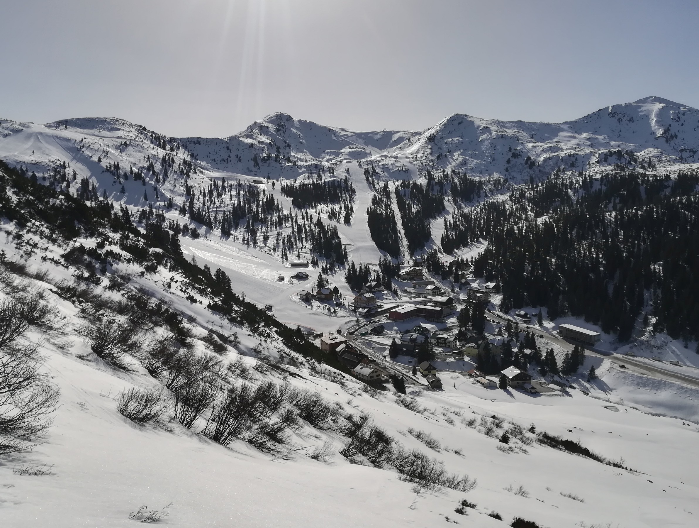 Es ist ca. 10 Uhr 15, wir haben das erschlossene Schigebiet bereits verlassen und blicken zurück auf zwar in Betrieb befindliche, aber durch Lockdown und Wochentag (Freitag) praktisch leere Lifte.