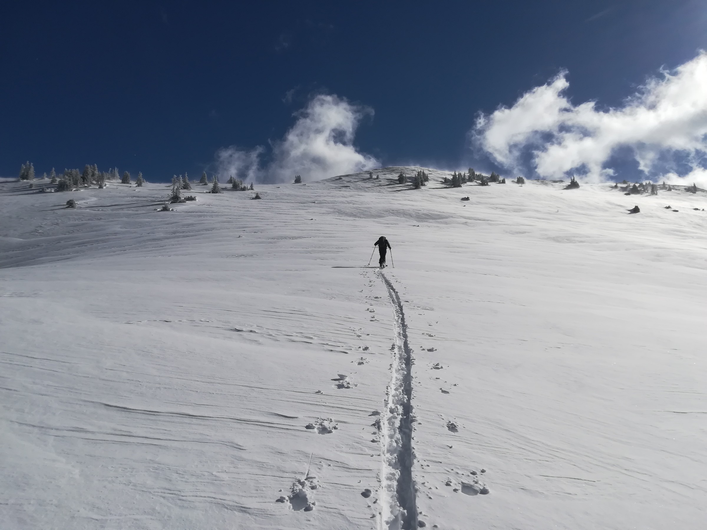 Daraufhin machte ich noch während meines Studiums einige vom Universitätssportinstitut veranstaltete Tourenkurse und betrieb diese Sportart lange Jahre als gelegentliche Ergänzung zum normalen Schifahren auf Pisten bzw. zum Variantenfahren. Hierbei bewährte sich stets die Philosophie von „Ski-Plus“, nämlich die Verwendung von Steigfellen zusätzlich zu Seilbahnen und Liften, um noch ein paar zusätzliche Höhenmeter oder Traversierungen in andere Geländekammern zu machen und so dem Freerider-Stress in Pistennähe zu entkommen. Allerdings hat die Zahl der Powder-Enthusiasten in den letzten Jahrzehnten so sehr zugenommen, dass Tiefschneefahren unter Verwendung von Aufstiegshilfen an „Idealtagen“ mittlerweile auch in kleineren Schigebieten zu einer extrem stressigen Angelegenheit geworden ist.