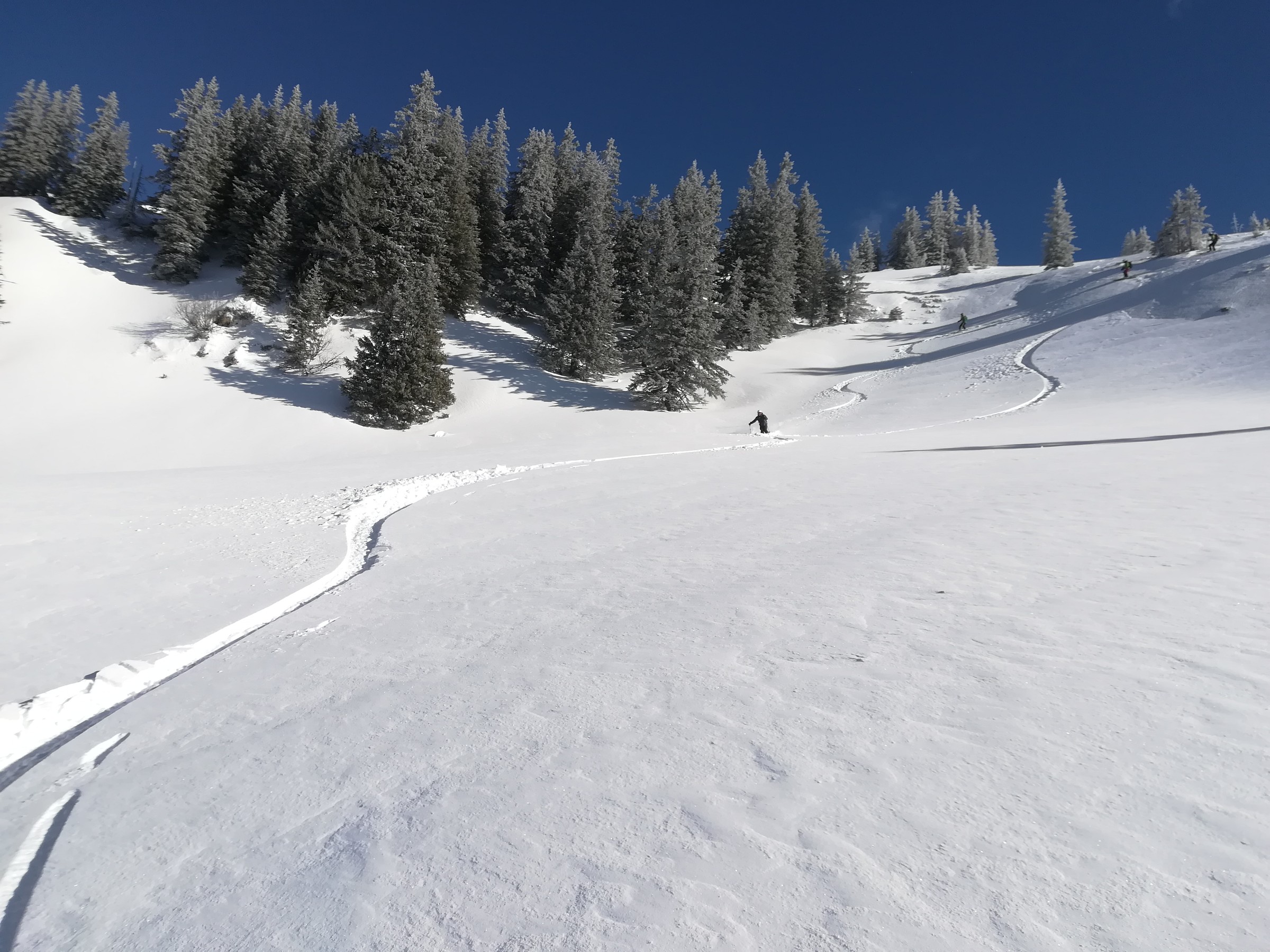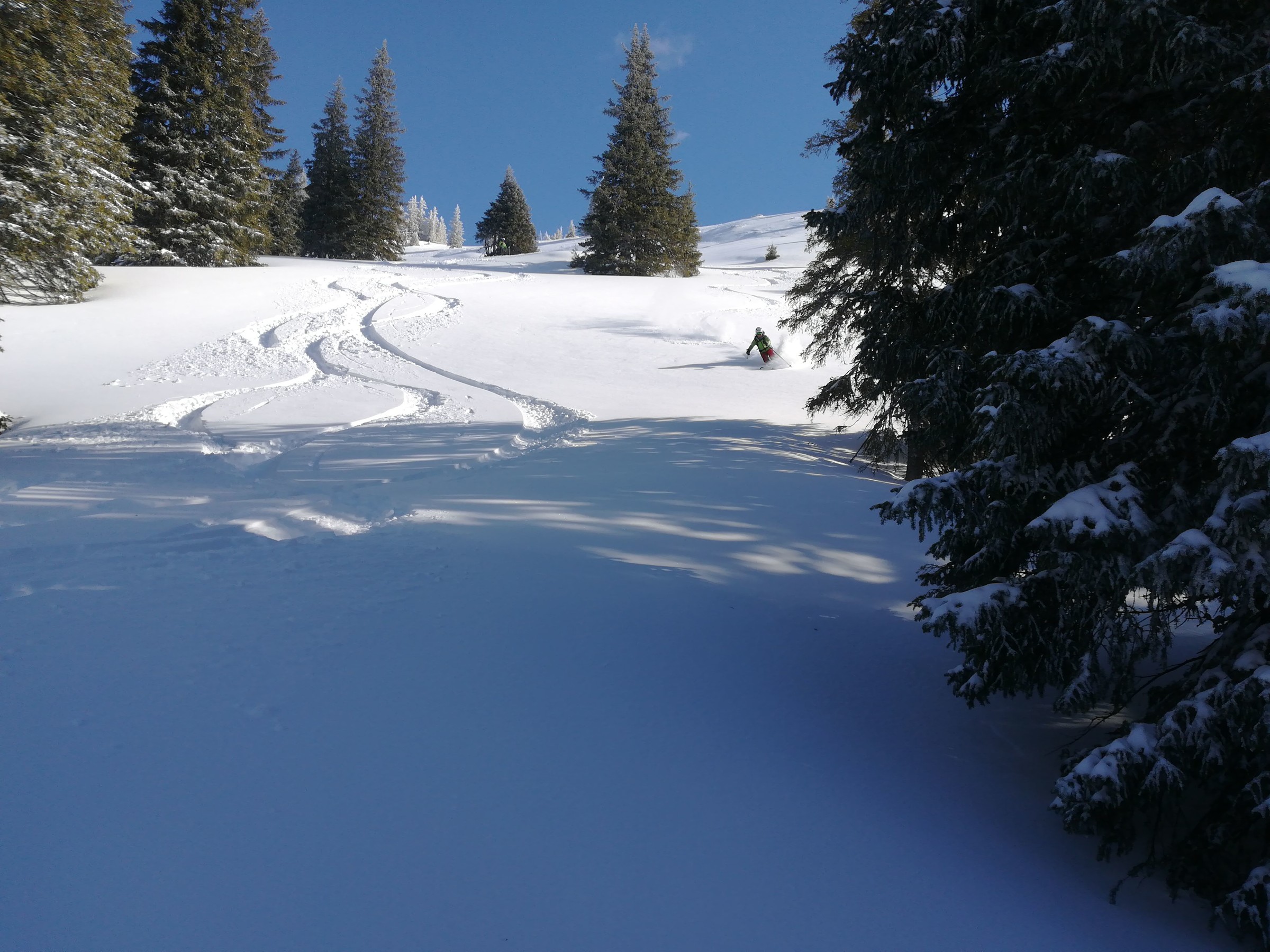 Was nun die kommenden Minuten betrifft könnte ich ja behaupten, Helmut hätte mit seiner Vermutung einfach nur Glück gehabt, aber in Wirklichkeit hat es uns wieder gezeigt, wie sehr wir immer wieder von seiner alpinistischen Expertise profitieren. Die Abfahrt ist nämlich nicht nur „brauchbar“ oder „gut“, nein, sie ist schlicht und einfach perfekt: kein Wind mehr, dafür traumhafter Powder auf ideal geneigten Hängen in lockerem Waldgebiet.