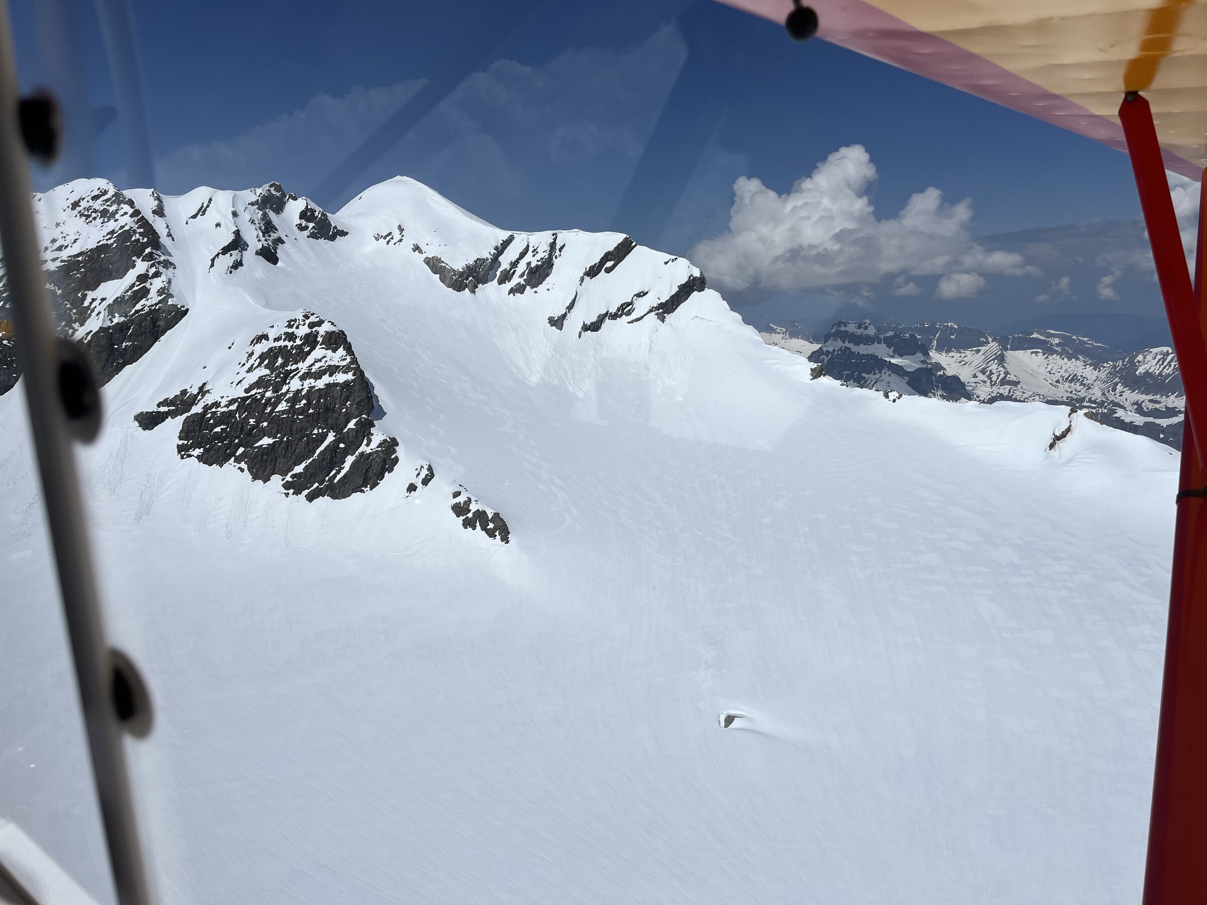 So trafen wir uns um 7 Uhr in Kägiswil, verstauten das viele Material und ich durfte ungewöhnlich hinten als Passagier Platz nehmen, bevor mein Kollege das zweite Paar Ski neben mir aufhängte. Nach rund 20 Minuten Flug waren wir froh, eine landbare Stelle auf dem Hüfifirn gefunden zu haben, die uns den geplanten Aufstieg zum Clariden (3267m) ermöglichte. Eigentlich wollten wir noch etwas näher landen, aber da war die Oberfläche zu rauh und mit zu vielen Wasserrillen durchsetzt. Der Schnee ist noch sehr hart um diese Tageszeit. Flieger fixieren, alles vorbereiten, und los geht es um 8.30 Uhr: Ein Blick zurück: Die knapp 350 Höhenmeter sind zwar nicht viel, aber doch ziemlich steil: Ich freue mich auf die Abfahrt. Die Oberfläche ist wunderbar leicht angesulzt. Geschafft nach knapp 90min! Irrsinnig diese Aussicht. Man wähnt sich wie auf dem Mount Everest