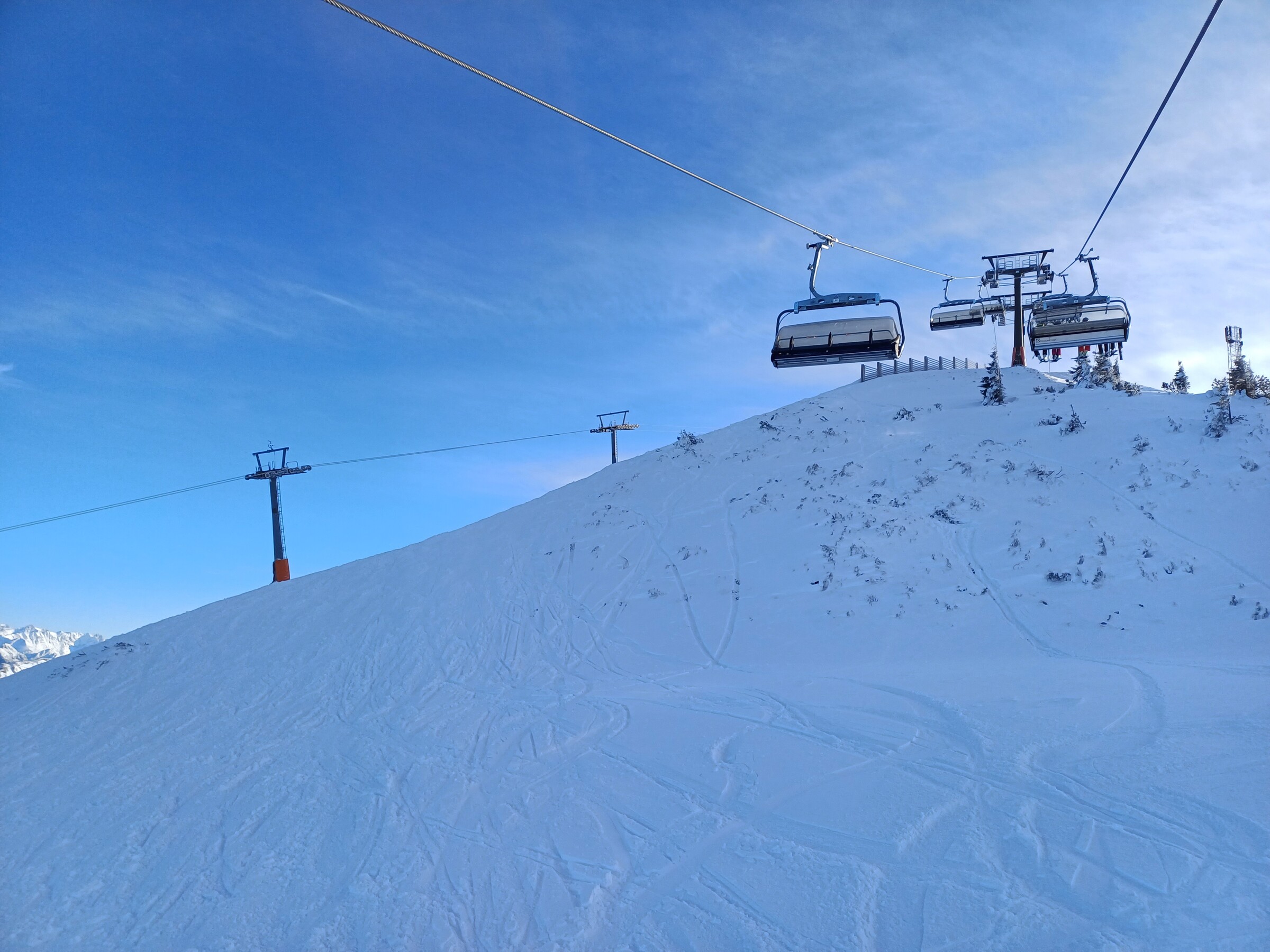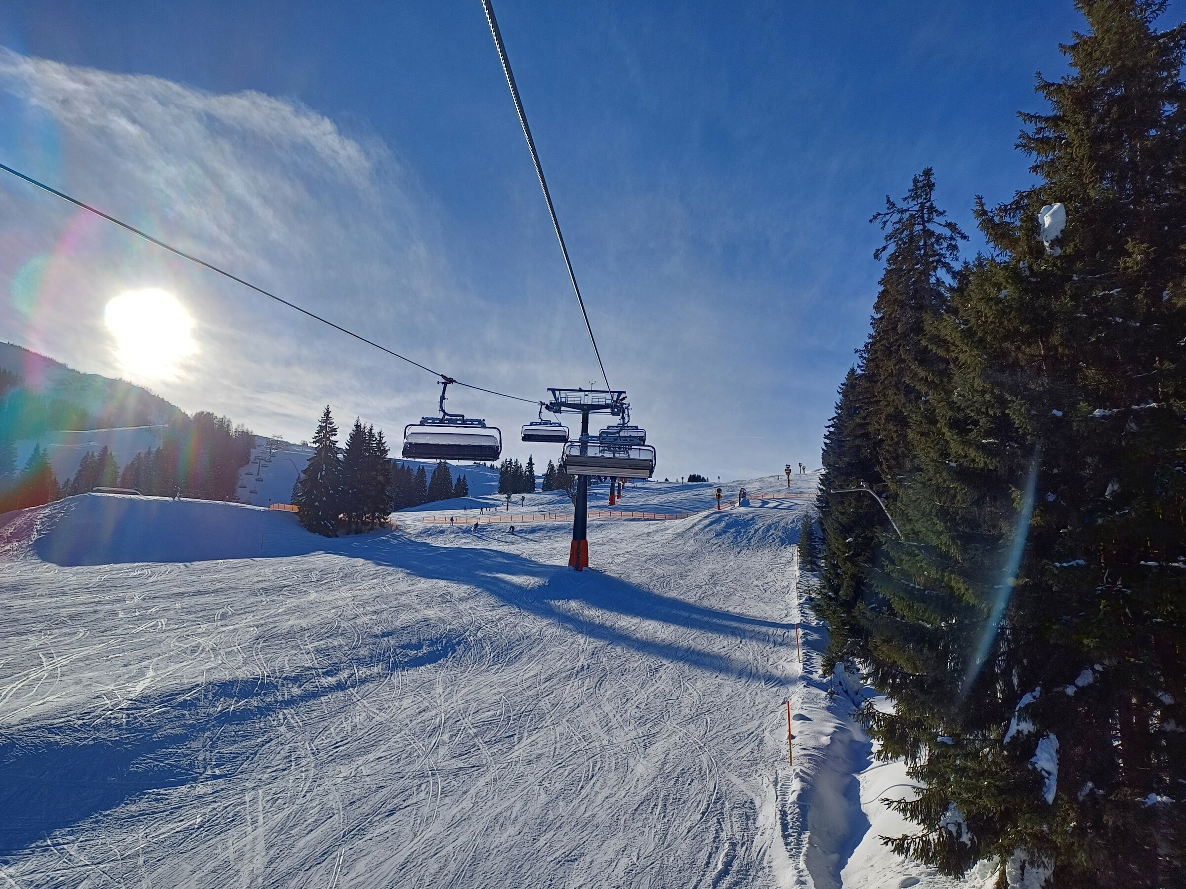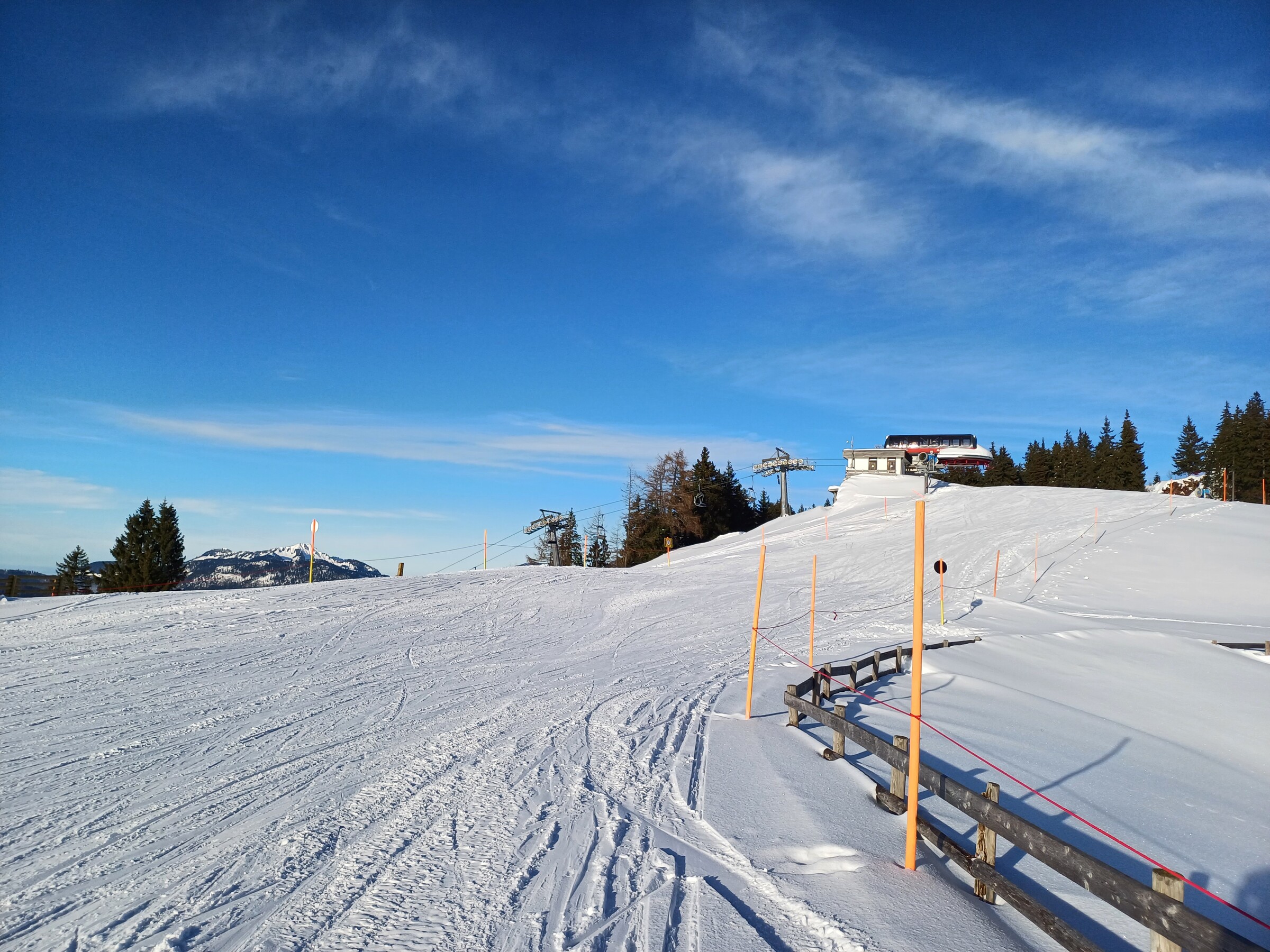 Wetter war sonnig und Temperaturen waren eher leicht im Plusbereich, im Schatten kälter. Pistenzustand so naja, ab Mittag bereits sehr zerbombt, wie es in der Früh war, kann ich nicht sagen. Eine Mischung aus Papp- und Pulverschnee auf harter Unterlage und sehr unruhig zu fahren wahrscheinlich aufgrund der Wetterlage. Auf der sehr flachen Winklmoosalm waren tatsächlich Absätze zwischen den Raupenspuren.