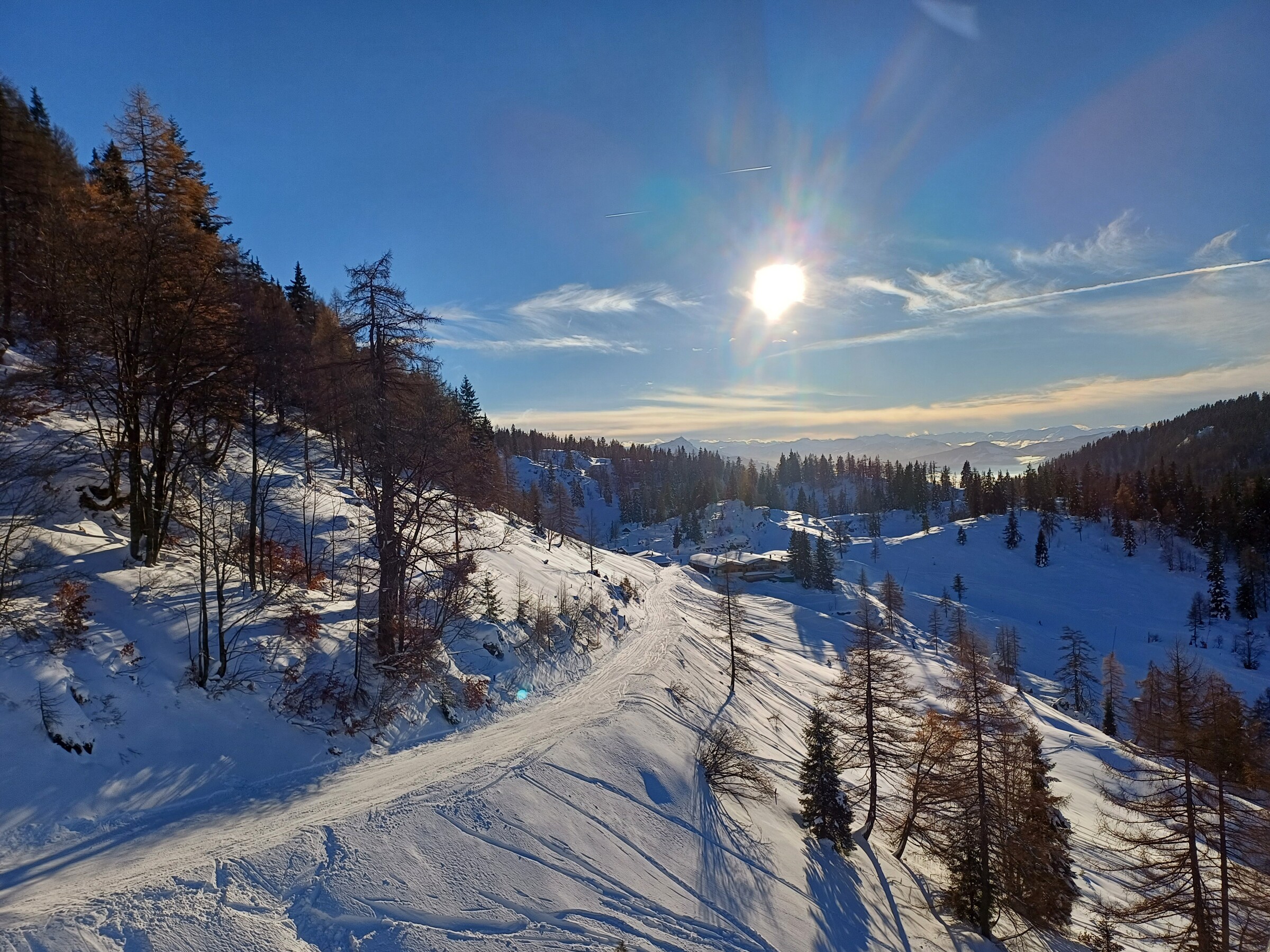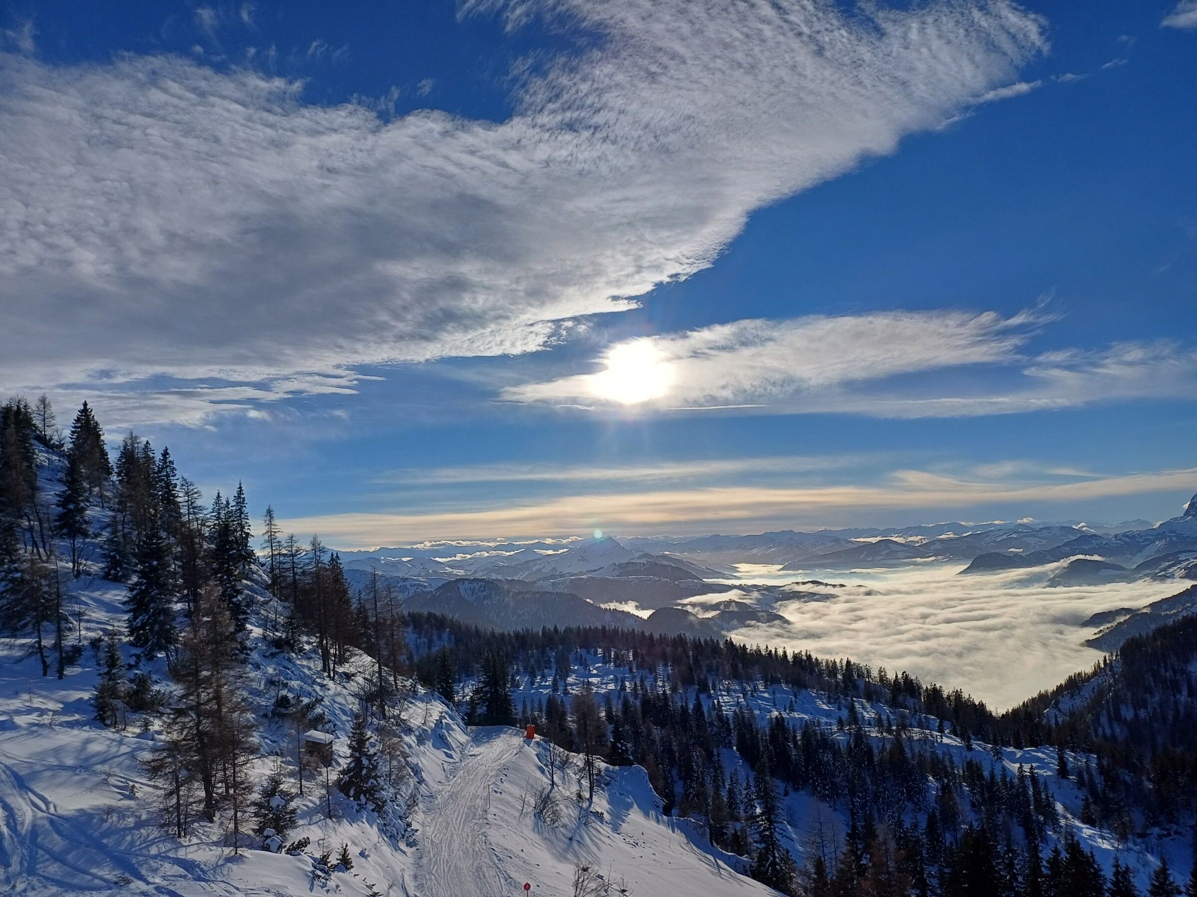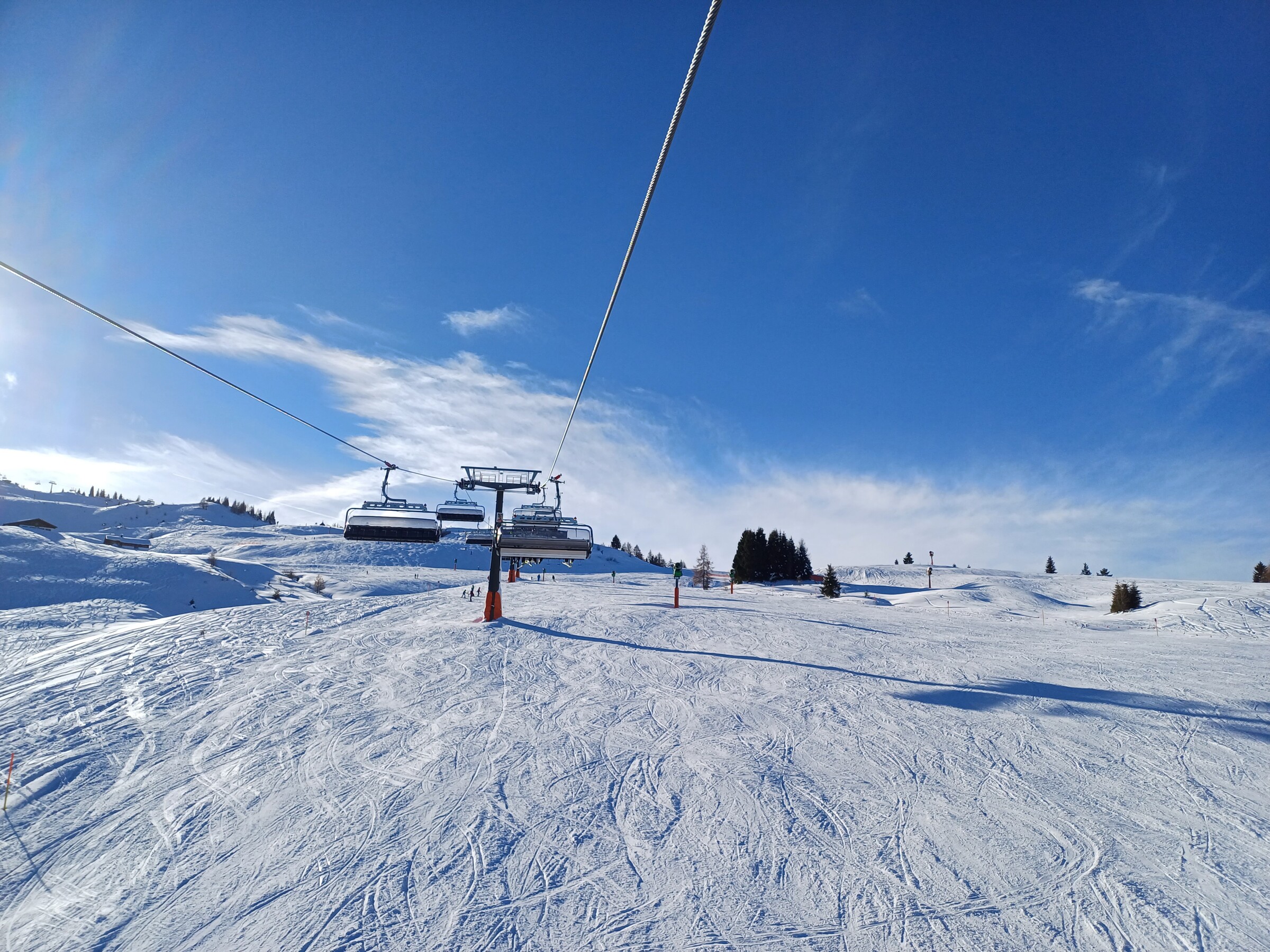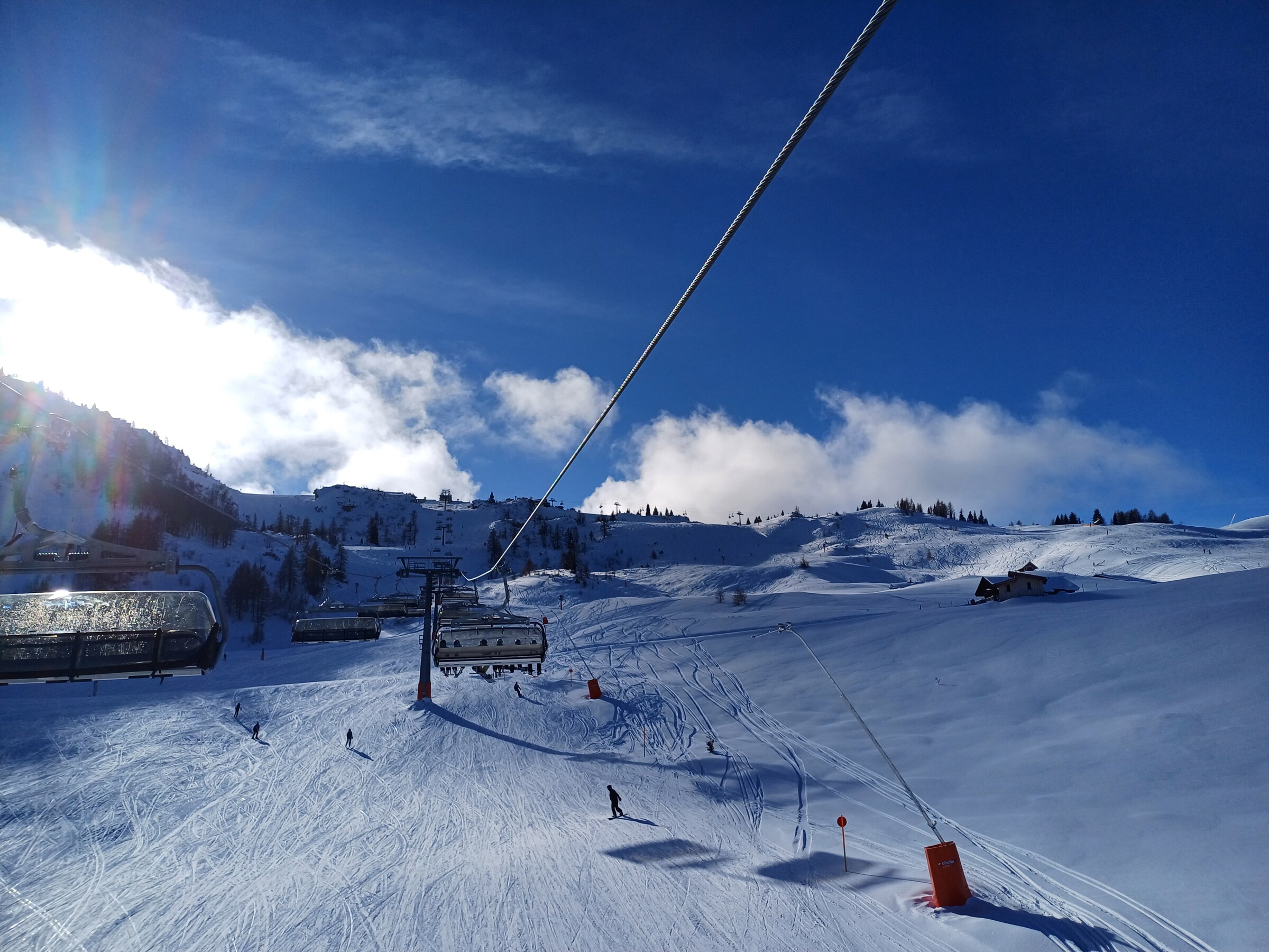 Wetter war sonnig und Temperaturen waren eher leicht im Plusbereich, im Schatten kälter. Pistenzustand so naja, ab Mittag bereits sehr zerbombt, wie es in der Früh war, kann ich nicht sagen. Eine Mischung aus Papp- und Pulverschnee auf harter Unterlage und sehr unruhig zu fahren wahrscheinlich aufgrund der Wetterlage. Auf der sehr flachen Winklmoosalm waren tatsächlich Absätze zwischen den Raupenspuren.
