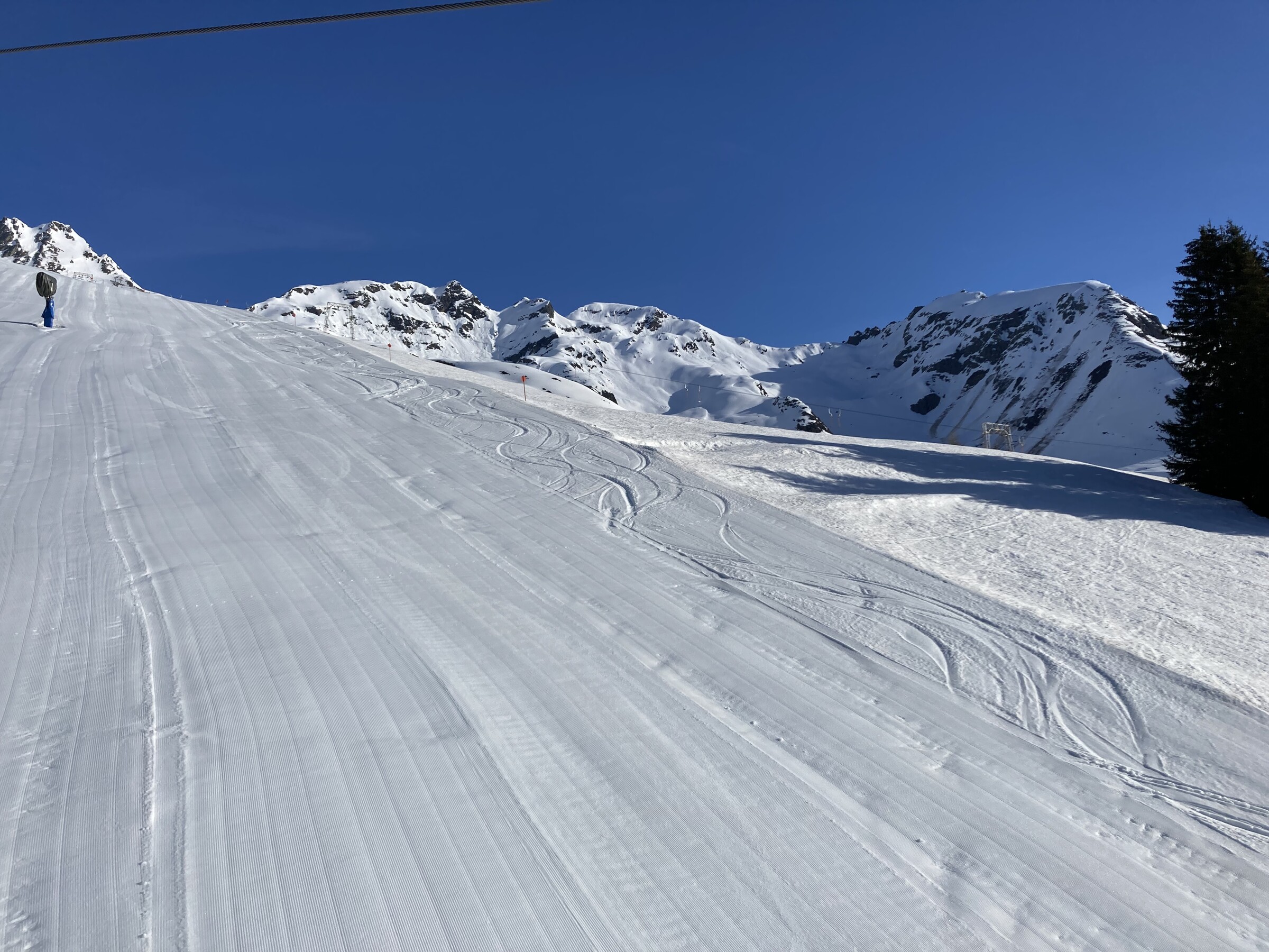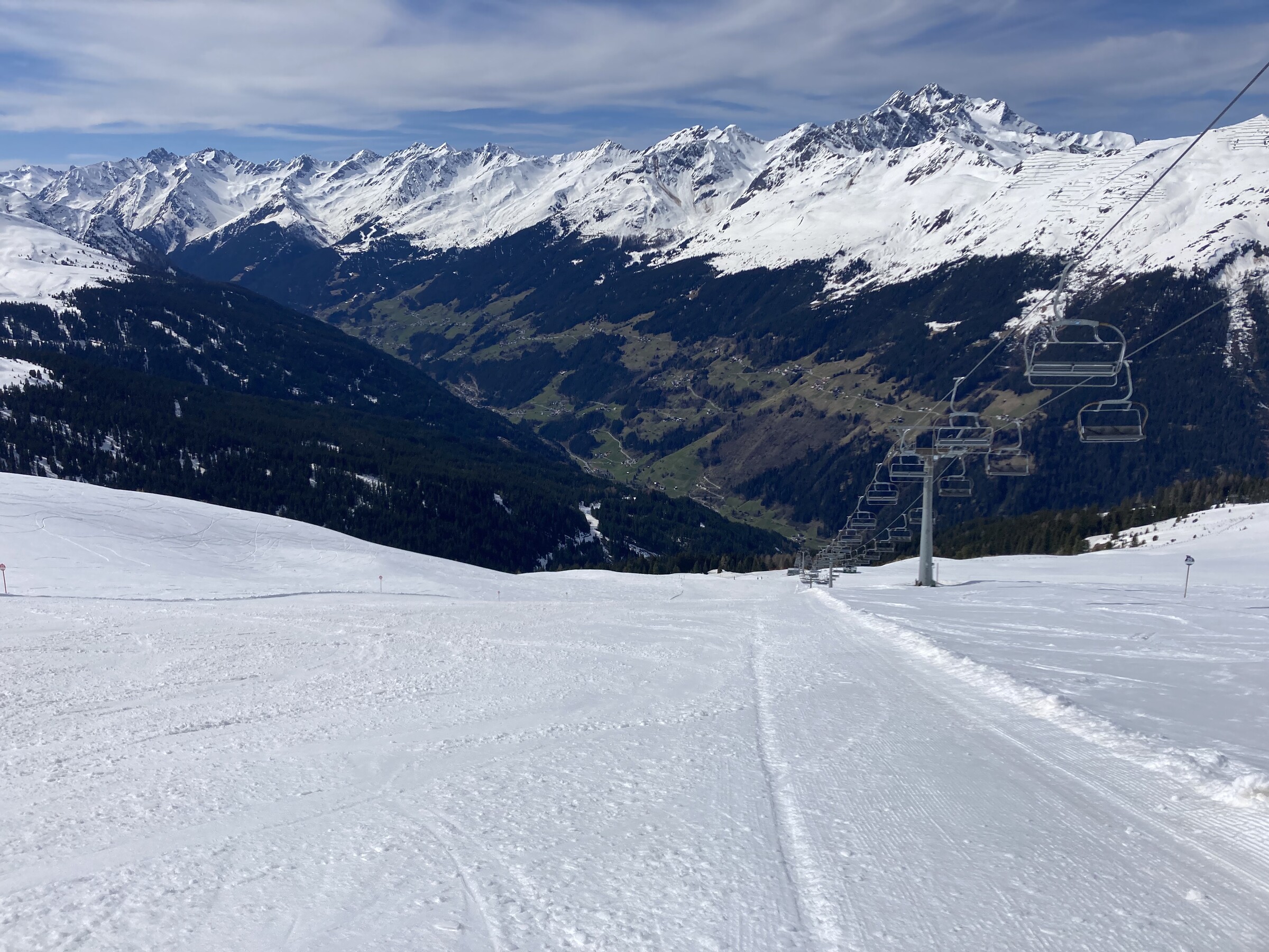 In Kappl war es nochmals leerer als am Vortag und damit ziemlich ausgestorben. In See dafür etwas voller und schlechter, die Pisten schon leicht zerfahren während es in Kappl mittags noch Feinripp hatte. Diesmal der Fokus hier mehr auf den Pisten, die bis mindestens halb 1 super hielten.