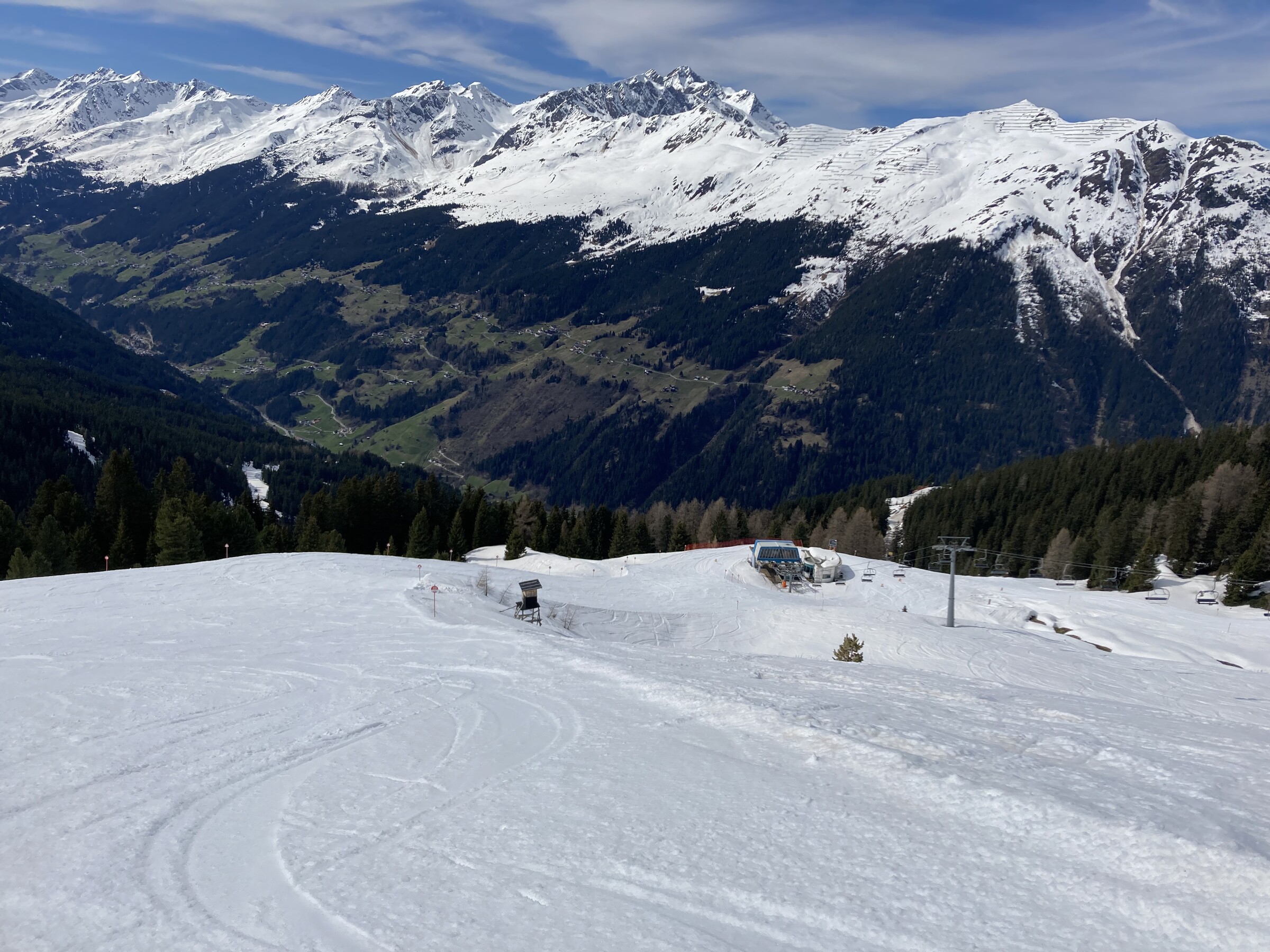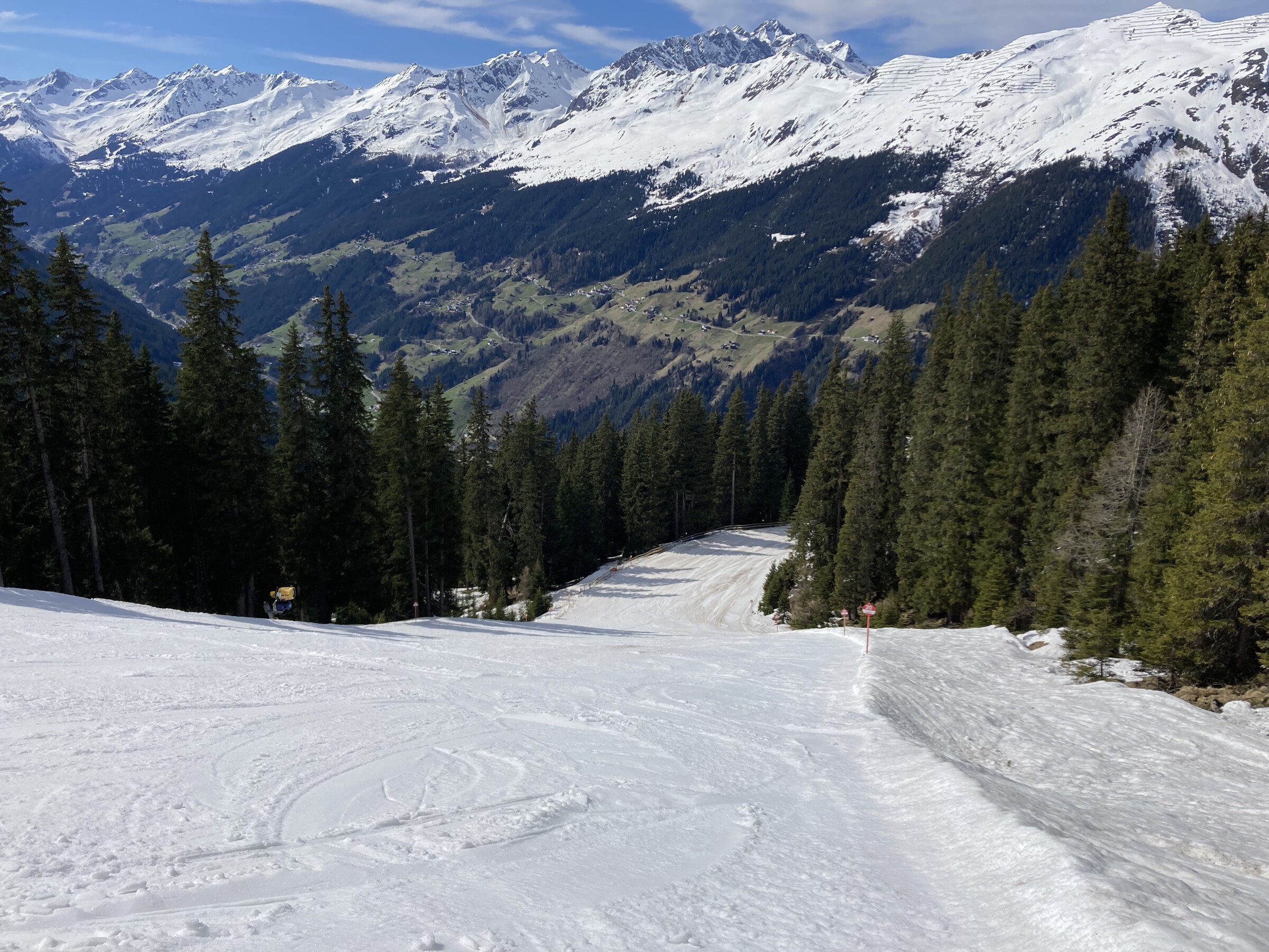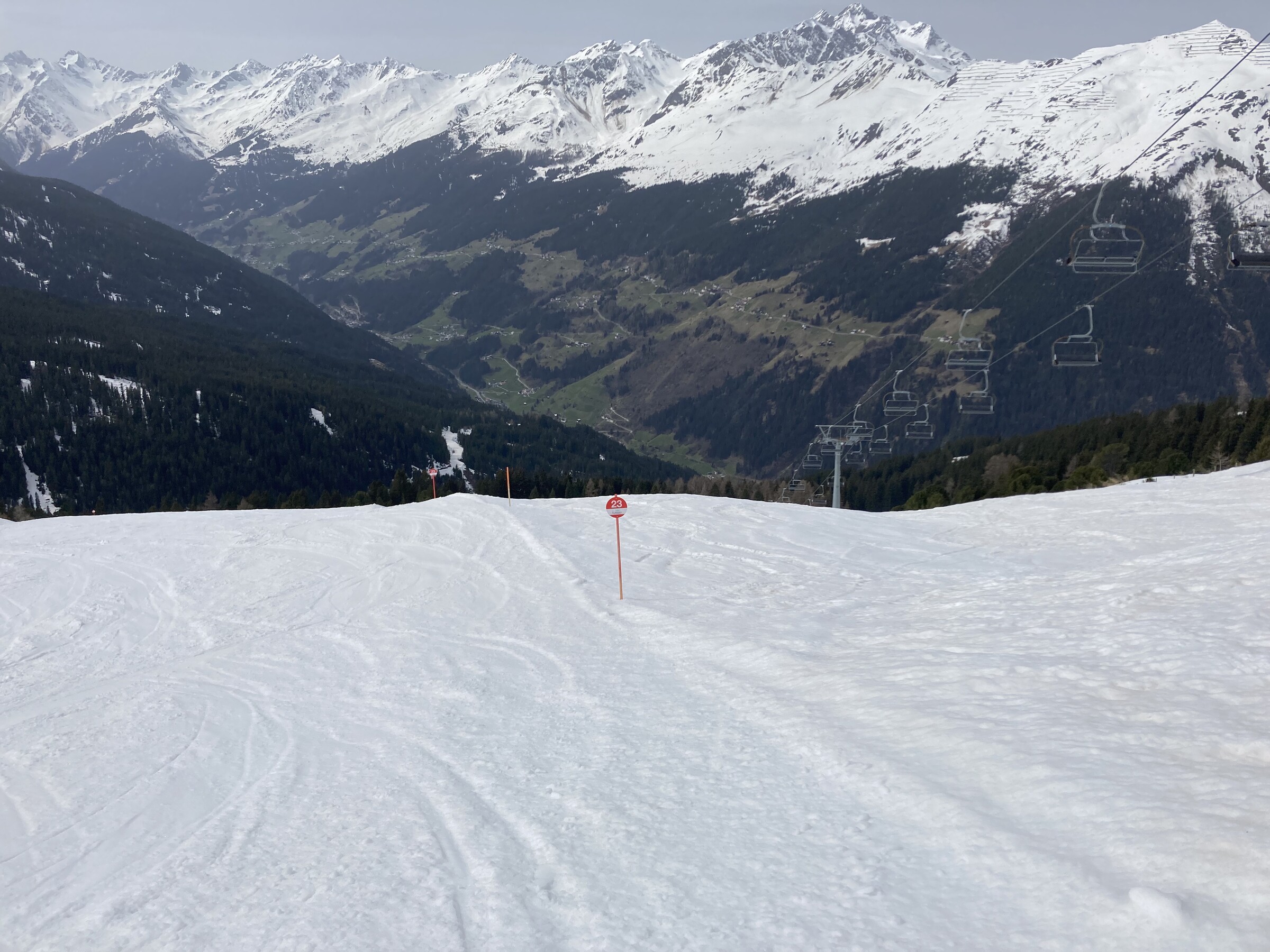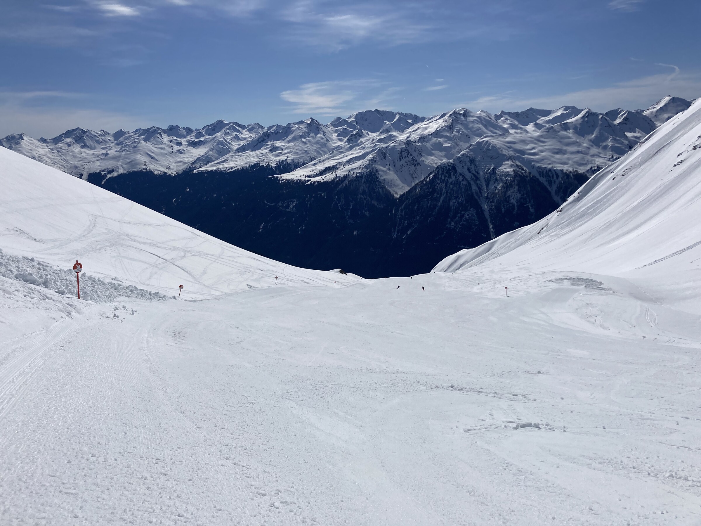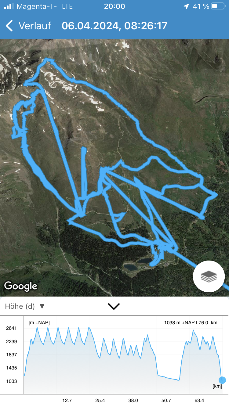 - Der gemeinsame Skipass macht an sich schon Sinn. Im Frühjahr bei diesen Bedingungen erfordert es aber hohe Disziplin, da der Wechsel „Hang zu Hang“ locker 45 Minuten dauert und man damit einen Teil des Firnfensters opfern muss - also auf der Südseite gehen, wenn es am besten ist und hoffen, dass man trotzdem nicht zu spät auf der Westseite ist. Das habe ich an beiden Tagen nicht wirklich geschafft bzw. geht das Auffirnen bei diesen Bedingungen dann auch zu schnell. Aber generell bei ‚normaleren‘ Frühjahrsbedingungen schon eine gute Idee - auch wenn ich wohl kein wirklicher Fan der Pisten in See werde und das Gesagte für das (an sich interessante) Gelände nochmals strenger gilt.
