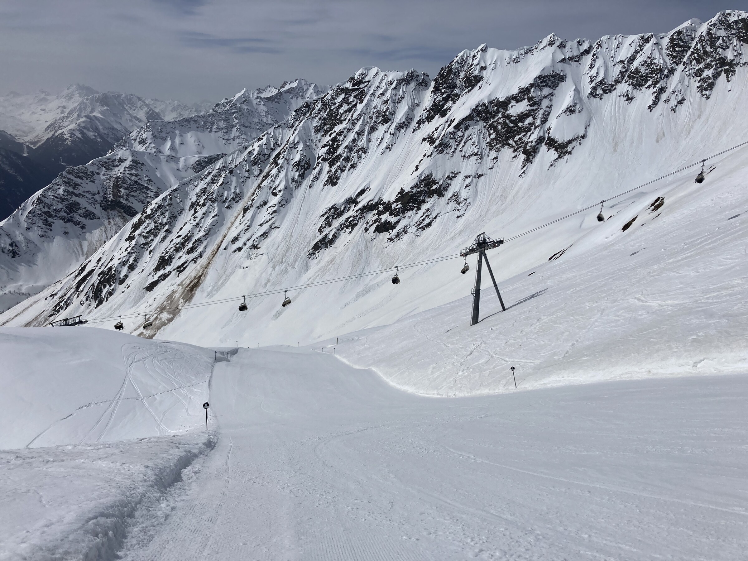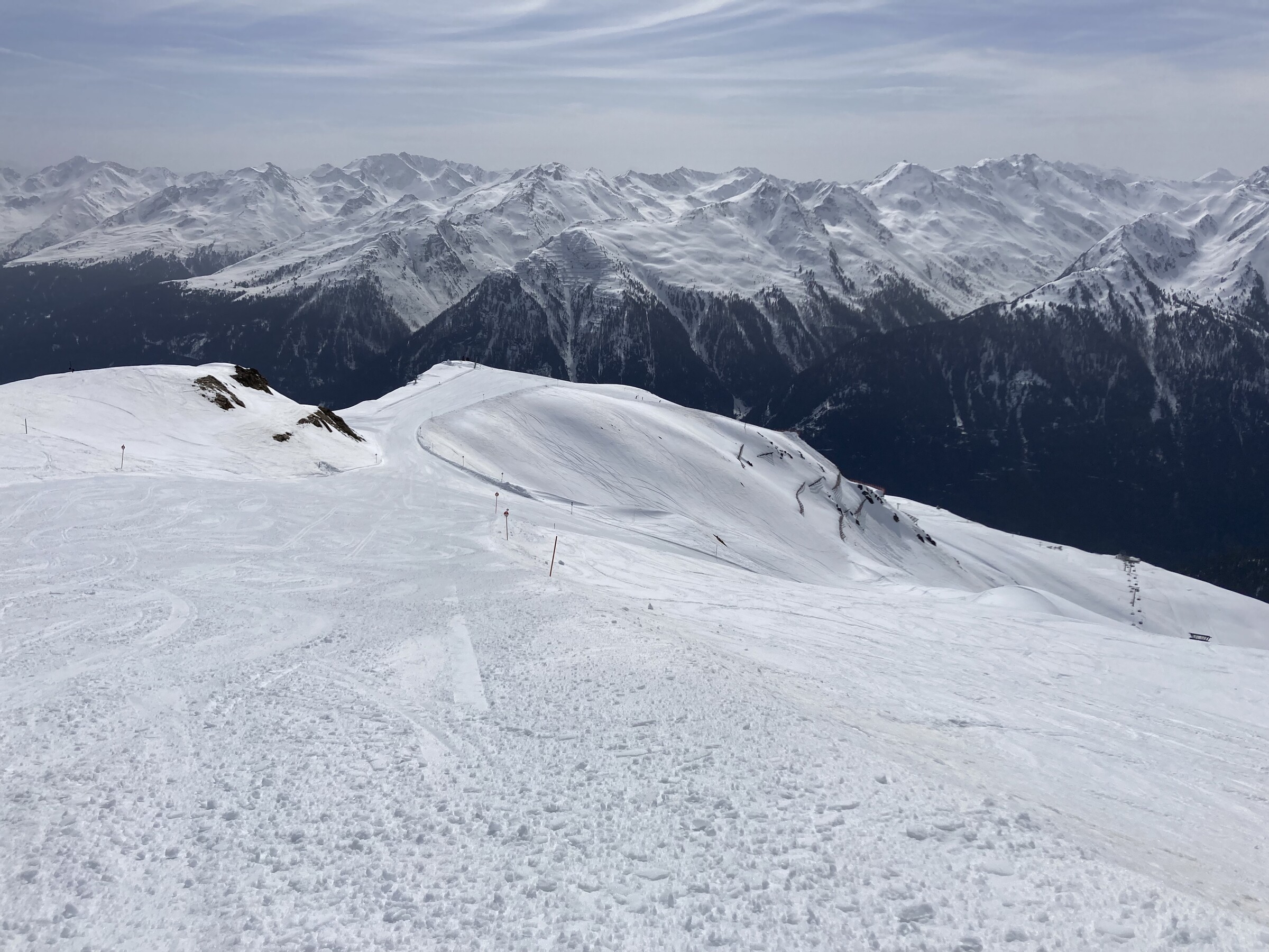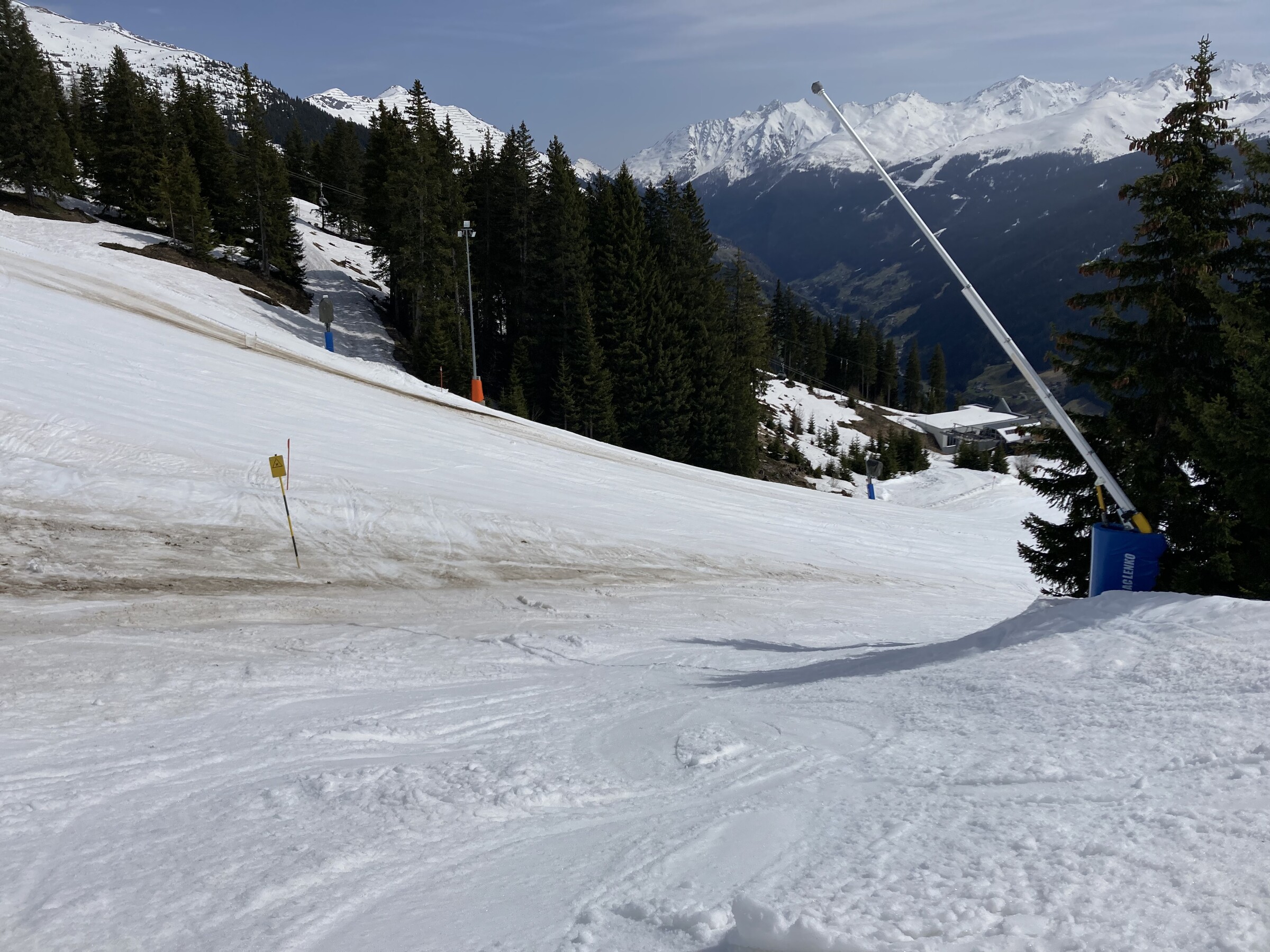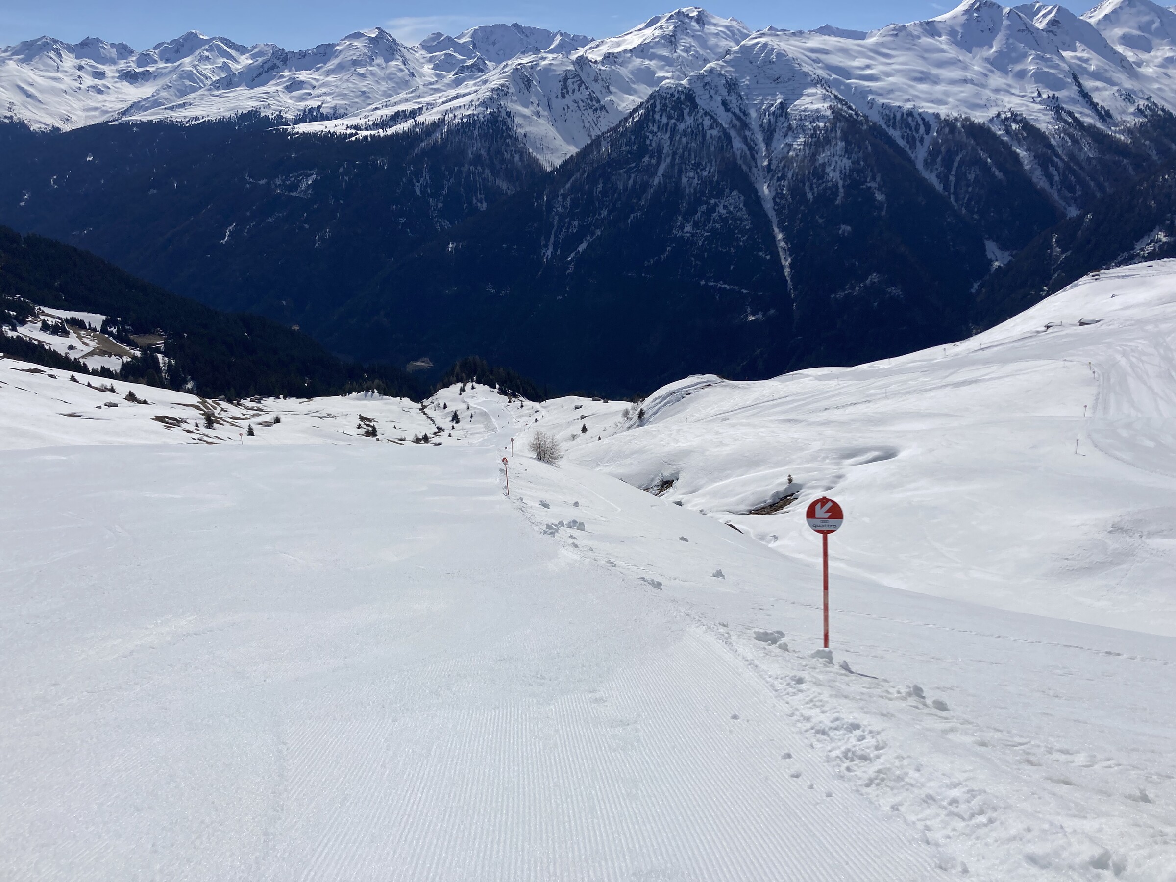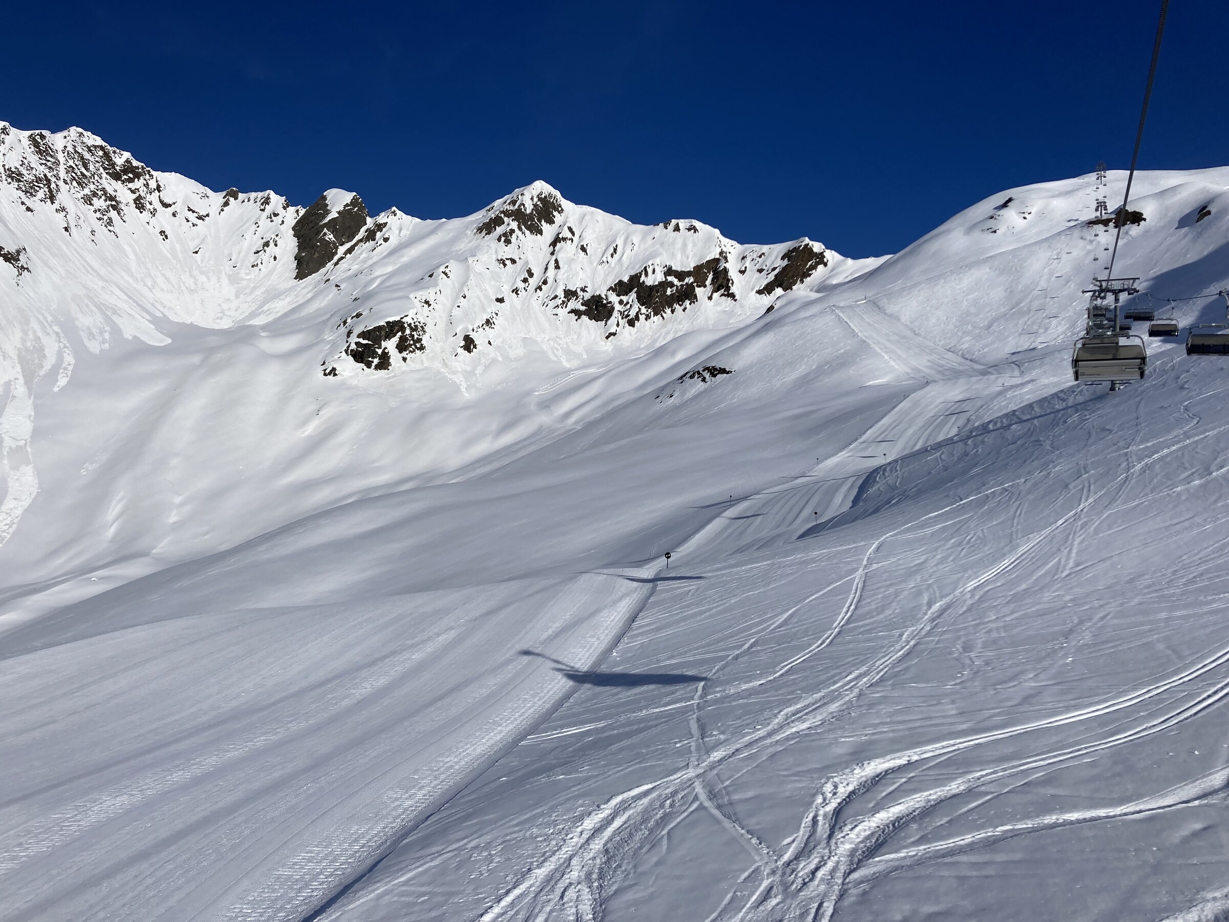 - Der gemeinsame Skipass macht an sich schon Sinn. Im Frühjahr bei diesen Bedingungen erfordert es aber hohe Disziplin, da der Wechsel „Hang zu Hang“ locker 45 Minuten dauert und man damit einen Teil des Firnfensters opfern muss - also auf der Südseite gehen, wenn es am besten ist und hoffen, dass man trotzdem nicht zu spät auf der Westseite ist. Das habe ich an beiden Tagen nicht wirklich geschafft bzw. geht das Auffirnen bei diesen Bedingungen dann auch zu schnell. Aber generell bei ‚normaleren‘ Frühjahrsbedingungen schon eine gute Idee - auch wenn ich wohl kein wirklicher Fan der Pisten in See werde und das Gesagte für das (an sich interessante) Gelände nochmals strenger gilt.
