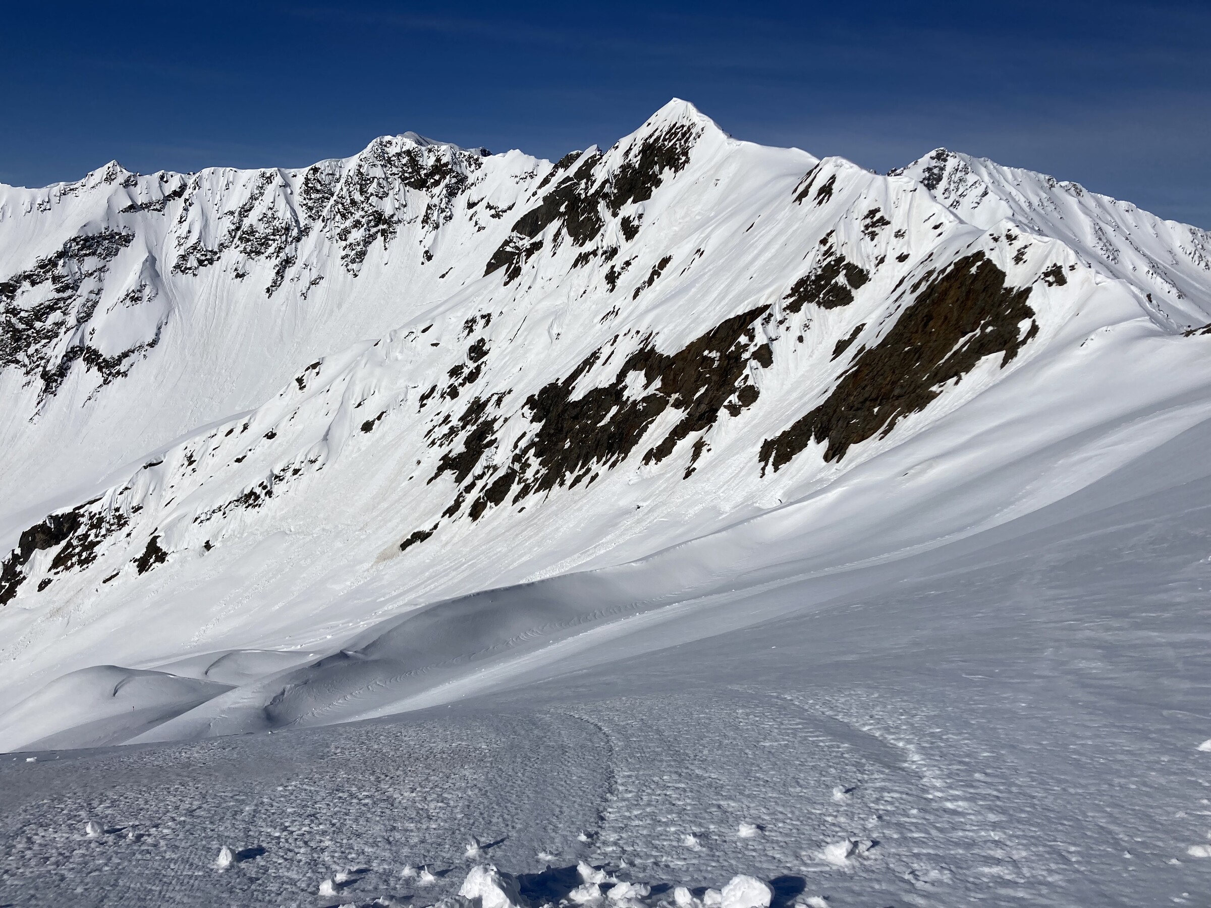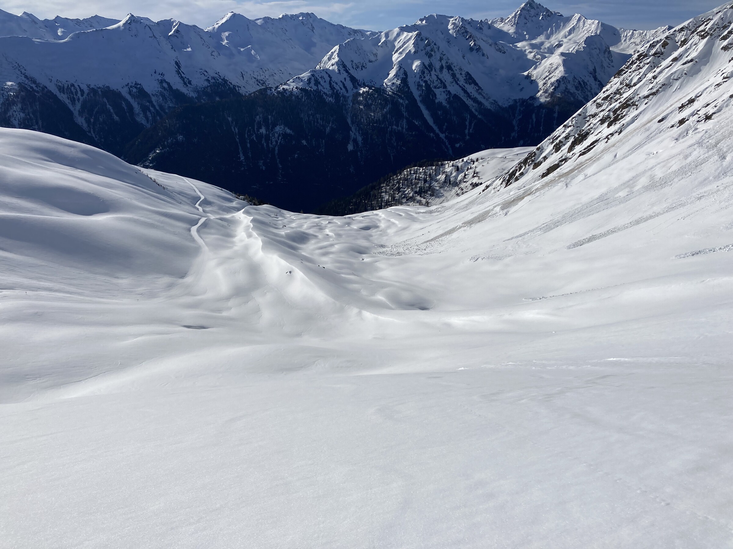 (9) Tolle Szenerie hier aber auf jeden Fall. Der optische Eindruck der Firnschwünge täuscht etwas, man musste hier schon mit Gefühl fahren um nicht einzubrechen