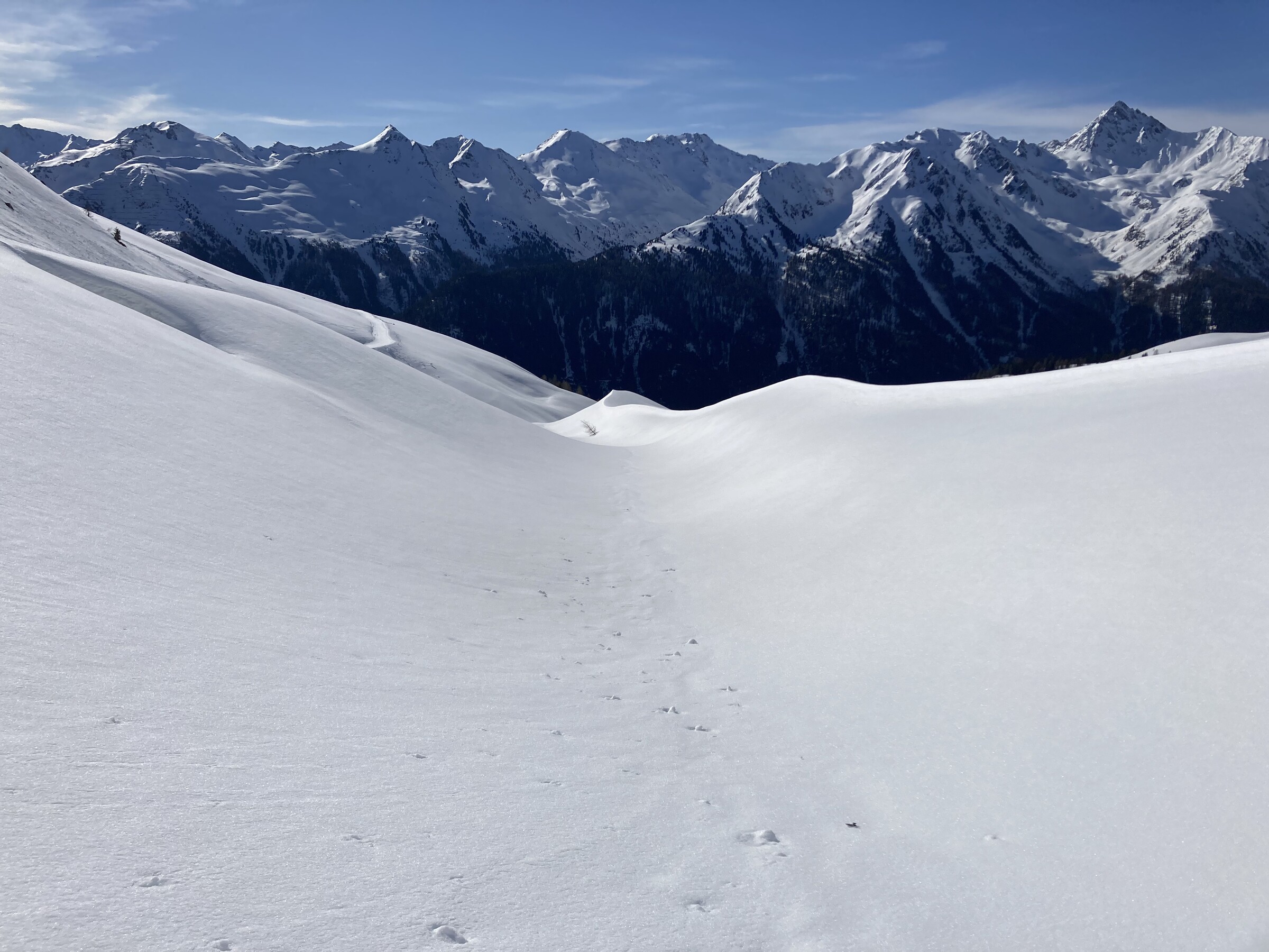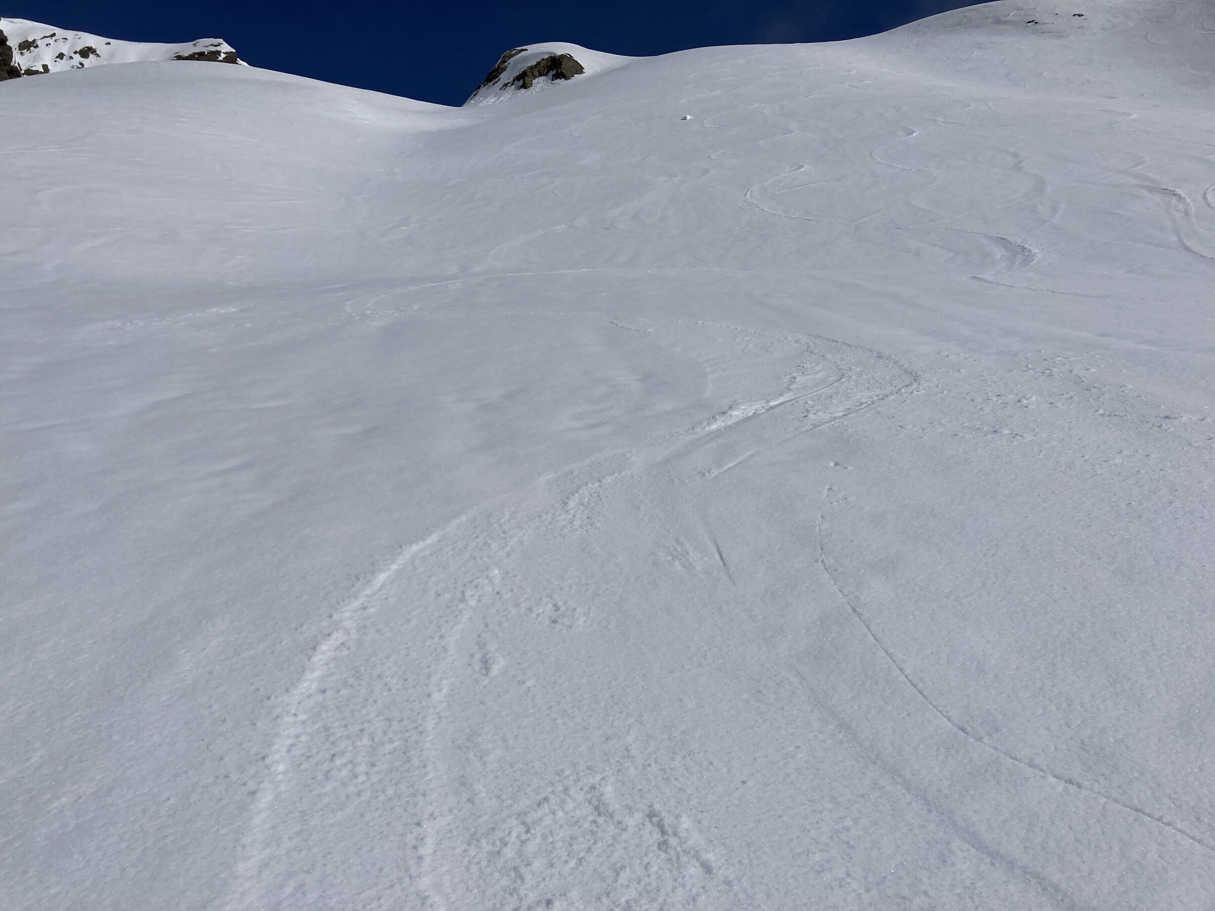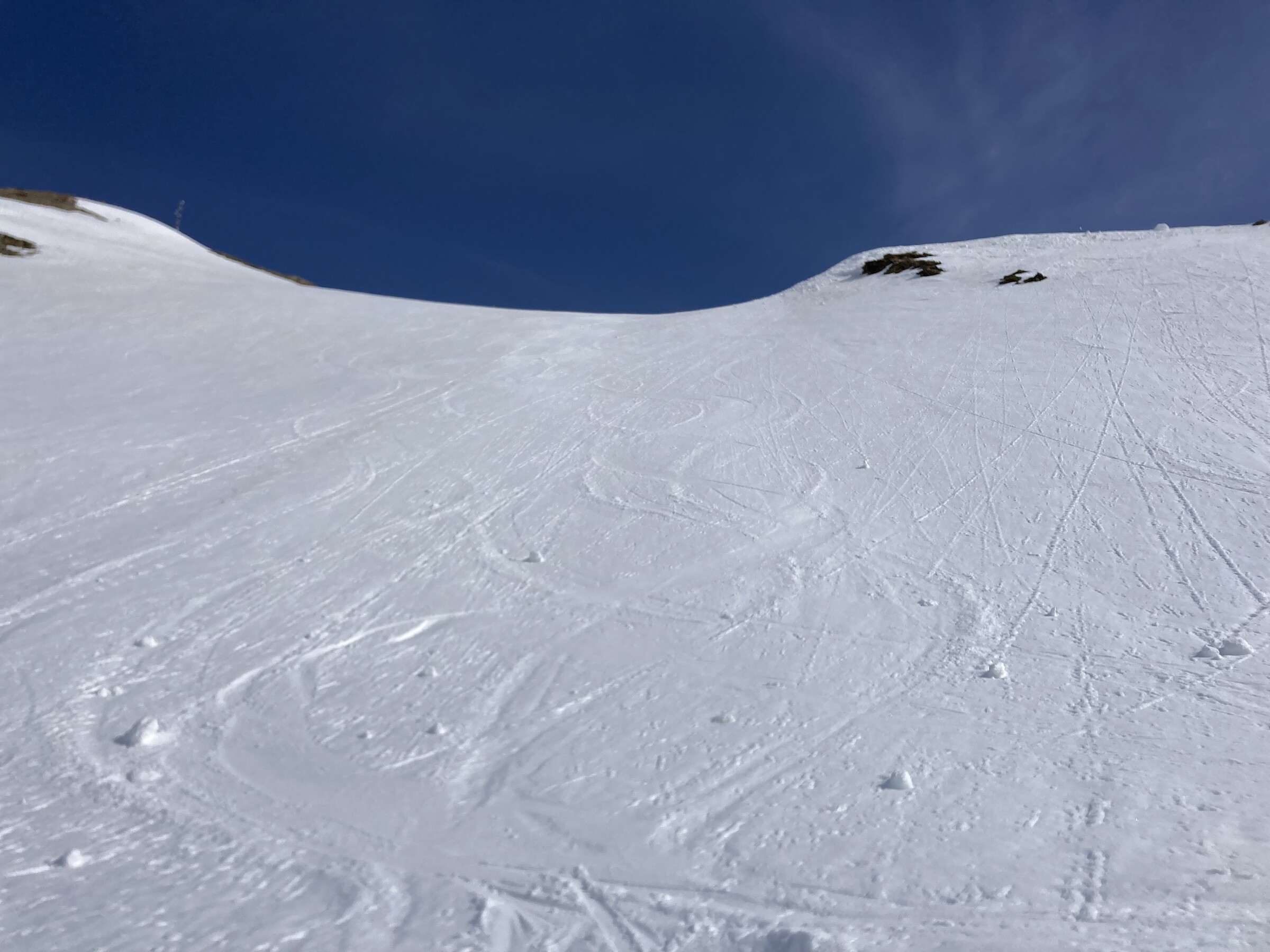 Mit gewissen Einschränkungen ging auch das Gelände. Dies hauptsächlich SW-seitig, wo sich ein tragfähiger Harschdeckel bilden konnte. Dort blieb es auch relativ lange hart. S-seitig ging es gerade so. SO-seitig ging es nicht. Damit fuhr ich die ersten 1,5 std. (=5 Fahrten) in der Blankamulde, die meist SW bis S-seitig ausgerichtet ist. Hier kam auch die frühere Präparierung zugute.