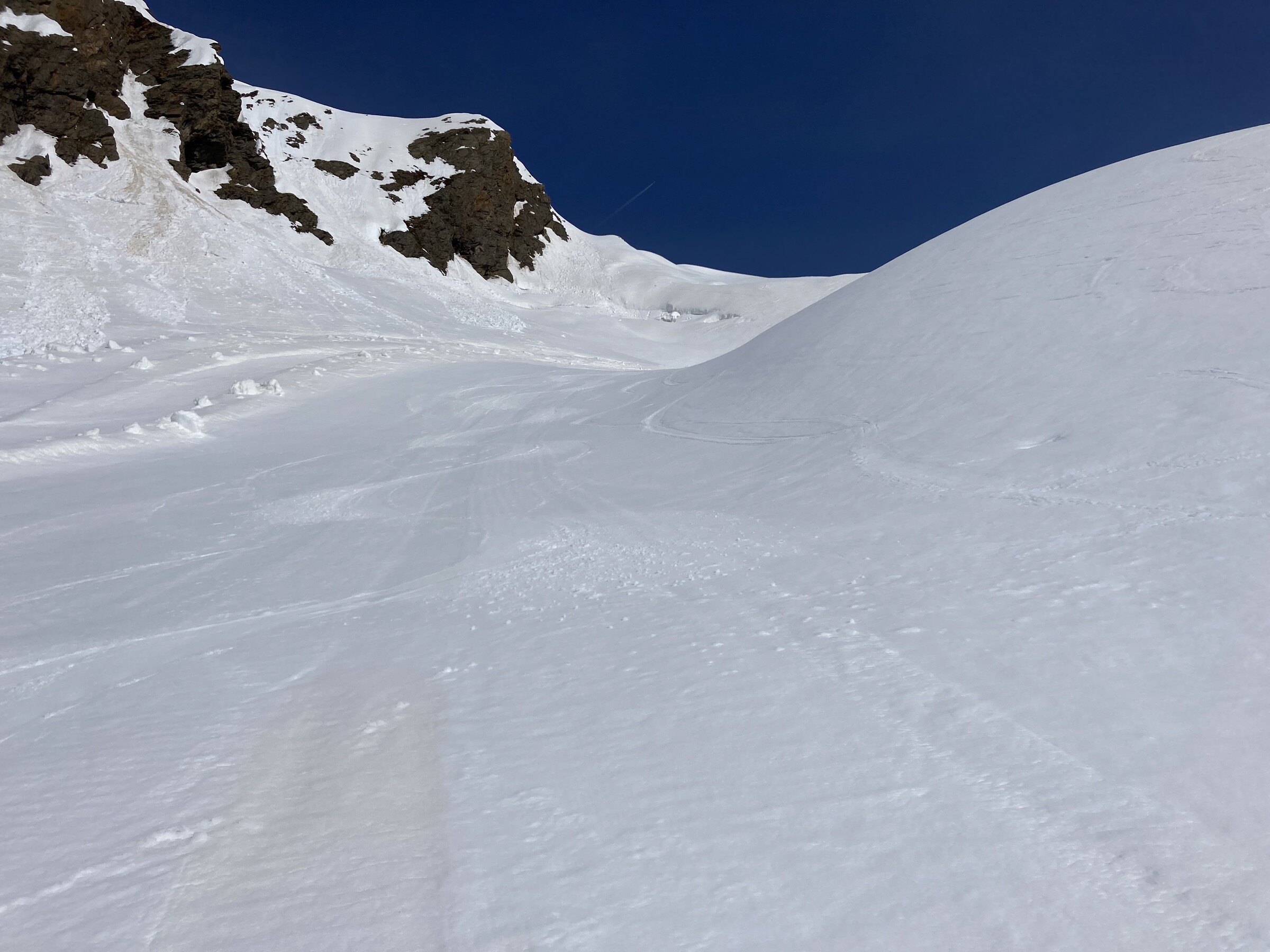 (2) Wiederum sind nur die SW-Hänge tragfähig und auch noch hart bzw. minimal aufgefirnt und damit ganz gut fahrbar. Später um 11 ist es dann schon zu weich bzw. damit auch gleich der Deckel weg.