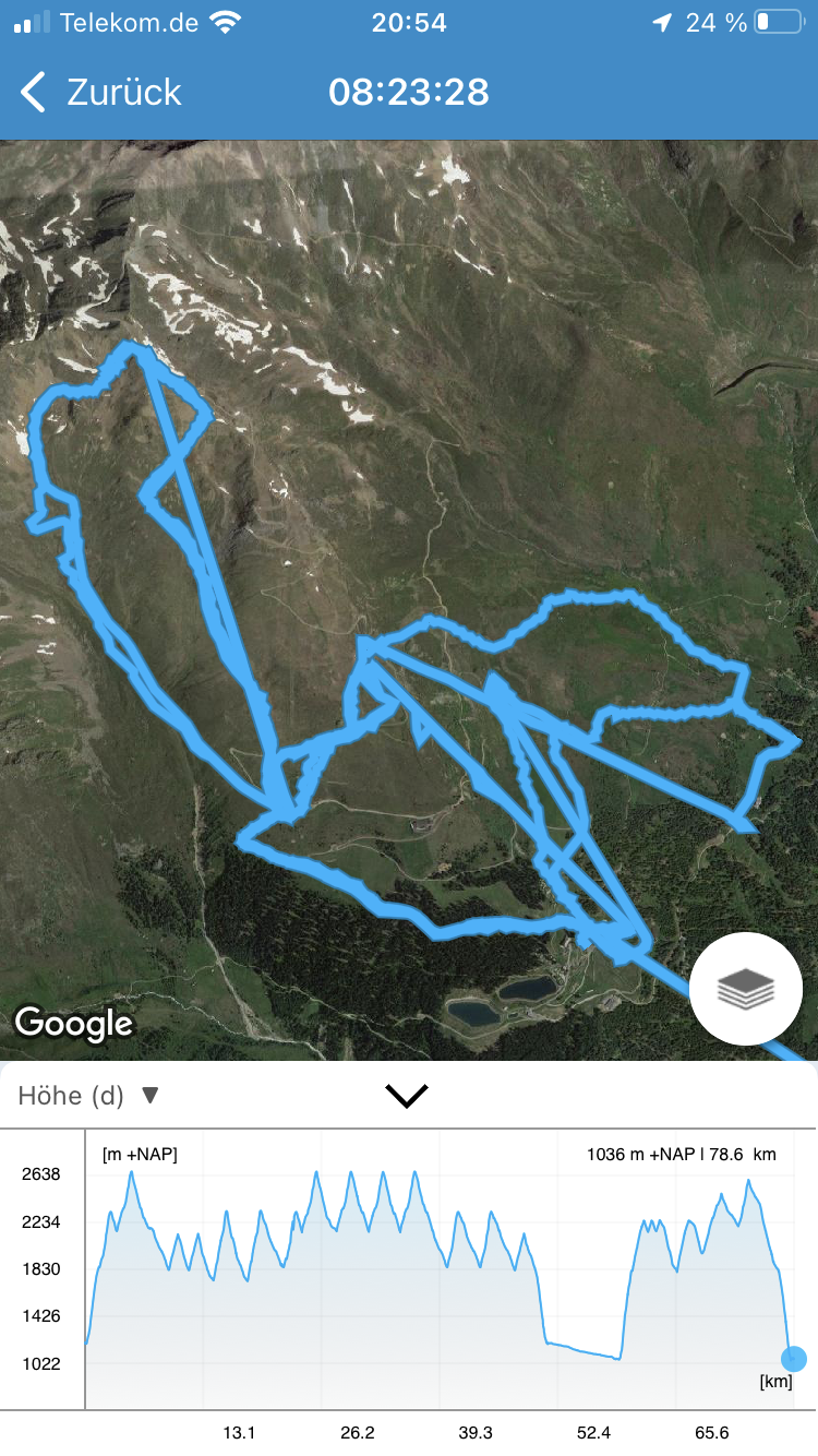 Da ich jetzt so oder so eine Pause brauchte ging es eben wieder nach See, wo es wie gesagt etwas schlechter und öfter bremsig und leicht zerfahren war im Vergleich zum Vortag. In windstillen Bereichen blieb man einfach stecken. Vielleicht hätte man nach einer Mittagspause sogar in Kappl noch etwas weiterfahren können - Osthänge ziehen ja oft nach Mittag schon wieder etwas an. Aber sei‘s drum (21) Wieder unten im Hochsommer (22) Am Rossmoos 4SB der noch am vergleichsweise besten ging und stellenweise wieder ganz okay (23) Die neue Furglerblick (eigentlich eher: Stielkopfblick) EUB, über deren Nutzen man sicher steiten kann. So hat man eben für das typische und relevante Urlauberpublikum noch eine blaue Piste im Angebot (24) Nicht nur die Pisten sondern auch das Gelände war (deutlich) zerfahrener. Erstaunlich, wo doch Kappl als das Freerider-Gebiet gilt. (25) Ascher Hütte gegen Lechtaler (26) Nochmal die Piste am Stielkopfblick (27) Statistik (Kappl)