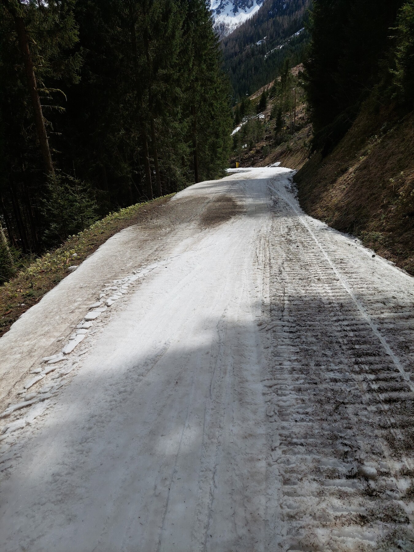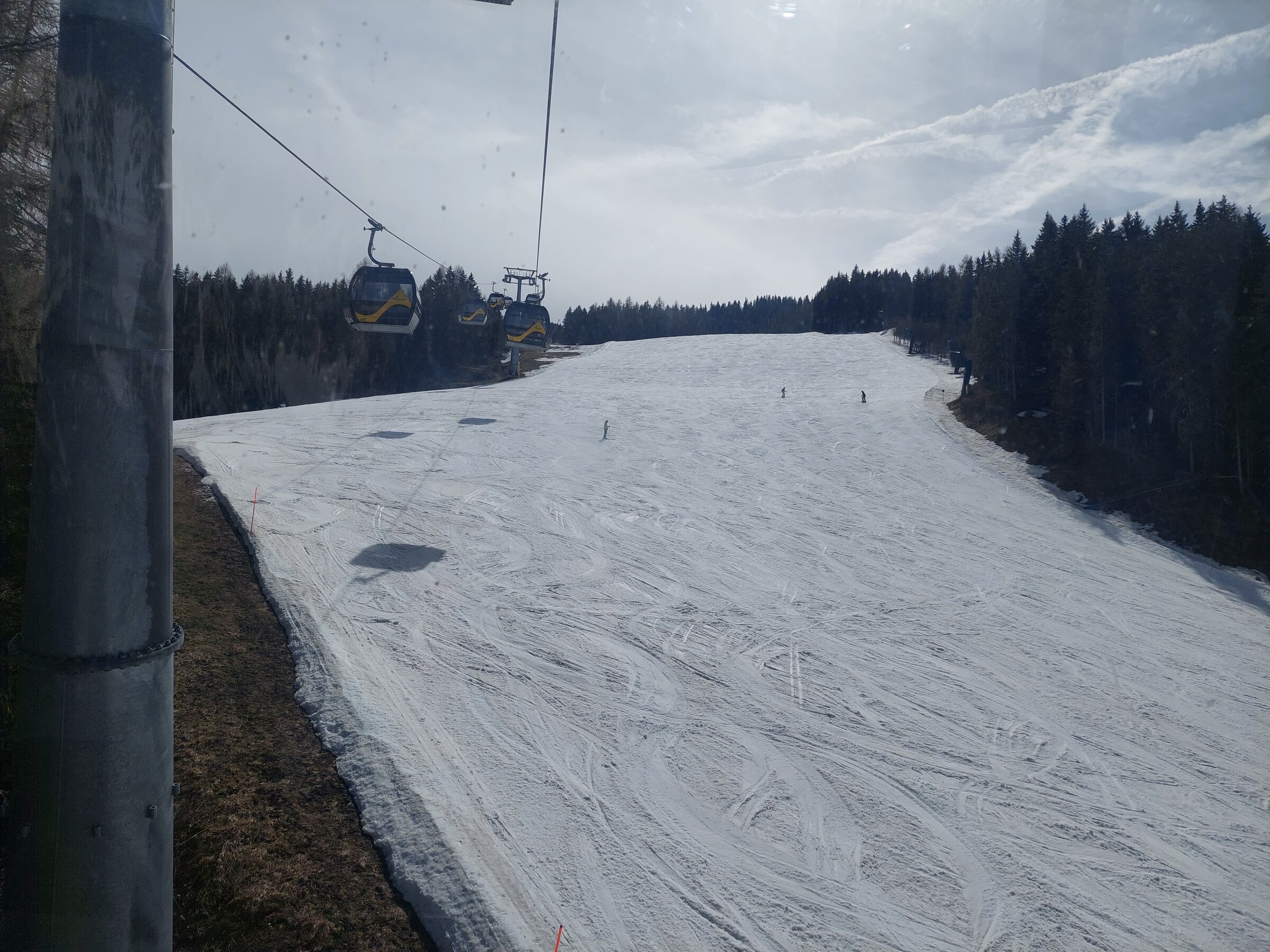 Die Pisten waren in der Früh schon oberflächlich weich, da es in der Nacht nicht gefroren hatte. In den ersten Stunden waren die Pisten sehr schön zu fahren, ab dem späten Vormittag wurde es dann sehr sulzig. Haufenbildung blieb aufgrund der sehr geringen Frequenz aber fast vollständig aus. Zunächst war der Himmel noch bedeckt ehe am frühen Nachmittag die Sonne hervorkam, und man dann bei ca. 20°C in der Sonne ordentlich ins Schwitzen kam. Daher ließ ich den Skitag auch sehr gemütlich ausklingen und fuhr um 15 Uhr dann mit der Bahn zurück ins Tal und beendete damit einen sehr gemütlichen Skitag und damit wahrscheinlich auch meine Wintersaison.