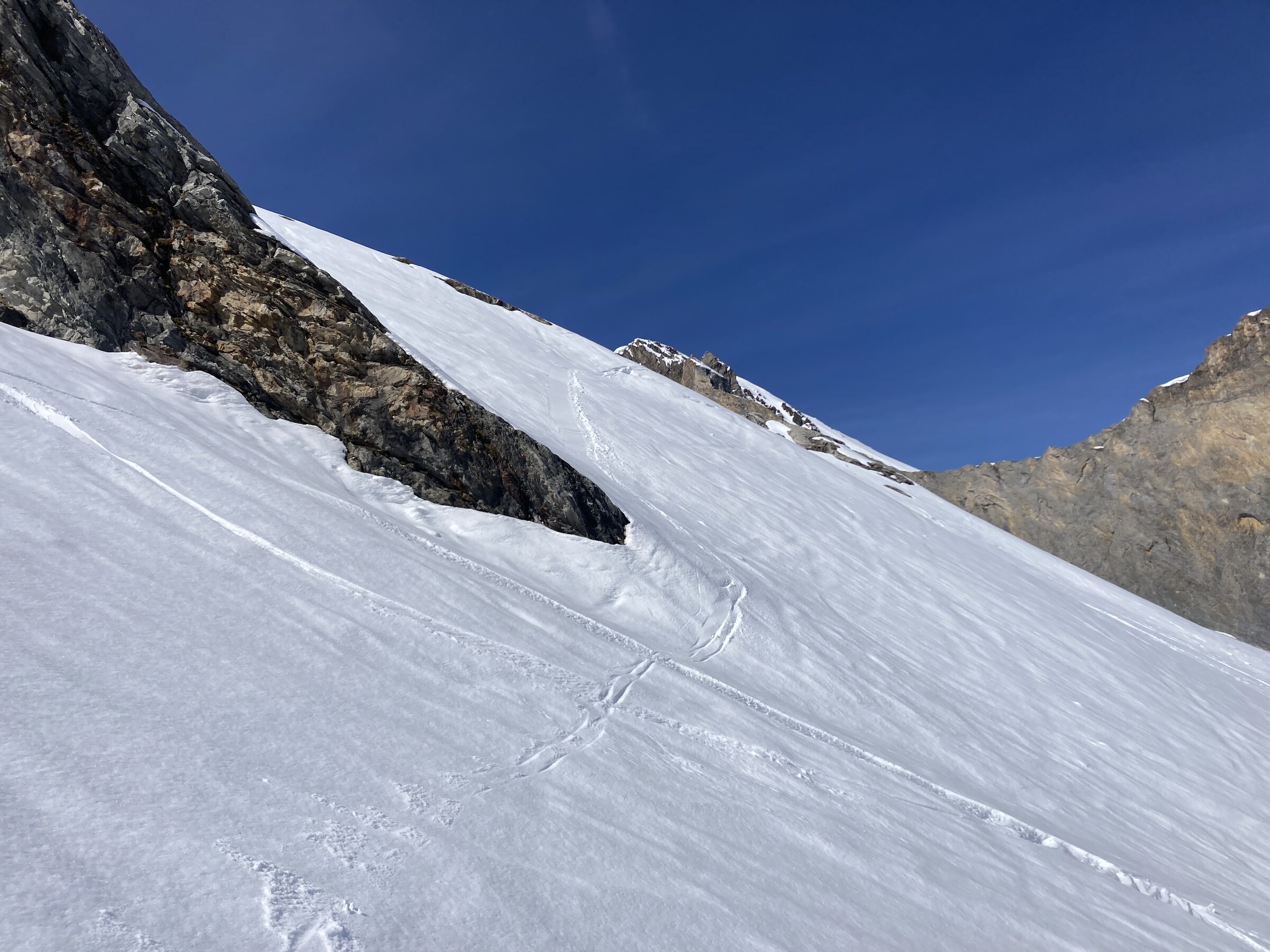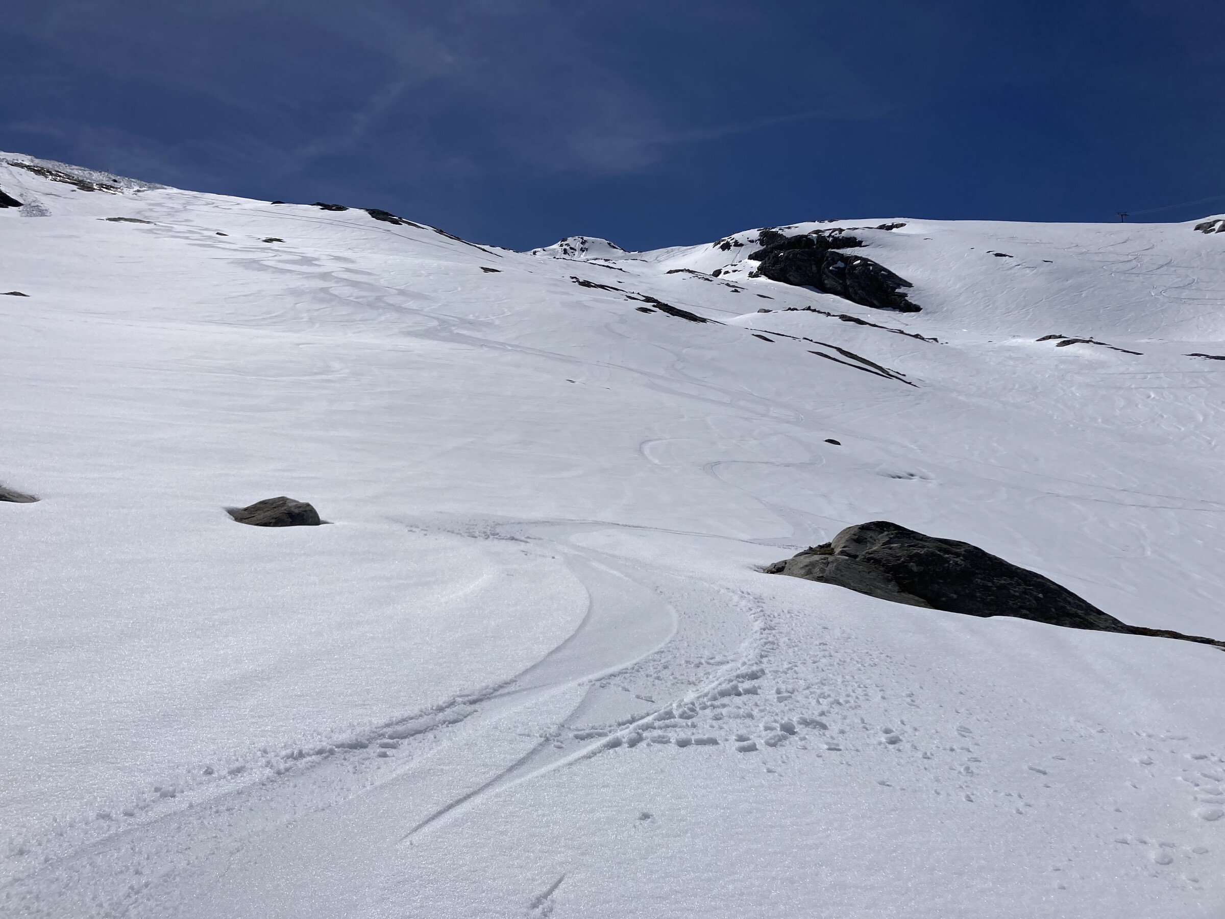 Der Sommerberghang war dabei kaum zerfahren, sicherlich auch da die L1 schon ausser Betrieb war und am Tag nach dem Neuschnee in dem Bereich länger Nebel drin hing, was die Powderhunter fernhielt.