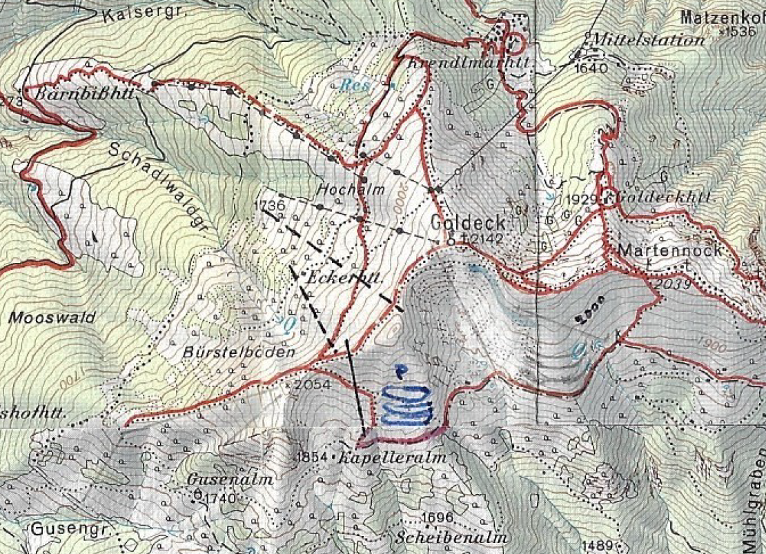 Die Kosten für die Seilbahntechnik (ohne Elektrik, Fundamente, Bauarbeiten und Gebäude) beliefen sich auf ca. 9 Millionen Schilling, das entspräche heute ca. 2 Millionen Euro. Davon entfielen ca. 950.000 Schilling auf die Kurvenkonstruktionen - und das alles nur wegen des Lawinenhangs. Das war auch nicht die einzige geplante Variante, hier eine alte Karte aus der Projektablage, auf der man die ausradierten Linien noch sieht: