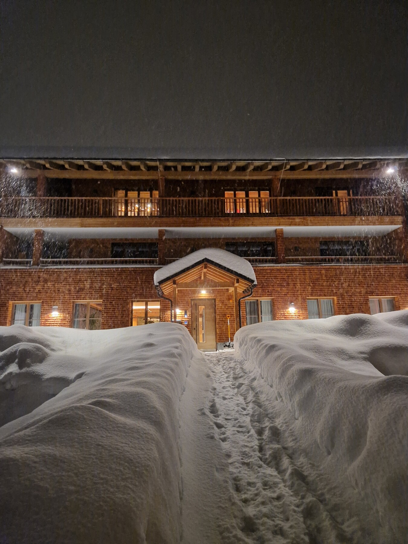 Die Unwetterwarnung von uwz.at, die ich heute Nachmittag aufs Handy bekommen habe, spricht von 100 bis 130 cm für Lech bis Dienstag Abend. Am Berg wären das > 1,5 m. Schau ma mal...