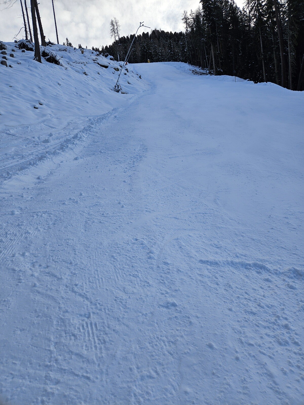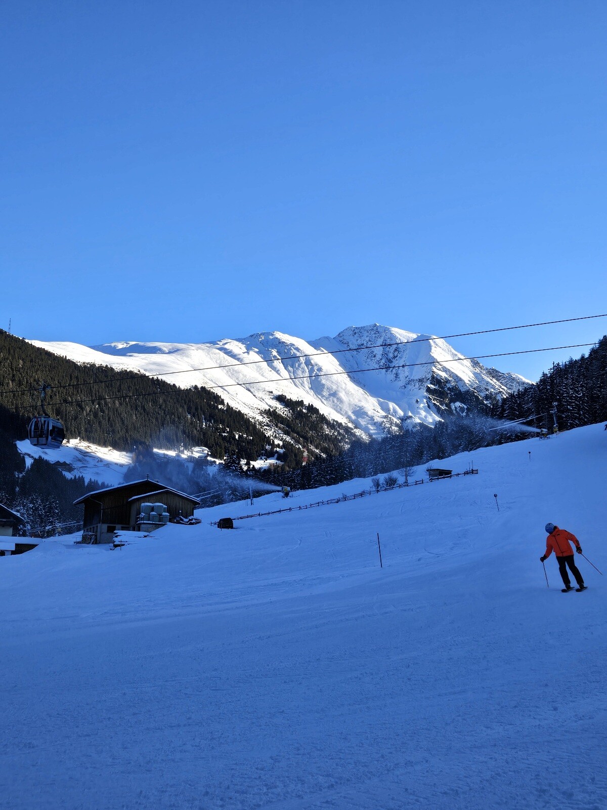 rechts oben die Bergstation der Wetterkreuzbahn. Die Piste 13, die da runtergeht, schlängelt sich sehr abwechslungsreich durchs alpine Gelände. Aber halt ein Schattenloch.