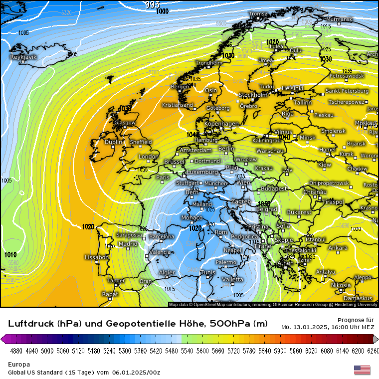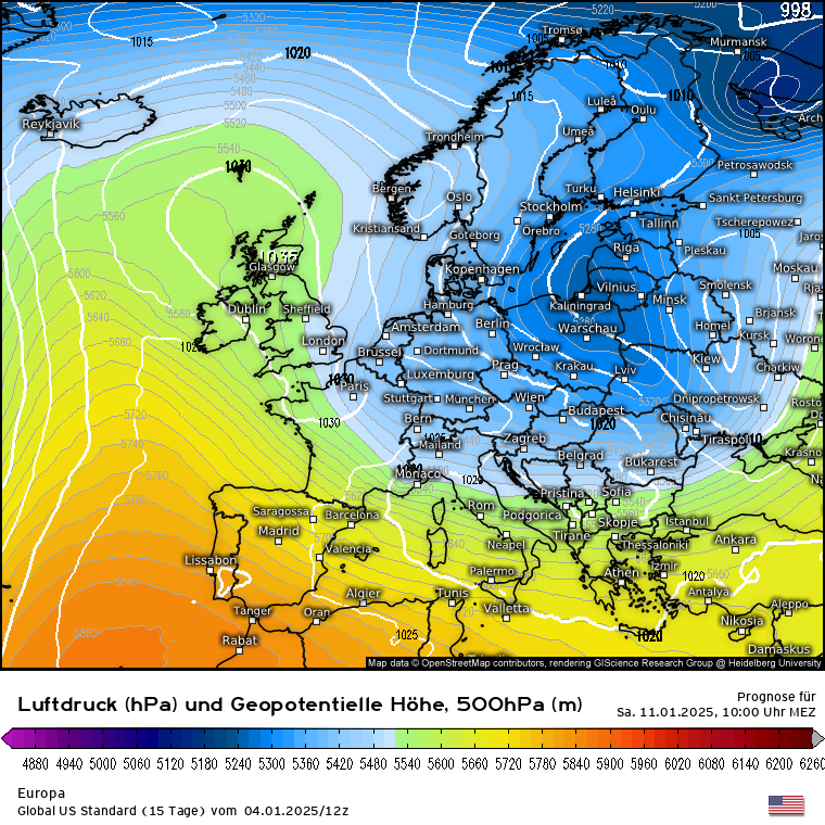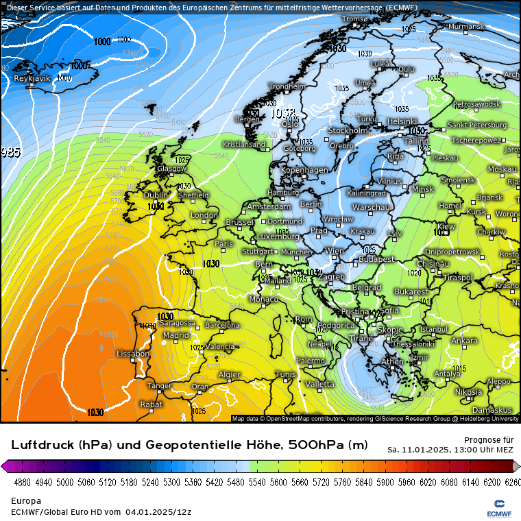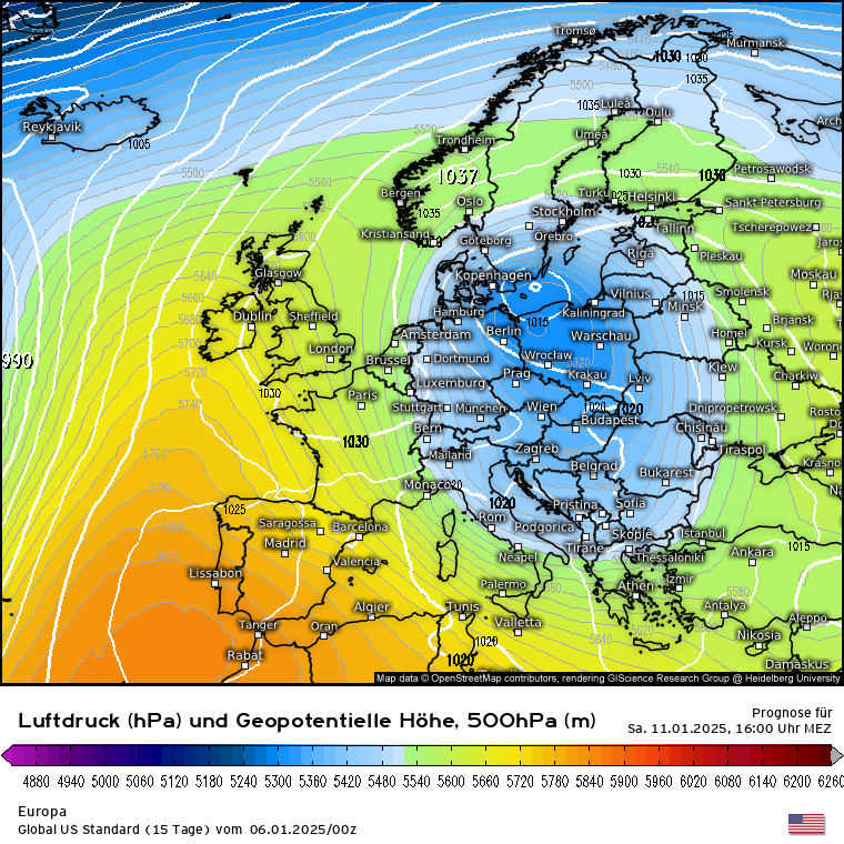 Wie soll es weitergehen am Samstag 11.01.? Das GFS sieht weiter den Aufbau eines blockierendes Hochdruckgebiets vom Atlantik über die Britischen Inseln bis nach Norwegen mit einem mächtigen Tief über Osteuropa. Das würde nicht nur kältere Temperaturen bringen sondern auch kräftige Schneefälle über Ostdeutschland. Das ECMWF sah heute morgen die schnell nachrückende Hochdruckzone, ist davon jetzt aber weg und schlägt eher zur Seite vom GFS und sieht einen Tiefdrucktrog nach Osteuropa. Die Zeichen stehen also eher auf einer kalten Wetterlage.