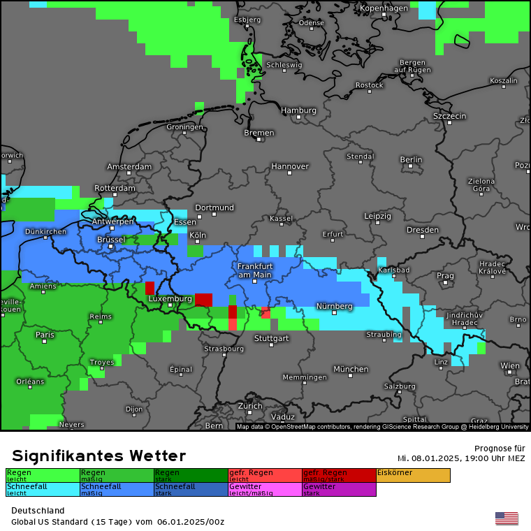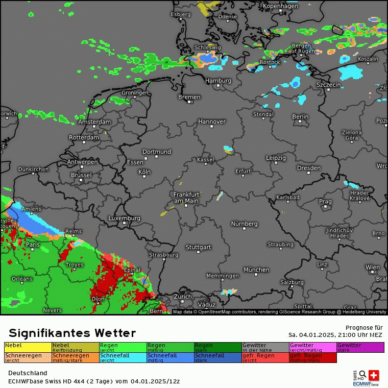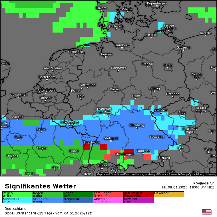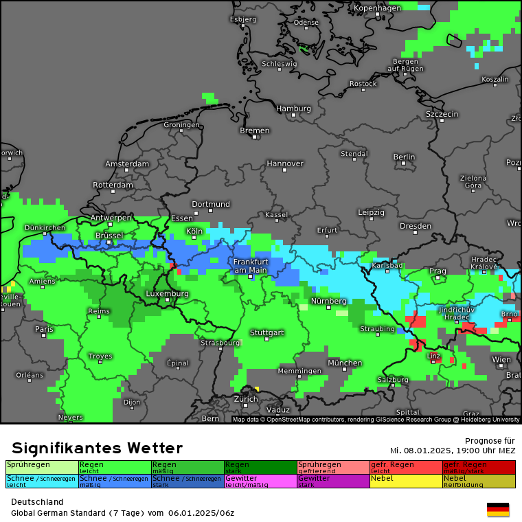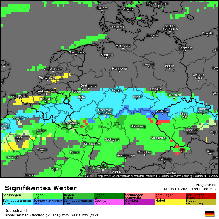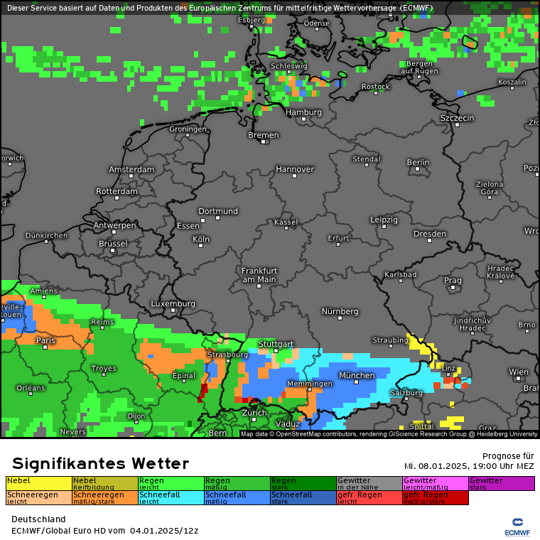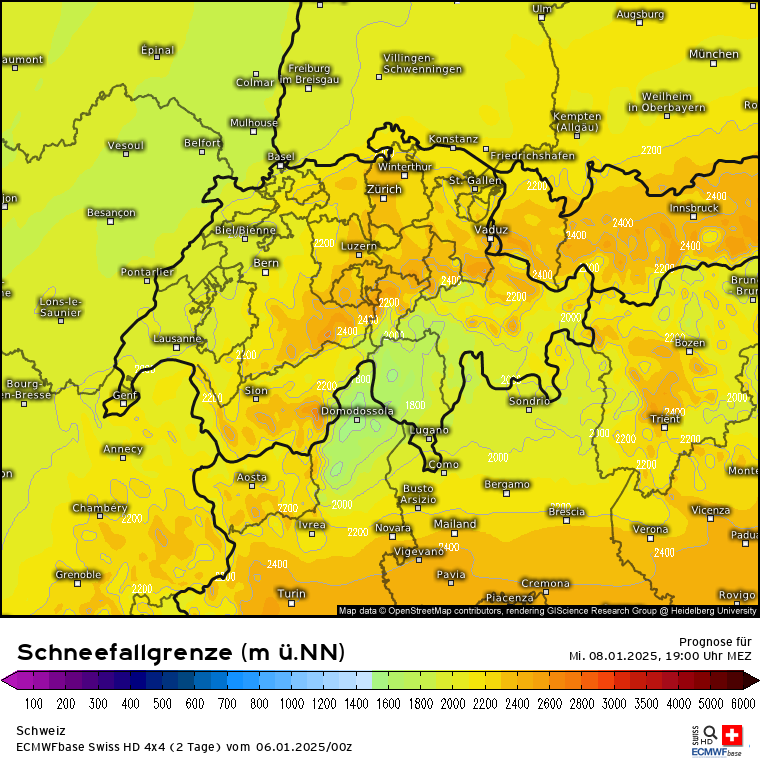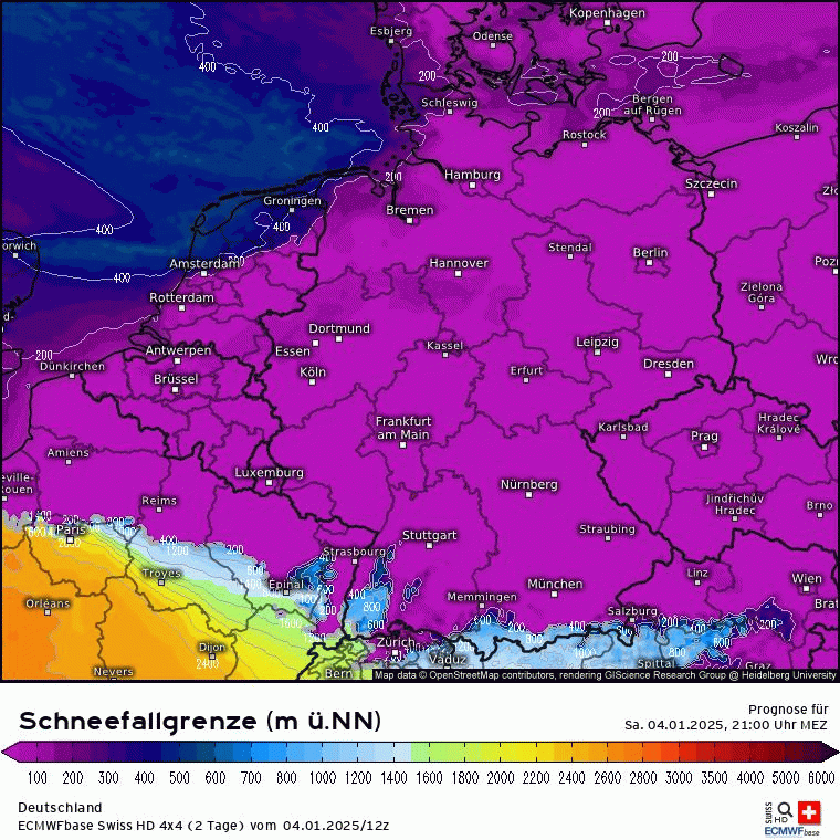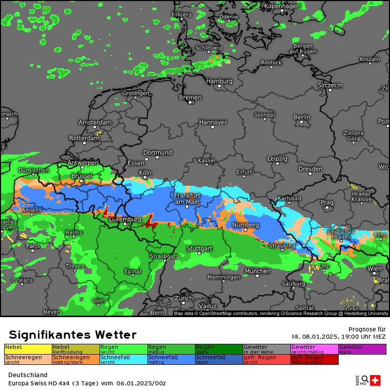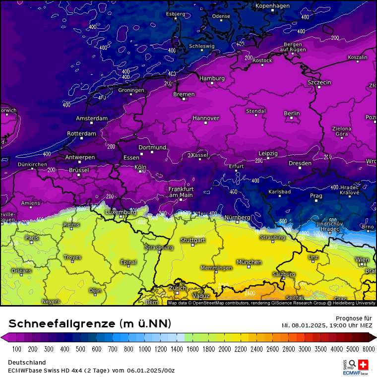 Dann kommt die die letzten Tage schon angesprochene Warmfront aus Süden, während die eben angesprochene Kaltluft am Dienstag eingeflossen ist. Dies ist an der Luftmassengrenze über den Alpen/Süddeutschland erkennbar: Höhen-/Bodenwetterkarte ECMWF für Mittwoch 16 Uhr. Es wird also deutlich mildere Luft aus Südeuropa gegen die eingeflossene Kaltluft gedrückt. Es wird zu einem Niederschlagsgebiet kommen, dass aus Süden kommt und Schnee sowie Regen bringen wird. Wie genau und wo genau was am Boden ankommt, da sind sich die Modelle nicht ganz einig und das ist auch nur schwer zu prognostizieren. Aber schauen wir mal auf GFS und ECMWF sowie Swiss und ICON. Also es kommt da was, aber wie und wo wird man wohl erst genau sehen, wenn es so weit ist. Aber in den tiefsten Tieflagen wie Rhein-Main wird nicht viel liegen bleiben, da die eingeflossene Kaltluft vom Dienstag nicht superkalt ist und die Böden noch die Wärme vom Montag haben. In den Alpen dürfte die SFG bei 2000m und höher liegen. Das sieht man auch wunderbar an der markanten Linie der SFG über Deutschland für Mittwoch 19 Uhr (analog dem vorherigen Karten des signifikanten Wetters). In den Karten für Schweiz und Österreich fehlt dann jegliche blaue Färbung :(