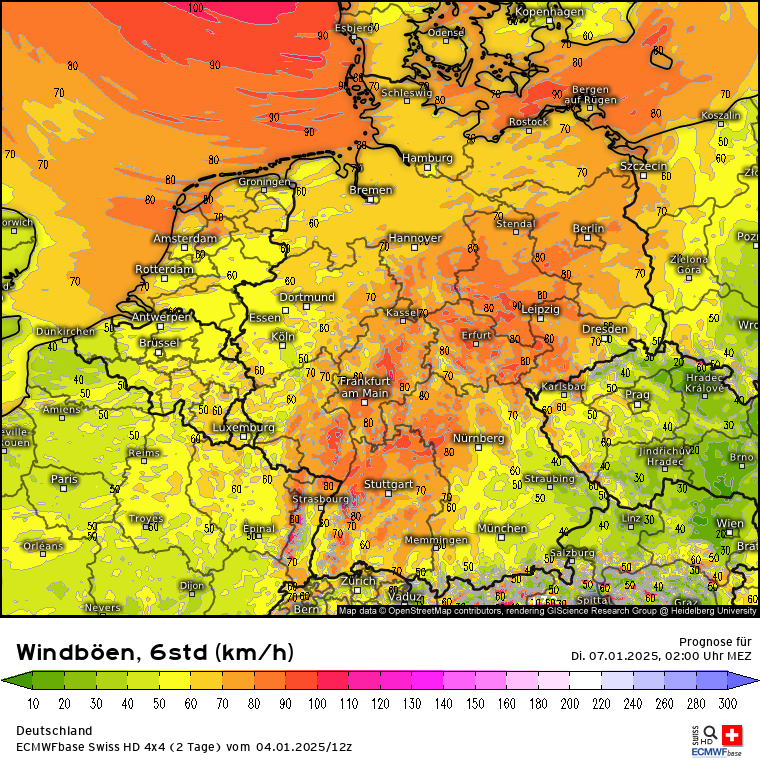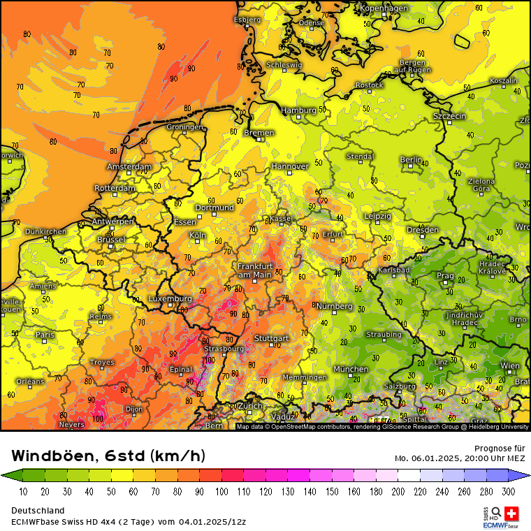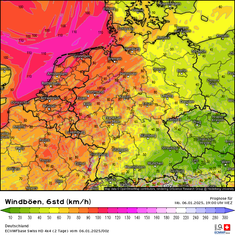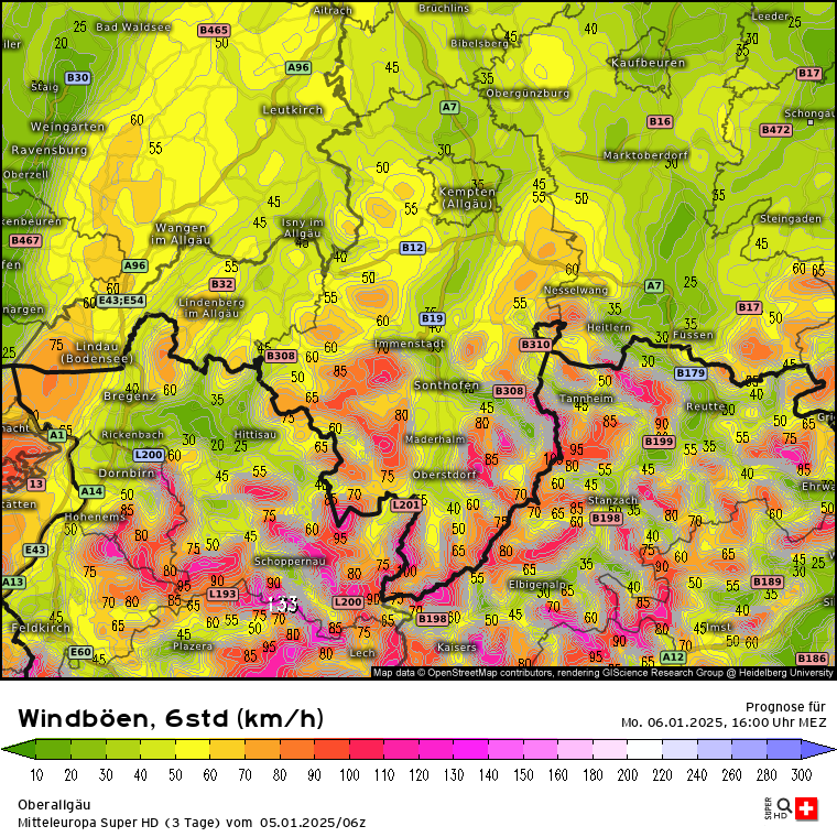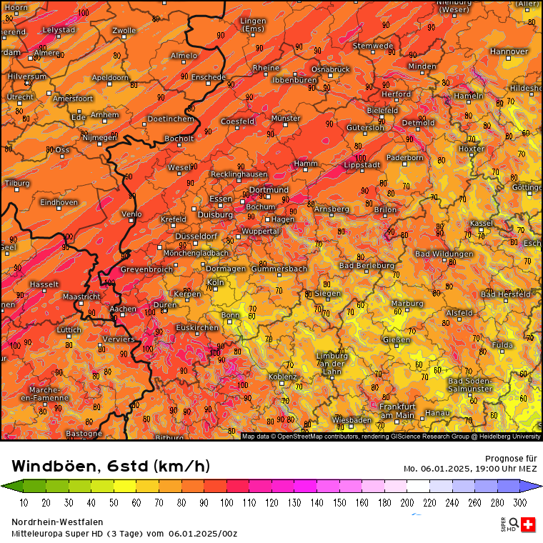 Heute wird nicht nur ein milder Tag sondern auch ein stürmischer: Windböen zwischen 13 und 19 Uhr; Zoom auf Nordrhein-Westfalen, da wird es ordentlich rappeln. Gegen Abend zieht das Sturmfeld nach Nordosten ab, wird dabei aber leicht schwächer. Da es in den Alpen auch arg föhnig heute werden soll, auch der Blick auf die Schweiz und Österreich (jeweils 10 bis 16 Uhr für die typischen Liftzeiten).