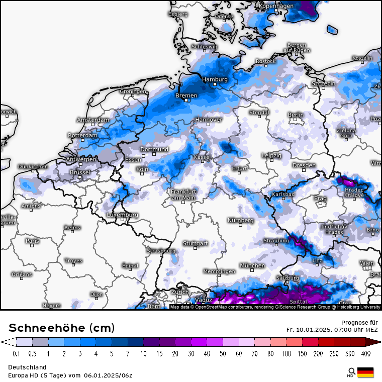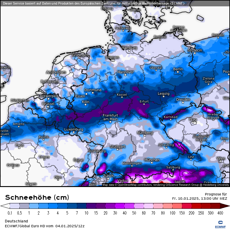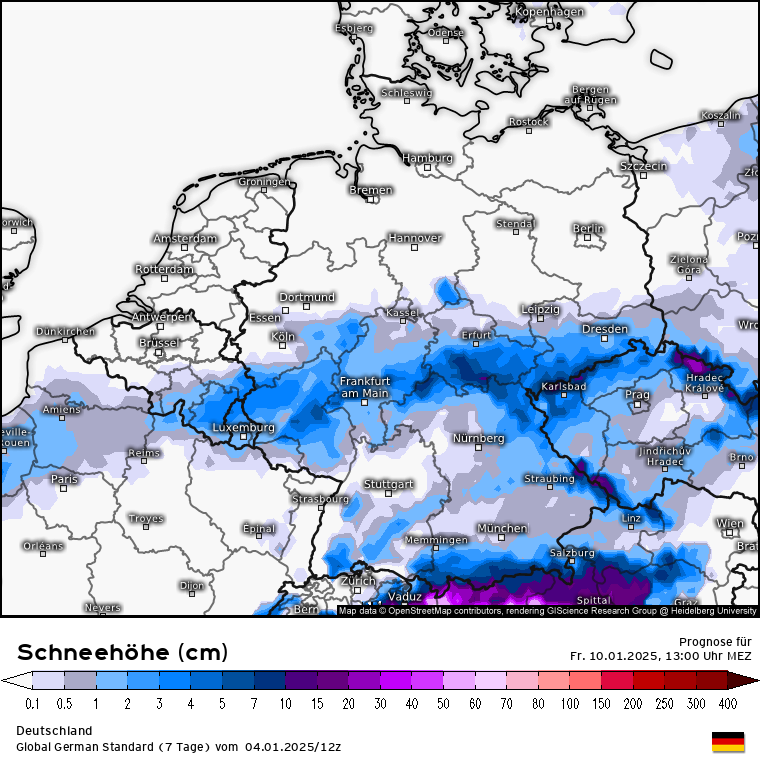 Am Mittwoch wird es dann spannend: Am Rand des Troges bildet sich über Westeuropa eine Tiefdruckrinne vom Atlantik bis nach Frankreich, die eine Warmfront über die Alpen lenkt. Die Luftmassengrenze könnte bis zur Mitte Deutschland vorstoßen. Wie würde sich das bei der Wettersituation am Mittwoch 19 Uhr darstellen: GFS sieht die stärksten Schneefälle, das ICON die Light-Version und das ECMWF sieht die Luftmassengrenze deutlich südlicher und erst später zu Donnerstag 4 Uhr die Schneefälle in der Mitte Deutschlands. Auf der Vorderseite sind in den Modellen also Schneefälle drin, offenbar auch mal intensiver. Wie weit aber die Front noch nach Norden vorstoßen wird ist ein Stück weit unsicher. Ebenso was genau an Schnee kommen wird. Dennoch mal ein Blick auf die Modelle hinsichtlich Schneehöhenprognose bis Freitag 13 Uhr: GFS, ICON und ECMWF. Alle sehen den Schwerpunkt über der Mitte wobei das ICON jetzt wieder das zurückhaltende der drei Modelle ist und im Vergleich zu den ersten Läufen heute Morgen die Mengen schon nach unten korrigiert wurden.