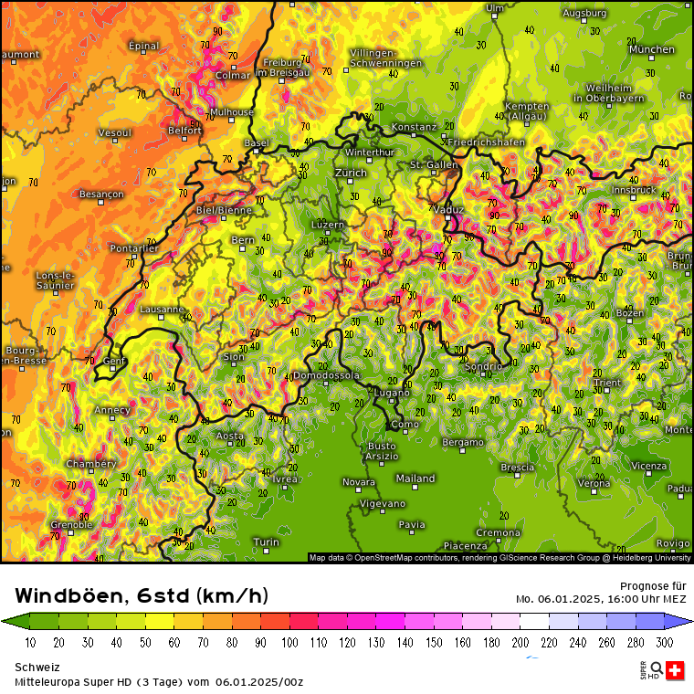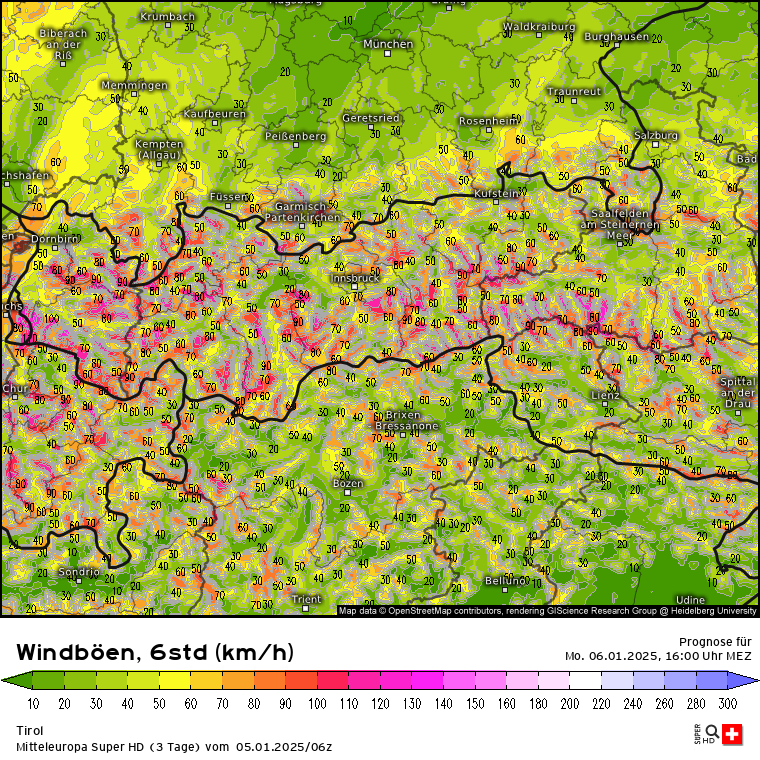 Dürfte in den Höhenlagen gut rappeln, wenn ich auf die Prognose der Windböen von 10 bis 16 Uhr schaue. Wenn man auf ganz Tirol schaut, ist da sehr viel orange und rot: Klick.