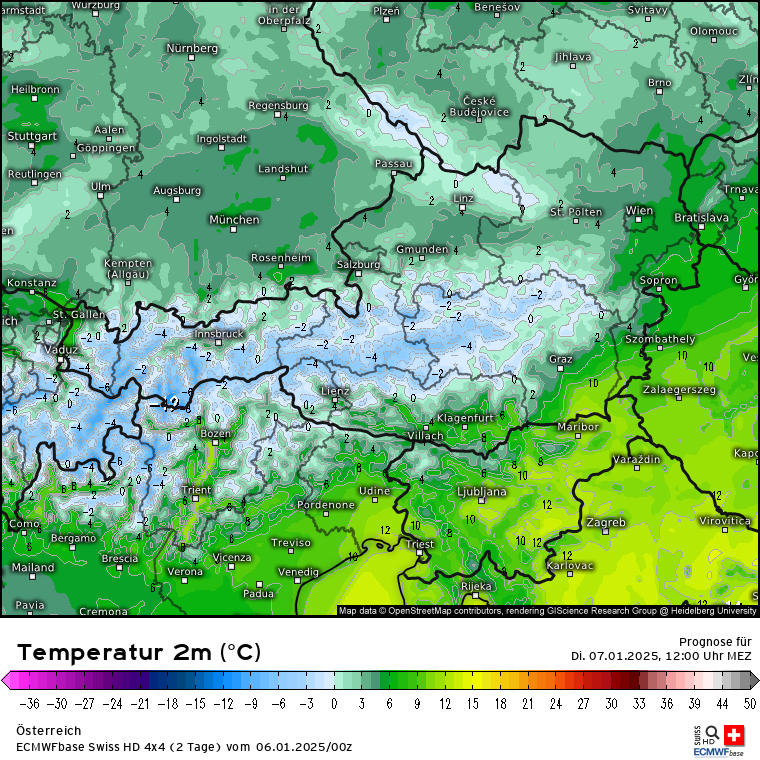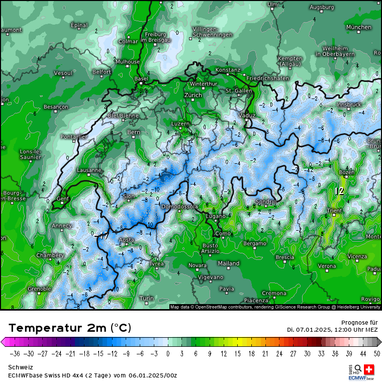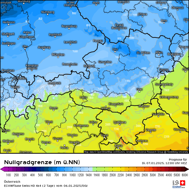 Und dann wird es in der Nacht zu morgen auch schon wieder kälter indem eine Kaltfront aus Nordwesten reinschiebt: SFG Deutschland Dienstag 6 Uhr Wie man am unteren Bildrand erkennt, wird die SFG in den Nordalpen da noch bei ca. 1000-1200m liegen. Auf der Südseite etwas höher, wird dort aber dann mit Zug der Kaltfront auch sinken. Die Temperaturen gegen 12 Uhr in DE wieder klar einstellig, auch in der Schweiz und Österreich wieder spürbar kälter. Nullgradgrenze Schweiz und Österreich zu Dienstag 12 Uhr. Schneemengen Österreich und Schweiz bis morgen 23 Uhr.