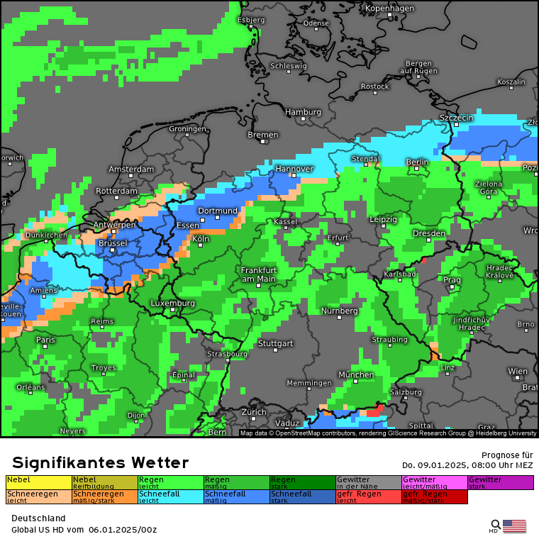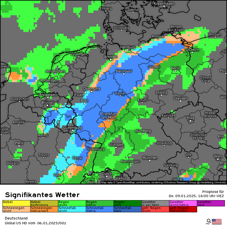 Spannend und auch leicht unterschiedlich wird es dann zum Donnerstag: Die Warmfront soll in den Modellen nach Norden/Nordwesten schwenken, die Schneefälle auf der Vorderseite werden in den Modellen jedoch unterschiedlich beurteilt: Signifikantes Wetter Donnerstag 1 Uhr nachts GFS und ECMWF. Und das signifikante Wetter für Donnerstag 8 Uhr: GFS und ECMWF. Spannend wird dann, dass sich am Donnerstagnachmittag die Warmfront als Kaltfront wieder nach Osten durchschwenkt und es auf der Vorderseite der Kaltfront bzw. der Rückseite der Warmfront zu weiteren Schneefällen kommt. Hierzu das signifikante Wetter für Donnerstag 16 Uhr: GFS und ECMWF. Also alles wirklich komplex ... abschließend dazu der Blick auf die prognostizierten Schneehöhen, die aus dieser Wetterlage resultieren könnten: GFS, ICON, ECMWF und MRF. Klar unterscheiden sich die Prognosen wie immer, man kann aber grob in allen Modellen eine Schneelinie von der Eifel über NRW, Sauerland, Nordhessen, Südniedersachsen, Harz bis nach Brandenburg erkennen.