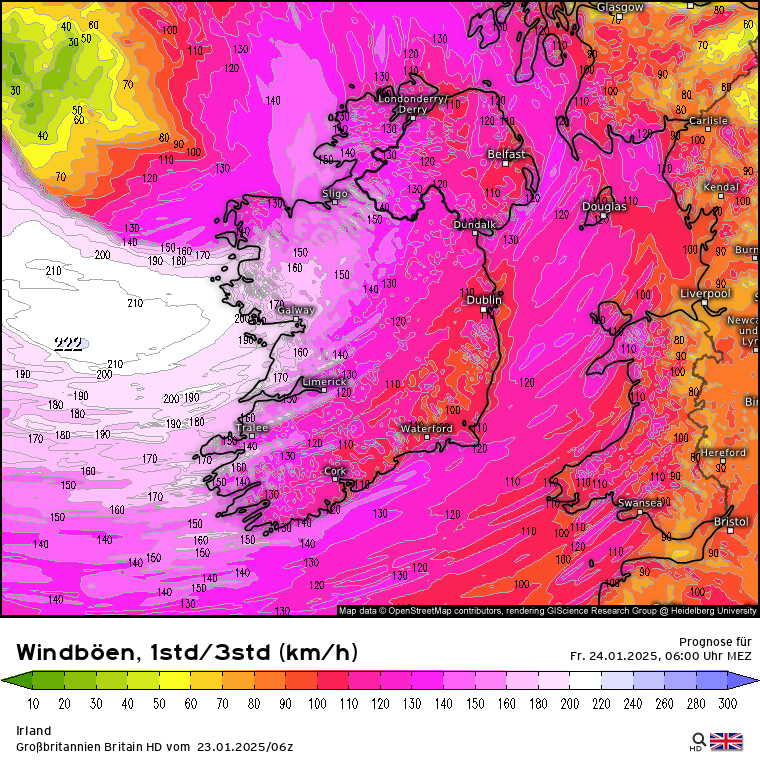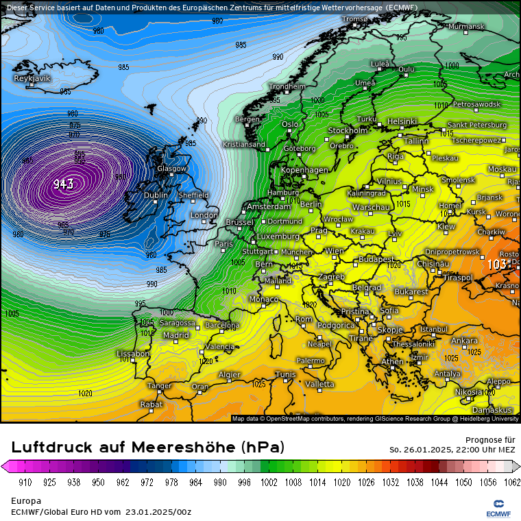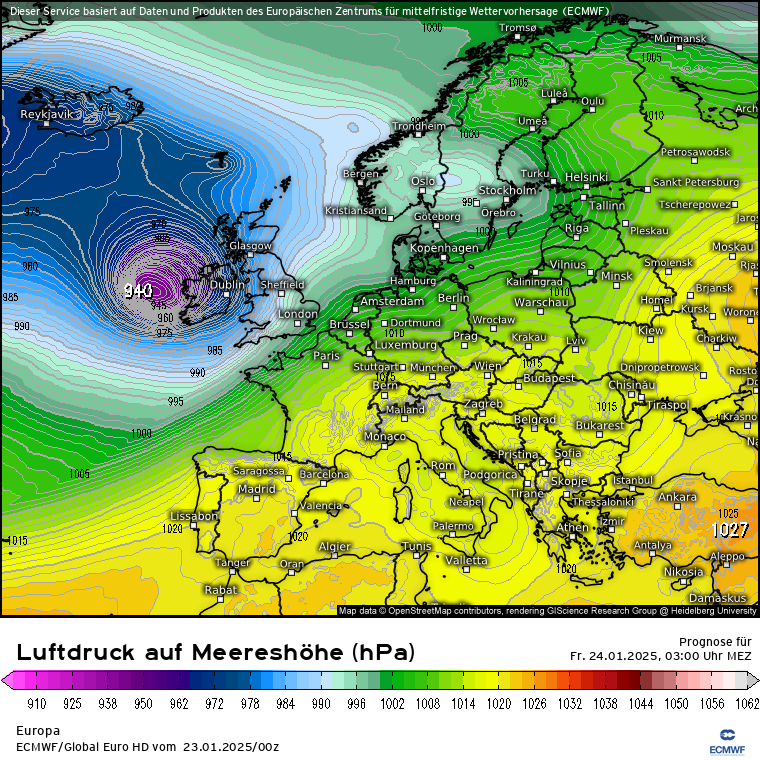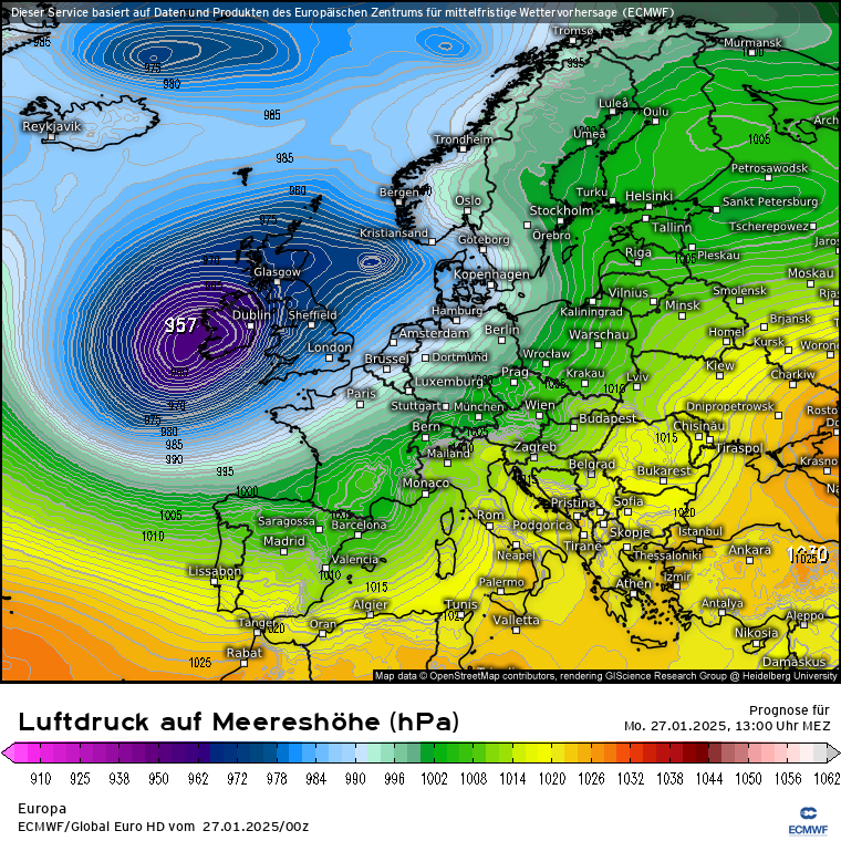 Auch wenn uns zum Glück die Bombogenese nicht trifft, so kann man für Irland hoffen, dass es irgendwie glimpflich ablaufen wird. Das britische Modell sieht Windgeschwindigkeiten am Freitagmorgen von über 200 km/h, das EZ4 sieht sogar 250 kmh auf dem offenen Meer vor der Küste Irlands. Ergänzend noch die Bodenwetterkarte dazu für Freitagnacht 3 Uhr (ECMWF), man sieht einen Kerndruck von 940 hPa im Tief, das ist schon ordentlich für diese Breiten. Leider wird das wohl erst der erste von zwei ausgeprägten Orkanen sein, die Irland treffen wird. Denn am Sonntagabend die nächste Bombogenese, wenn man sich die Bodenwetterkarte (ECMWF) anschaut: Klick. Ob dieser Orkan aber genauso ausgeprägt Irland treffen wird, muss beobachtet werden. Aber was bedeutet das für uns: Milderung durch den Zustrom warmer Luftmassen auf der Unterseite des Tiefs, also aus Süden/Südwesten. Das Wetter zeigt sich dann eher von der nicht winterlichen Seite.
