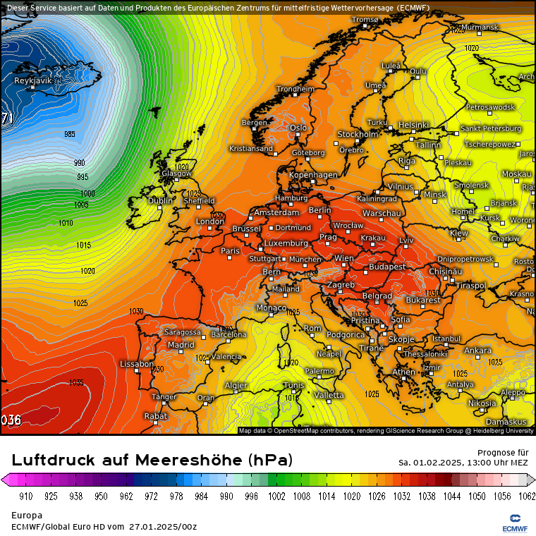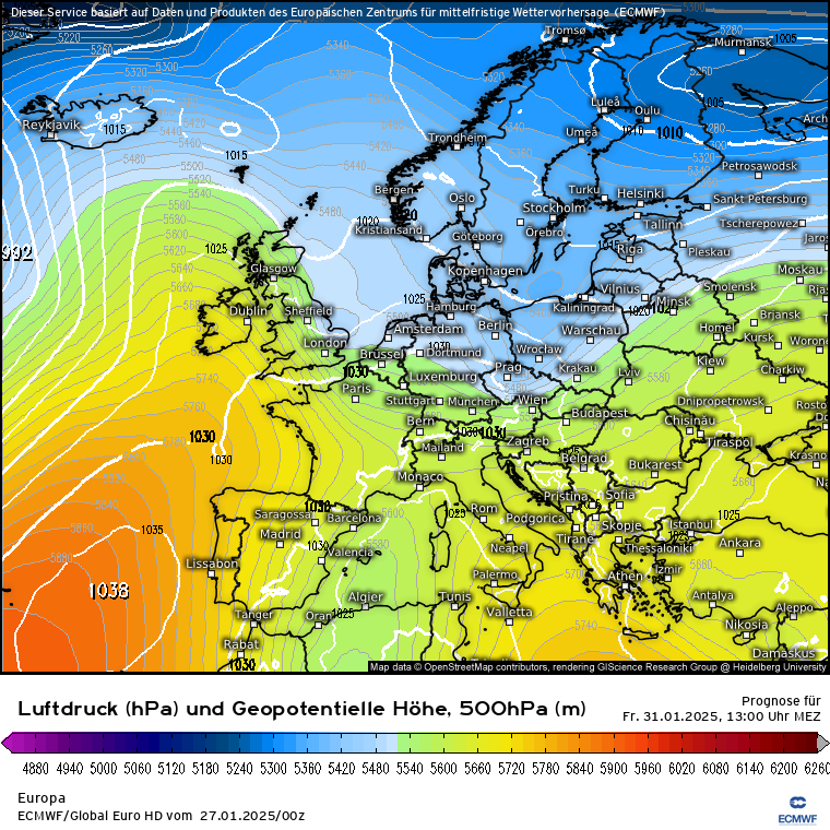 Für den Samstag stehen die Zeichen beim ECMWF auf Hochdruck über Mitteleuropa bis nach Skandinavien mit der Möglichkeit vom Zustrom kühlerer Luft aus Norden, während ein Tief über Island im Zusammenspiel mit dem eben genannten Hochdrucksystem die warmen Luftmassen über dem Atlantik nach Norden abführt (Höhenwetterkarte ECMWF Freitagb 13 Uhr).