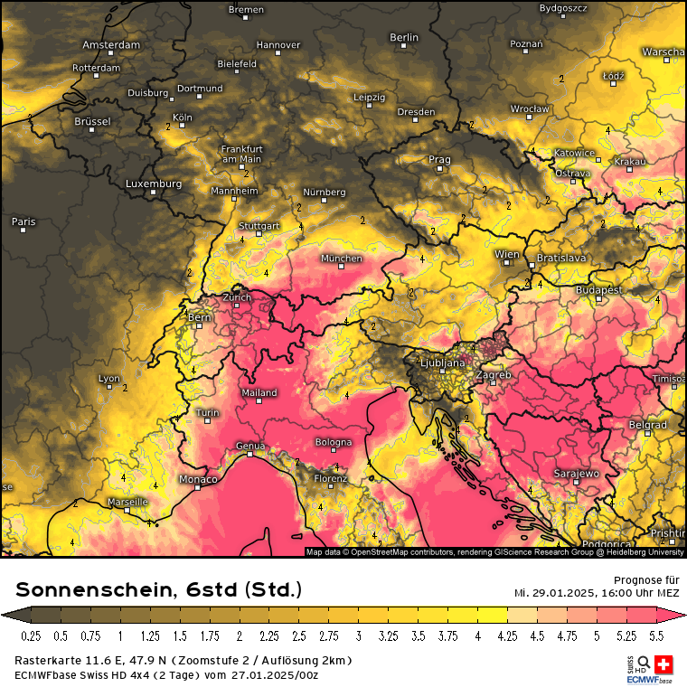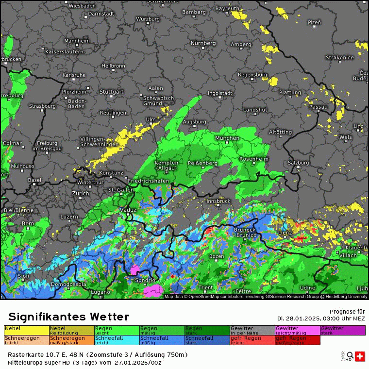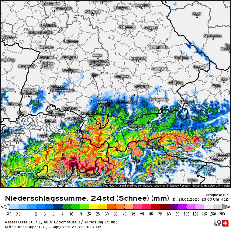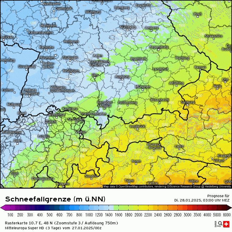 Dienstag Stand jetzt Schneefallgrenze wirklich viel zu weit oben für Ende Januar. Wird wohl wirklich bei stellenweise 2000 Meter zu liegen kommen, und dann wieder sinken bis auf 800 Meter.