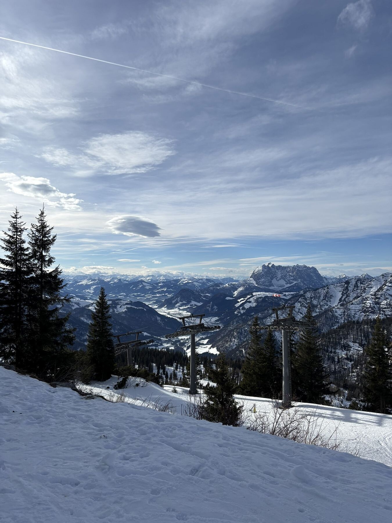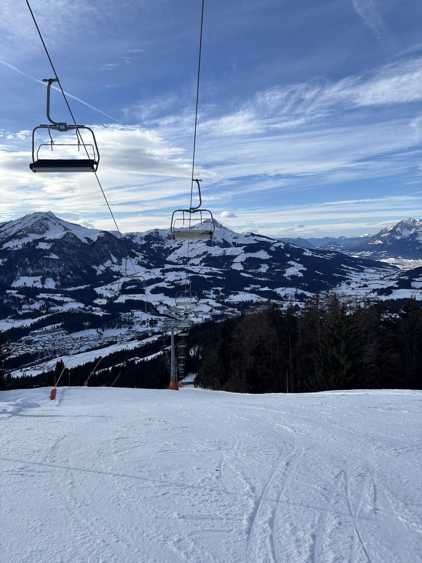 Zwei Wiederholungen an den beiden 8KSB und dann ging es Richtung Tal und ab an die Buchensteinwand. Irgendwie haben so kleine Gebiete eine gewisse Faszination auf mich. Unten an der Talstation war wahnsinnig viel los mit langen Schlangen an den Übungsschleppern. An der 4KSB dagegen kein Mensch und auch oben an der 4SB mit dem tollen Panorama Richtung Fieberbrunn war noch weniger los.