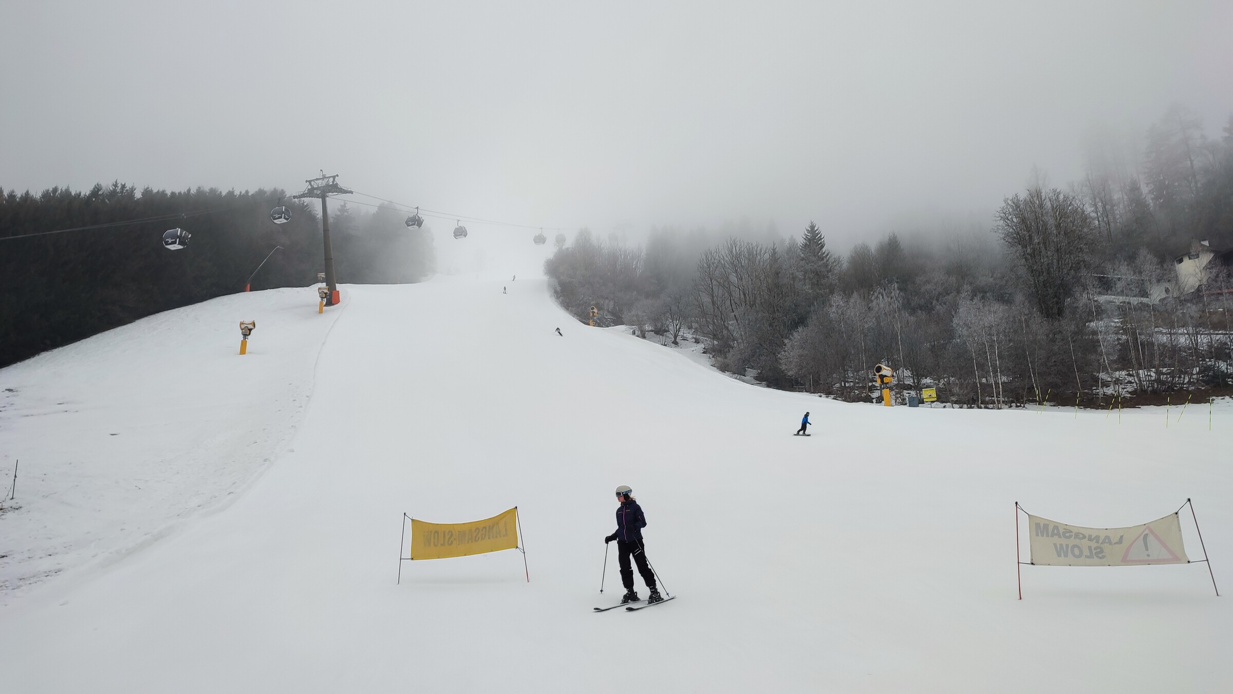 Im unteren Nebelbereich entstanden nachmittags weiche Buckel aus unverbundenem Maschinenschnee mit Eis drumherum. Trassabfahrt unten sehr eisig, Standardabfahrt besser.