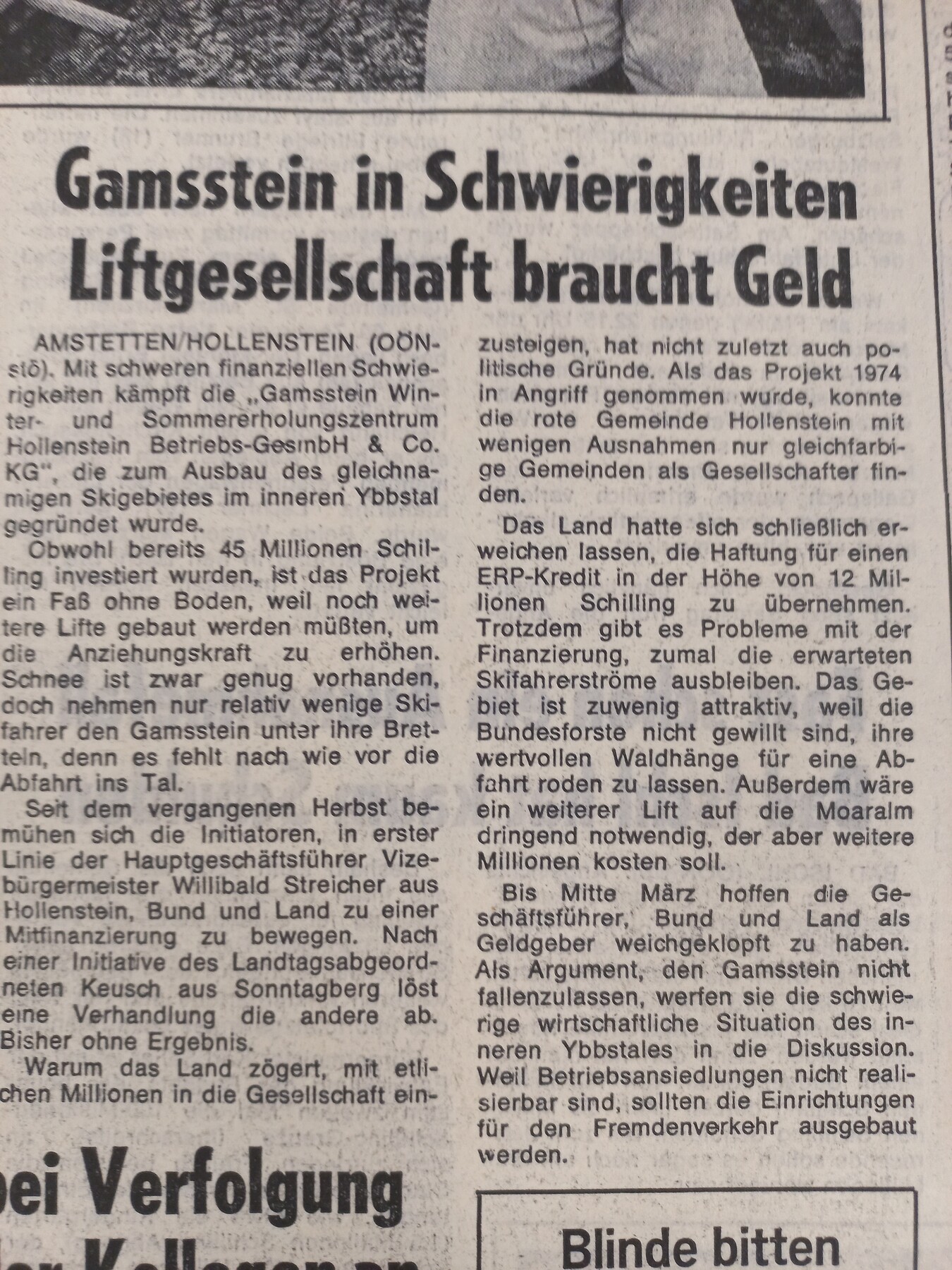 Bürgermeister des Bezirkes Amstetten unter Vorsitz des seinerzeitigen Nationalrates Bürgermeister Pölz aus Amstetten die Erschließung des Gamssteines in Hollenstein an der Ybbs beraten, da Verhandlungen im Jahre 1968 mit der Generaldirektion der Österreichischen Bundesforste gescheitert waren.
