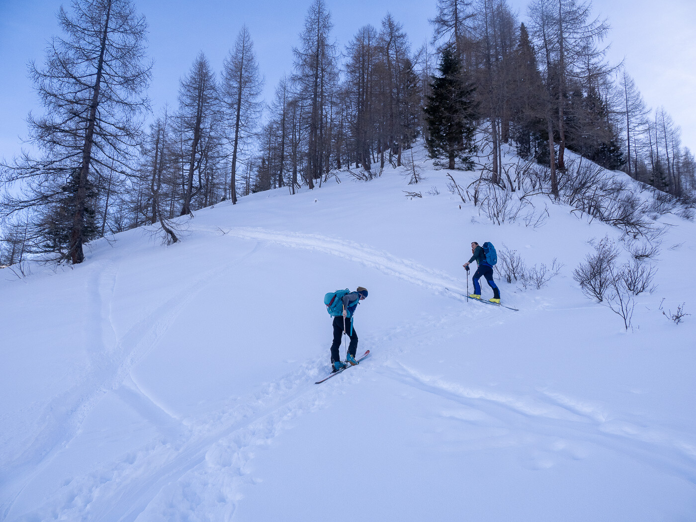 Wir halten uns an den Namen, traversieren das Almgelände und wenden uns nach rechts, wo ein kurzer steiler Aufstieg durch einen lichten Waldgürtel auf uns wartet.
