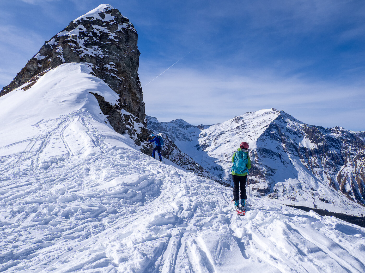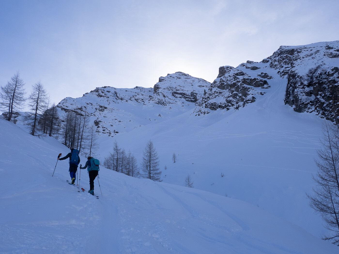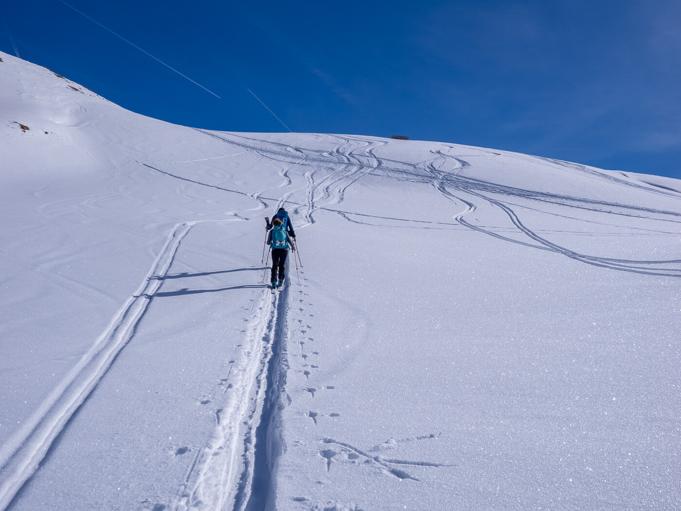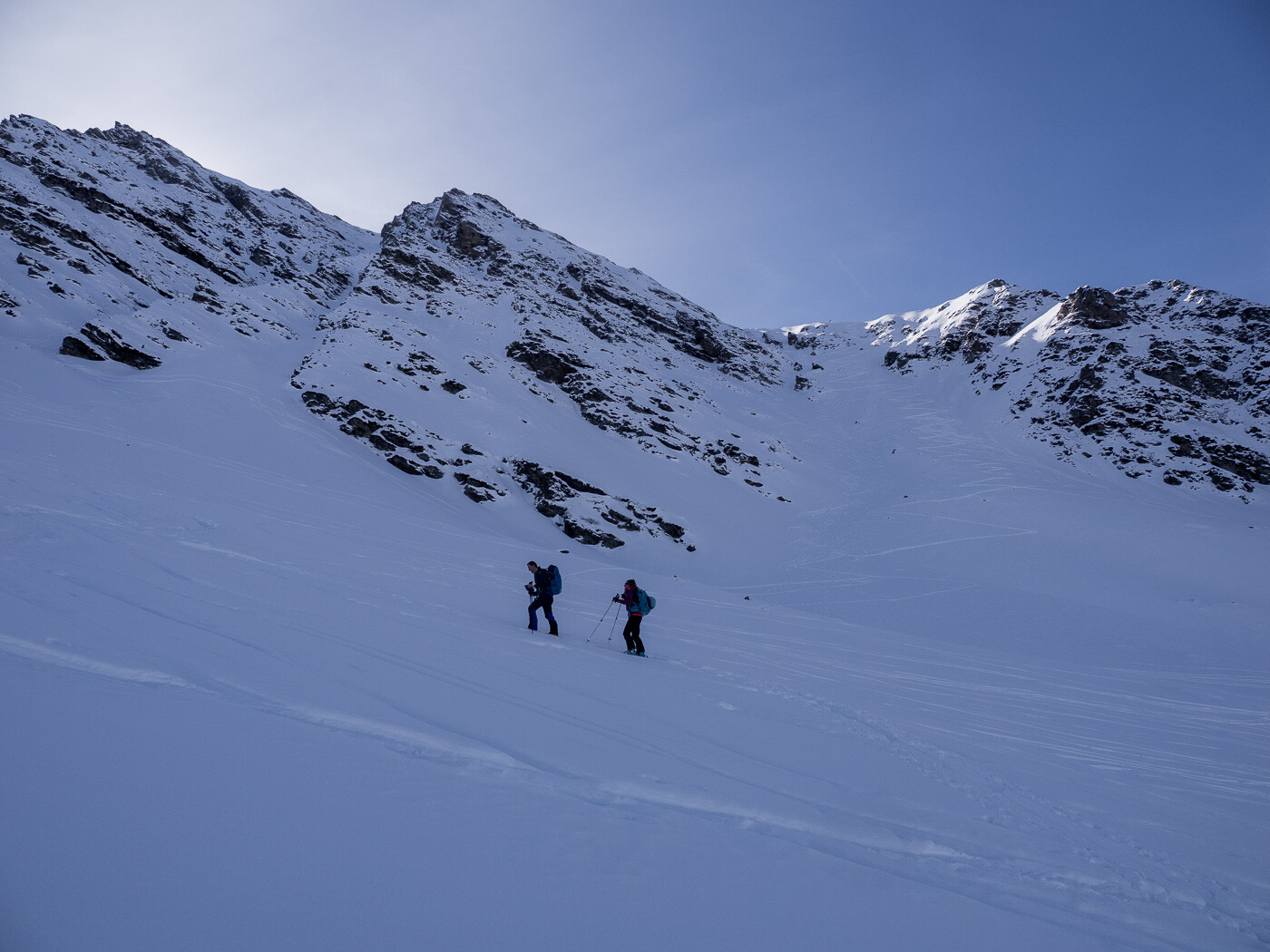 Bald öffnet sich ein weites Kar, dessen Südseite um diese Jahreszeit den ganzen Tag im Schatten liegt und noch guten Schnee verspricht.