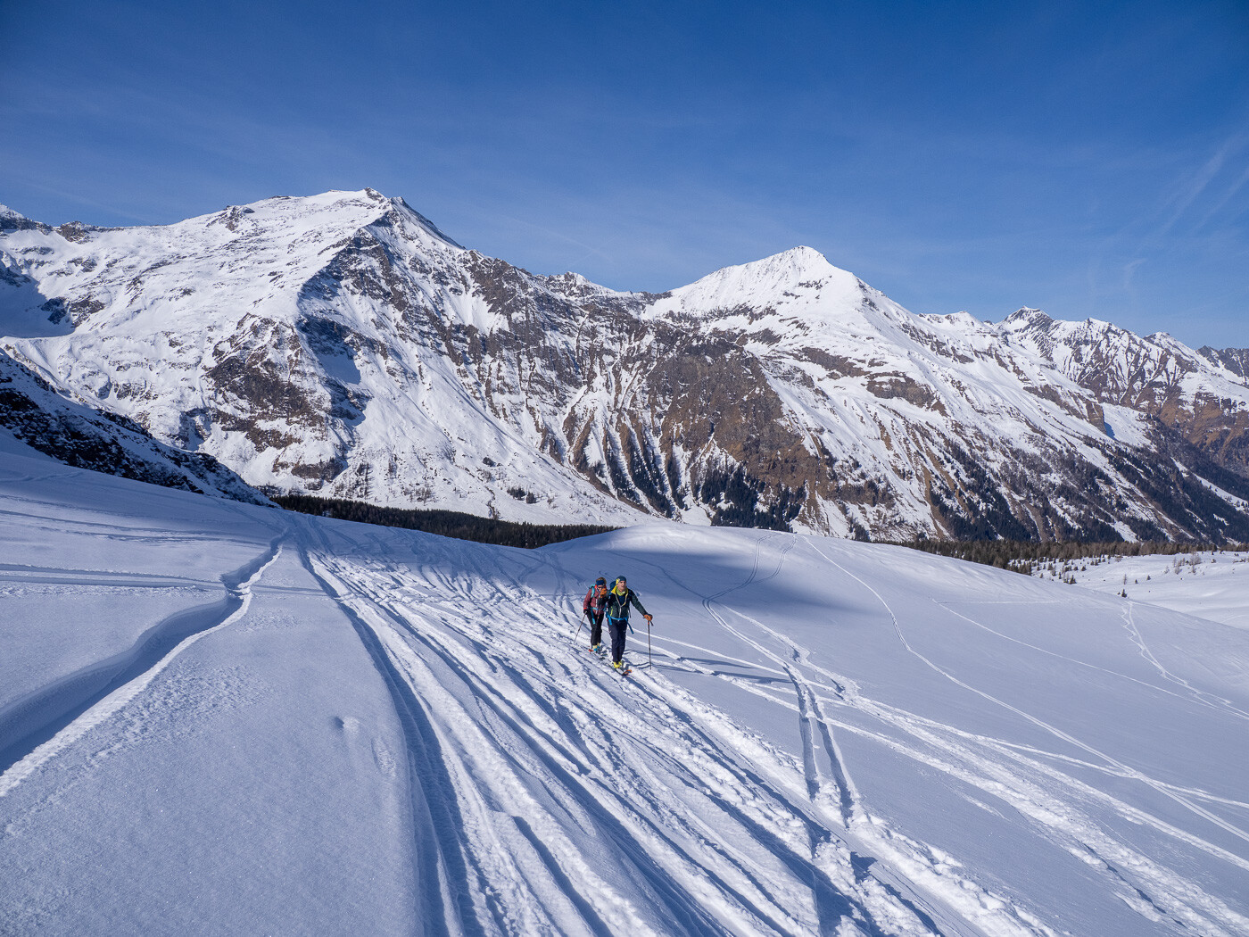 Nach einem hervorragenden Abendessen, einem kurzen Spaziergang zwecks Betrachtung des wunderbaren Sternenhimmels, einer erholsamen Nacht und einem ebenfalls ausgezeichneten Frühstück beginnen wir nun in durchaus winterlicher Umgebung unsere erste Tour, die uns zu einem der typischen Hochwinterzielen von Kolm Saigurn, auf den Kolmkarspitz führen wird. Mit einer Höhe von 2529m liegt unser Ziel etwas über 900 m oberhalb unserer Unterkunft.