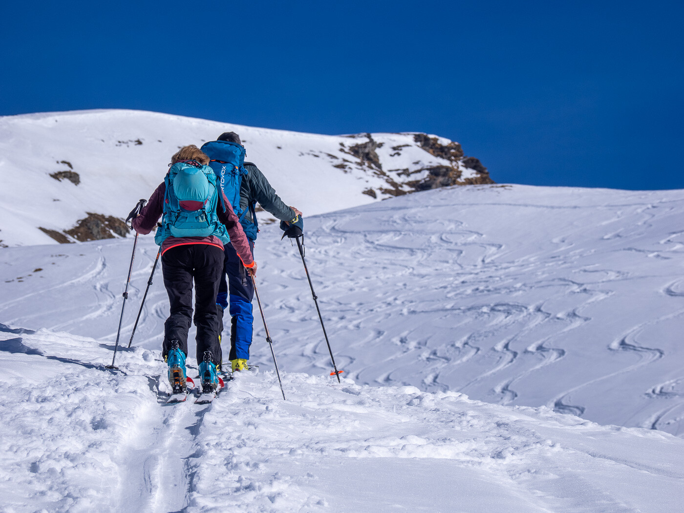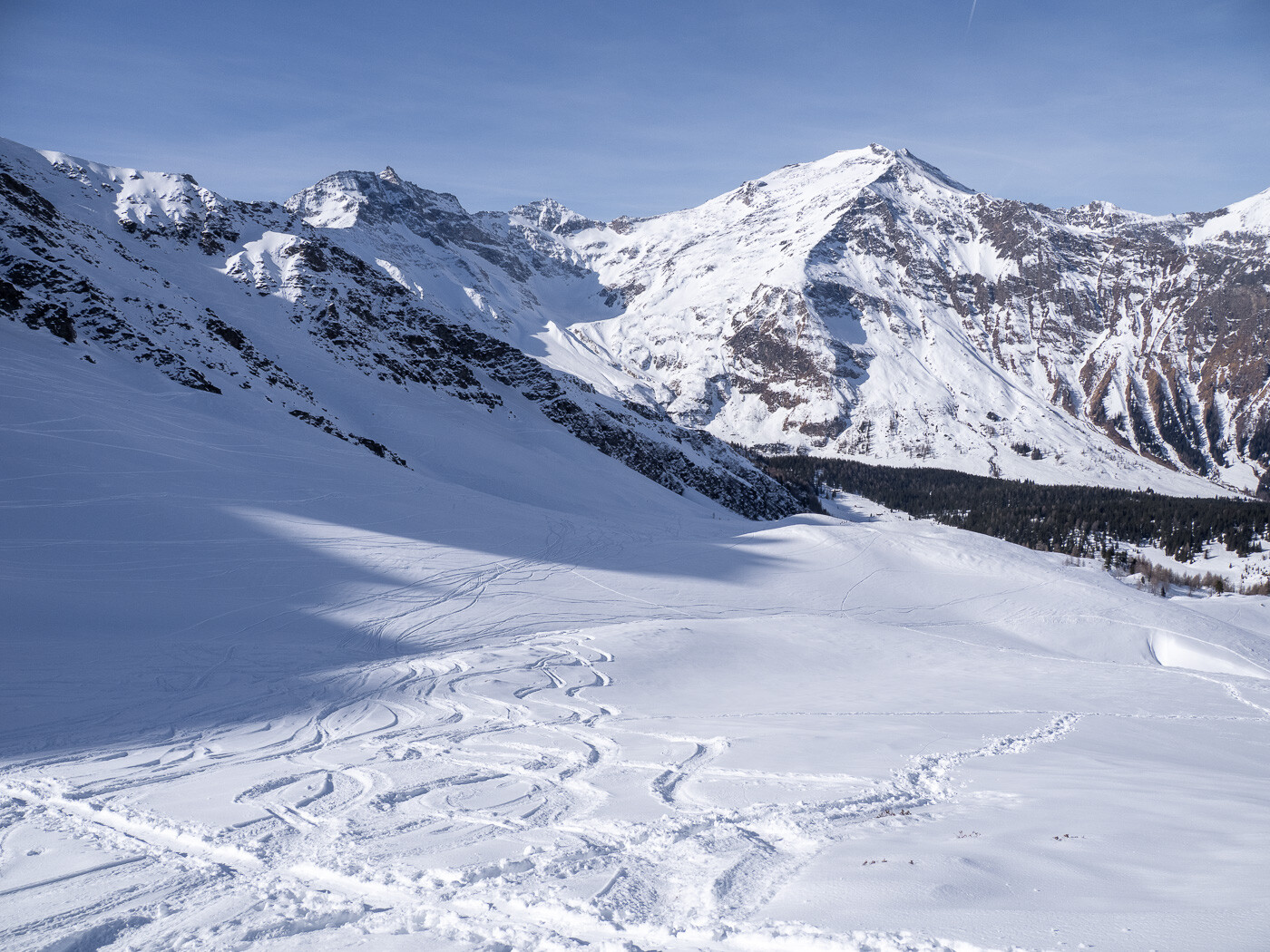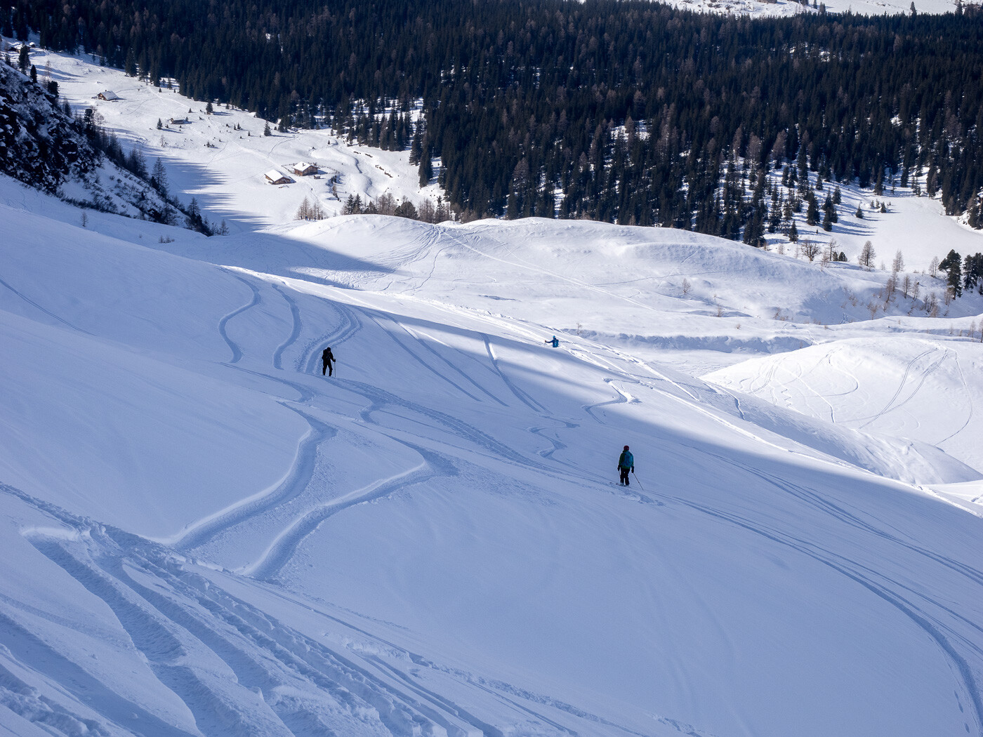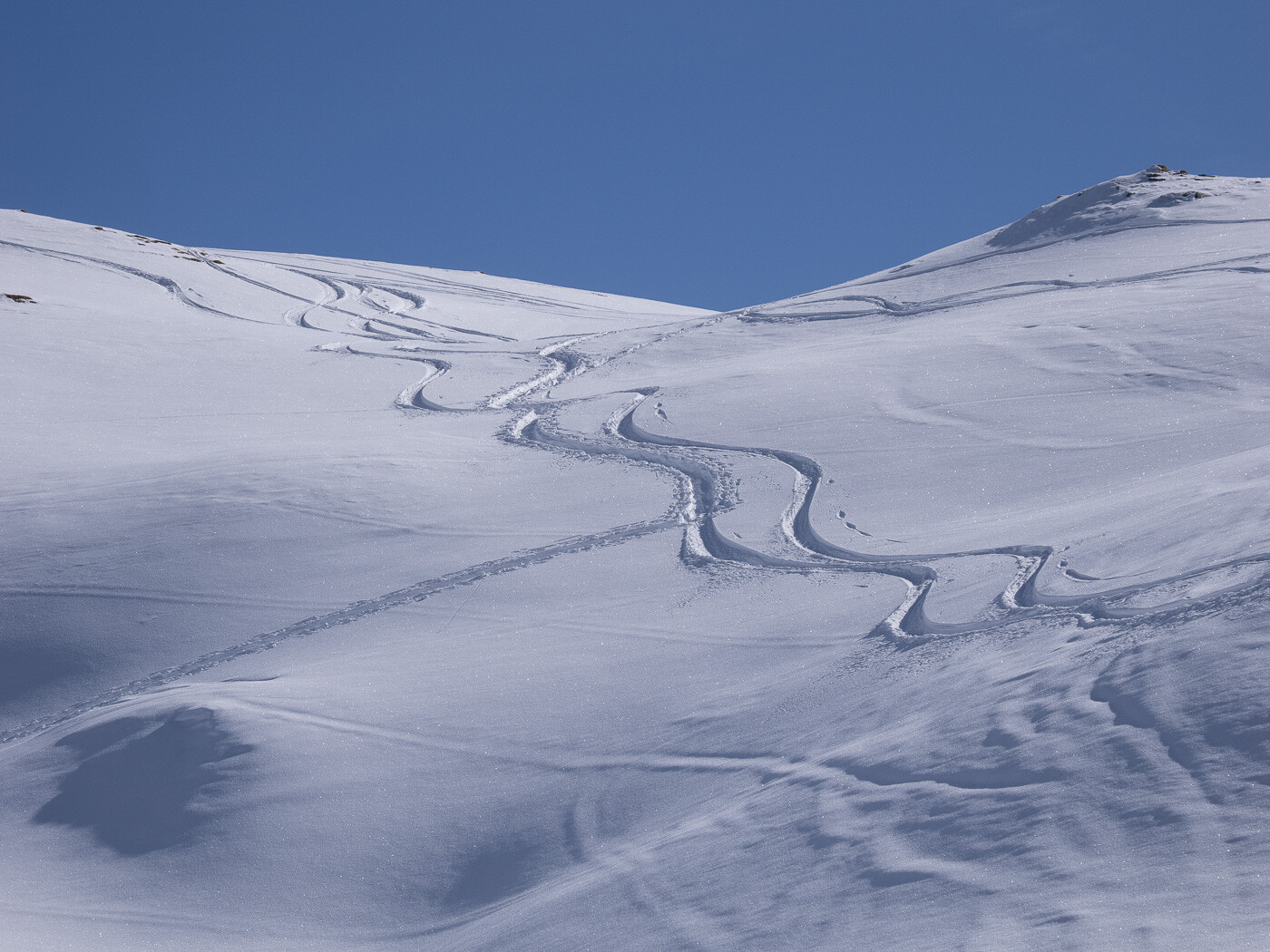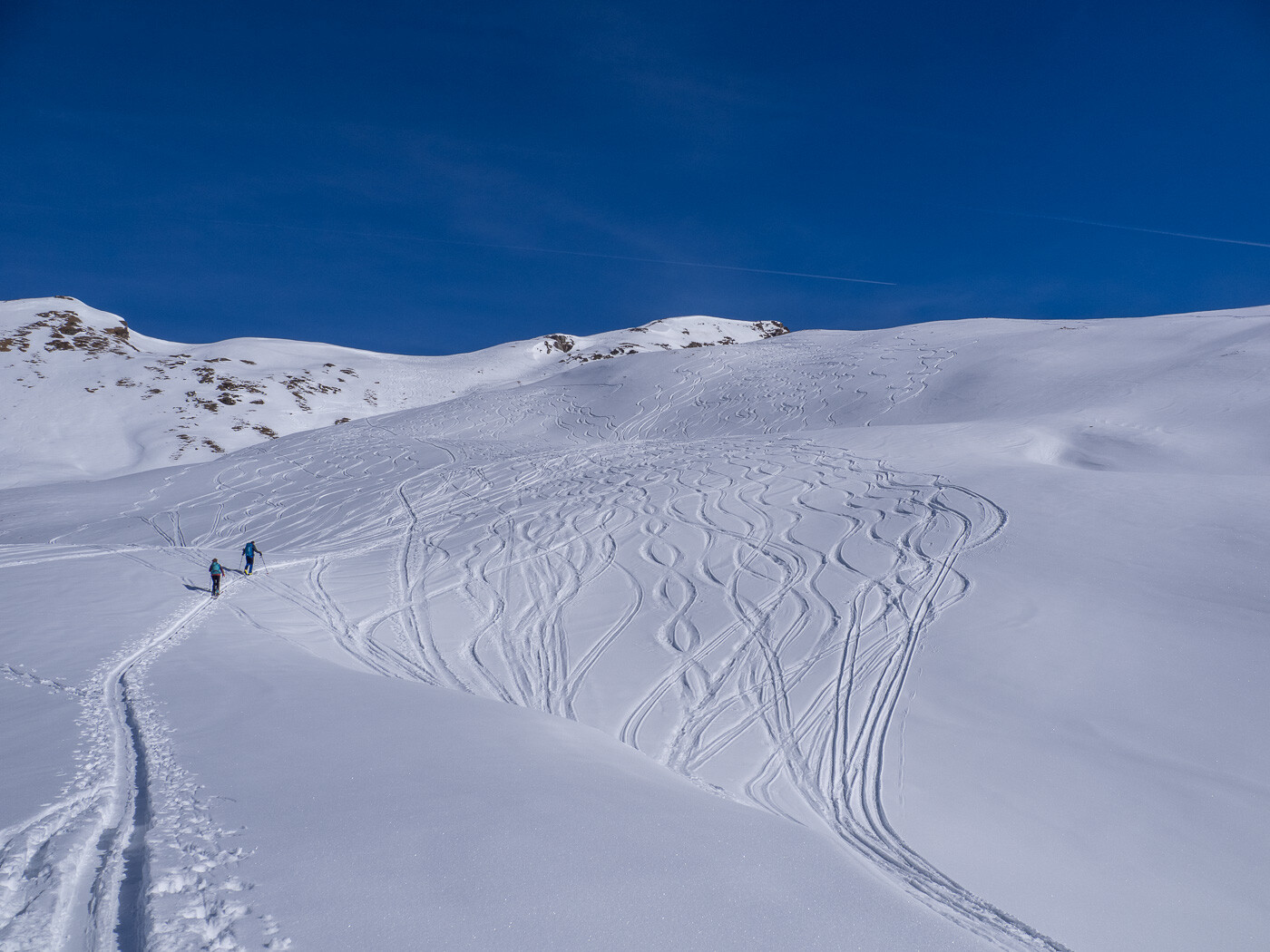 ist noch absolut genug Platz für uns. (Sogar bei einer Wiederholung dieser Tour zusammen mit Doris und Mike, die erst 2 Tage später eintreffen, findet sich auf einer alternativen Abfahrtsroute immer noch unverspurter Pulverschnee.) Vereinzelt musste man zwar auf Steine und Felsen aufpassen, aber den größten Teil der Abfahrt konnten wir es so richtig laufen lassen.