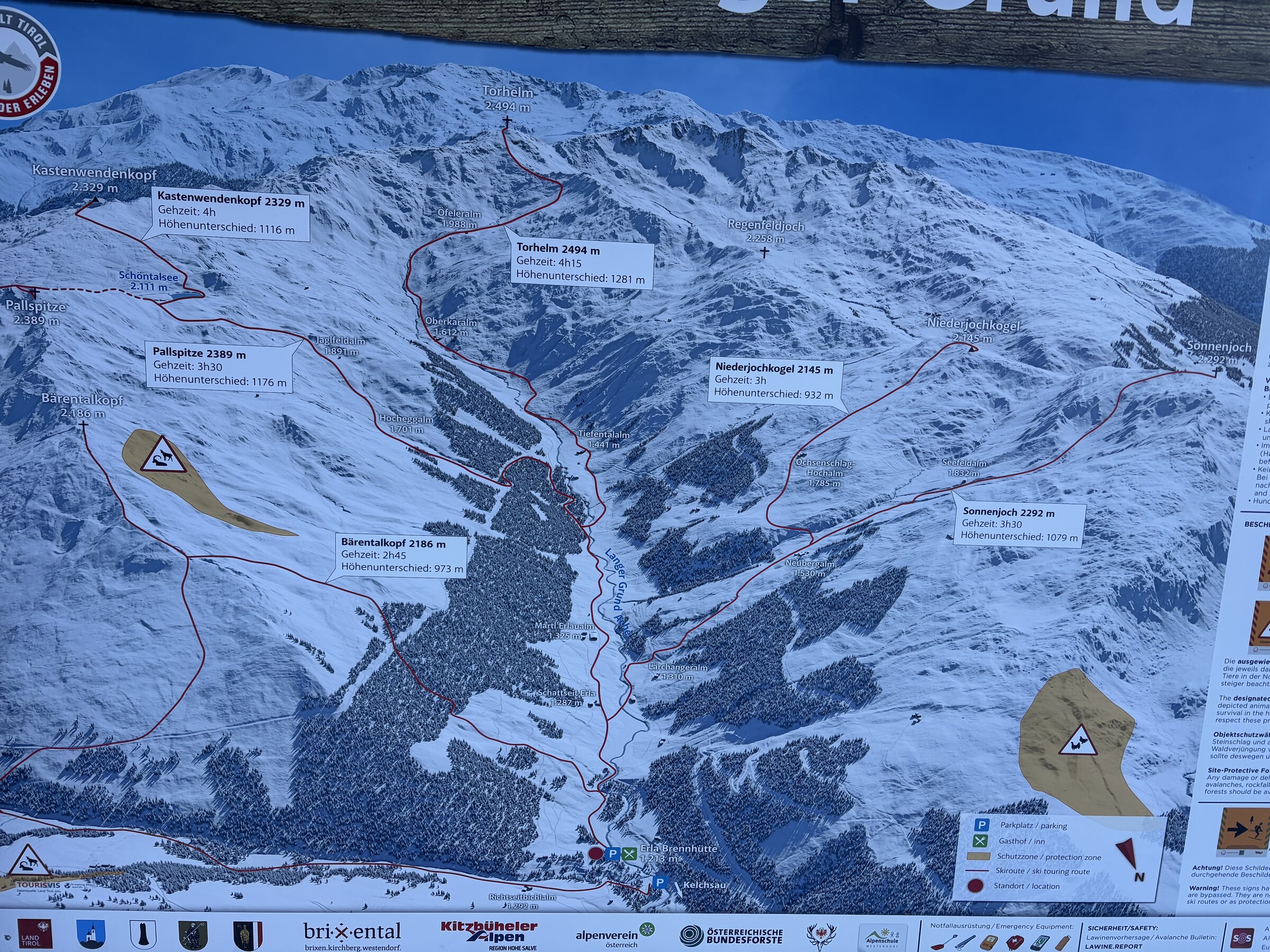 Start an der Erla Brennhütte auf gut 1200m im Langen Grund nach leicht abenteuerlicher Anfahrt auf der schnee- und eisbedeckten Rüttelpiste von Kelchsau (15-20min, Maut 5 EUR). Parkplatz dort fast voll.