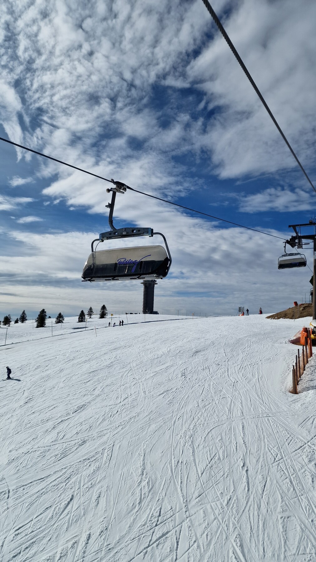Das Skigebiet Feldberg wird ab nächster Woche wohl wieder getrennt sein. Ohne große Schneelieferung geht am Zeiger oben nichts mehr. Resilift ist dick eingeschneit und auch 6er Seebuck ist links vom Lift die Piste ordentlich dick beschneit. Aber nicht breit genug für die Fastnacht Maßen.