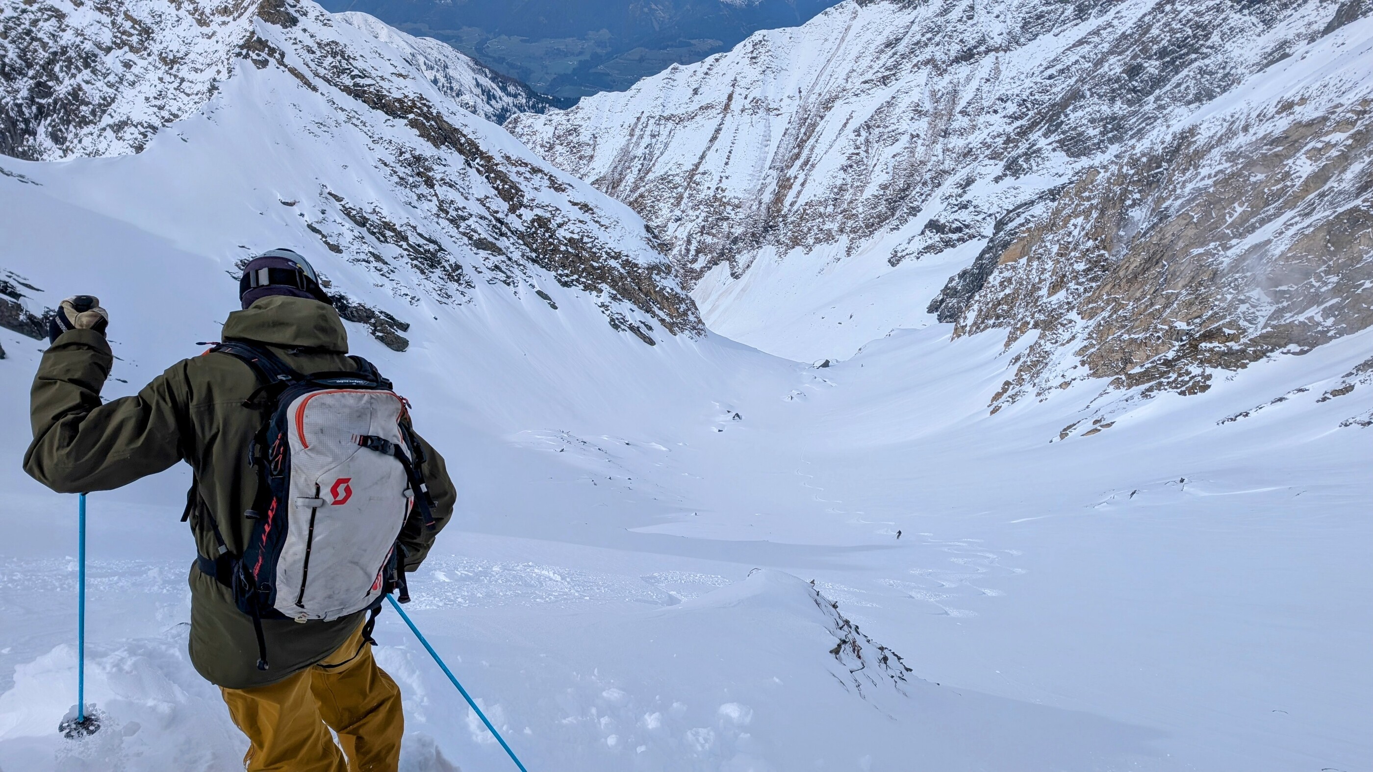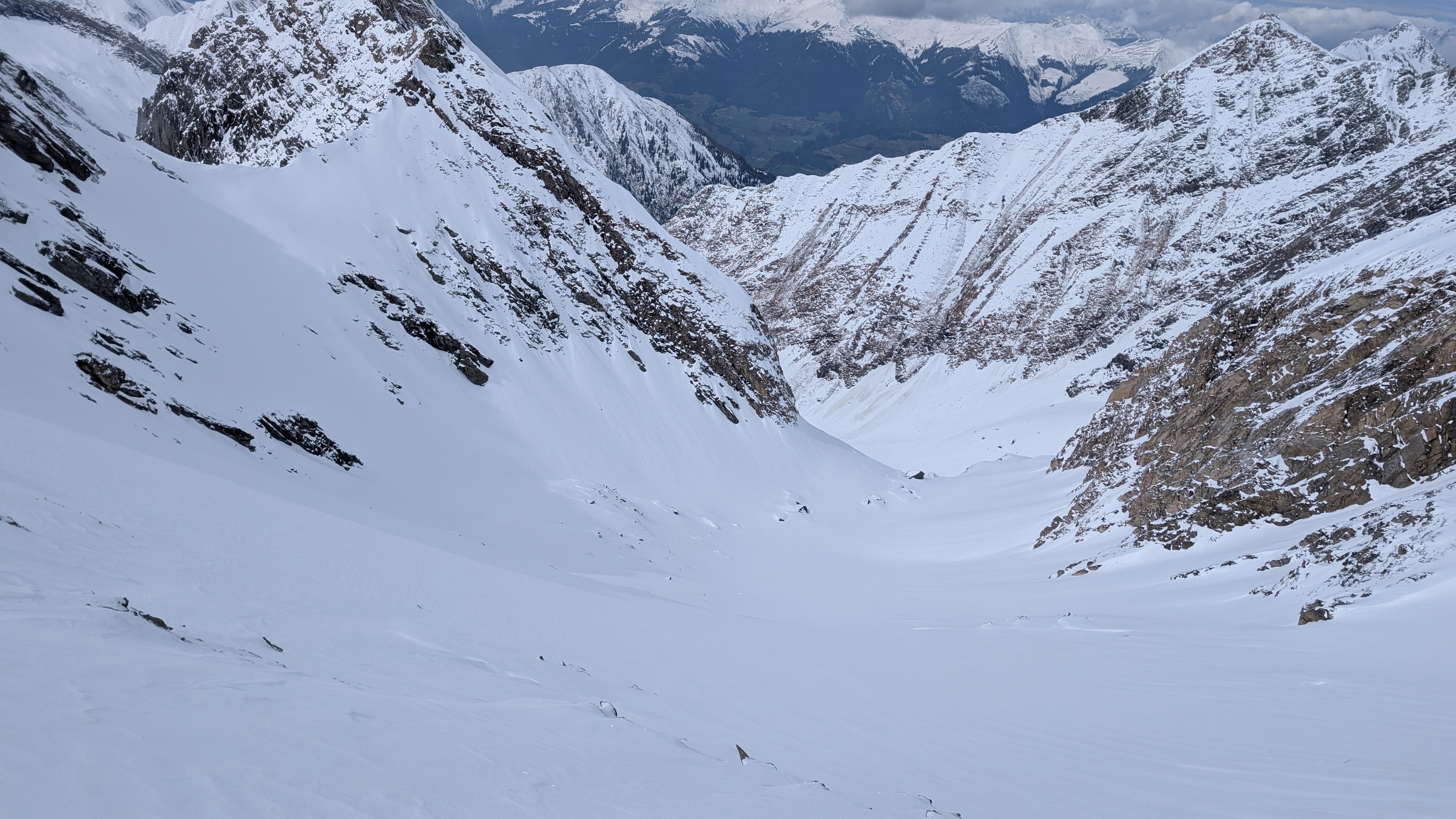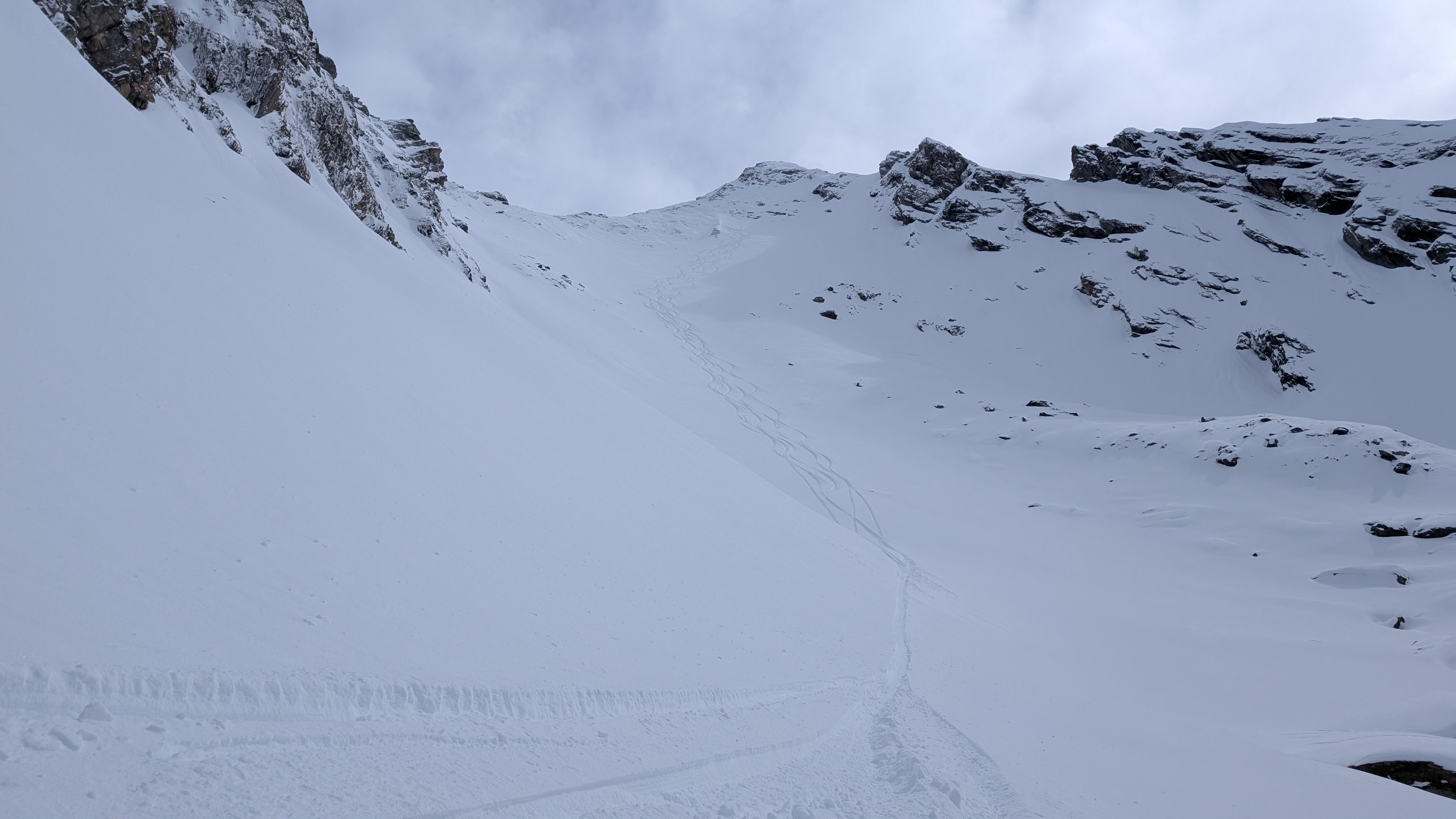 Und selbstverständlich nur einzeln zu befahren. Am Ende dieses Kars sind wir dann zwischen den Felsen nach rechts gequert, um in den 2. Hang zu gelangen.