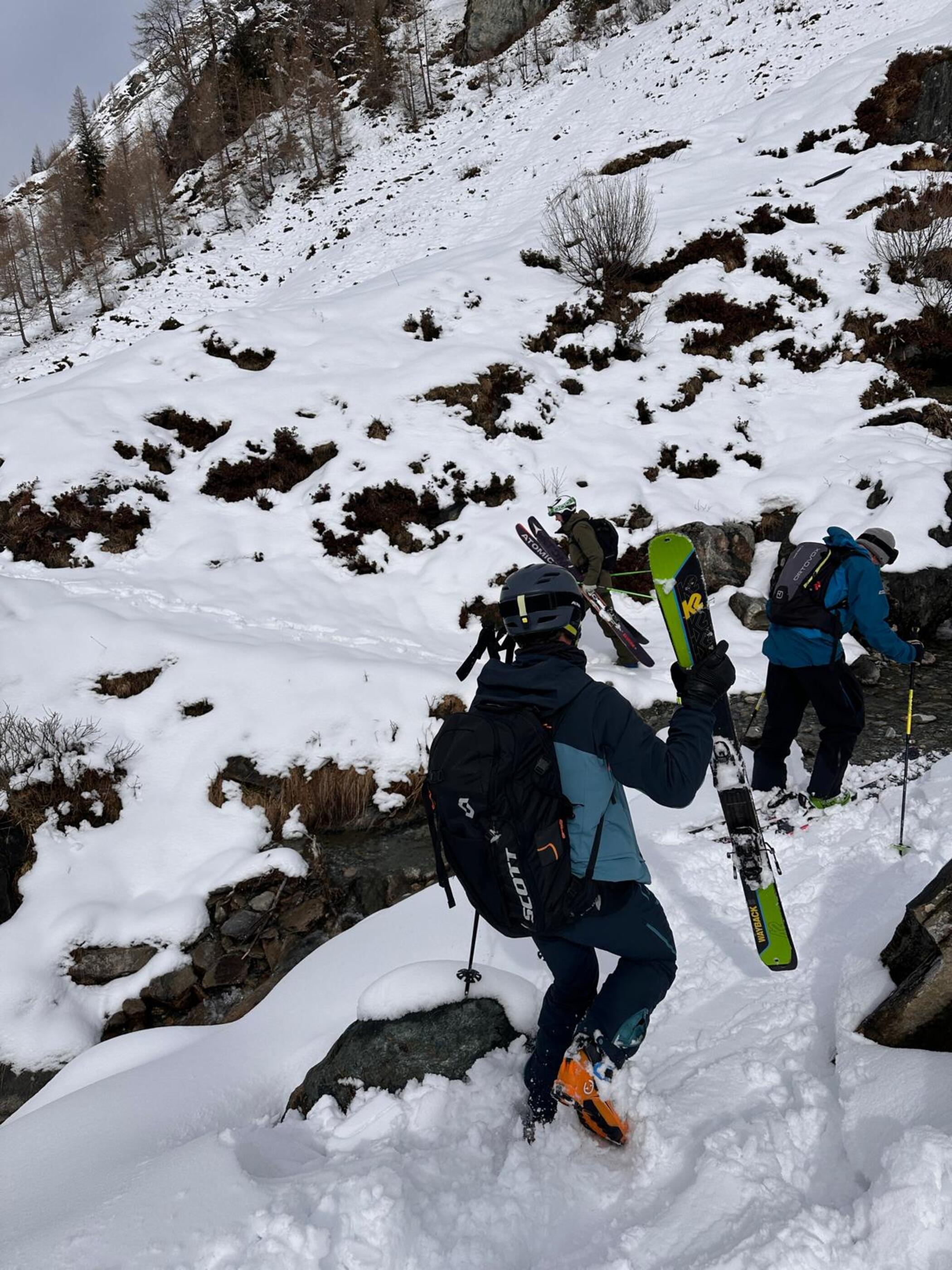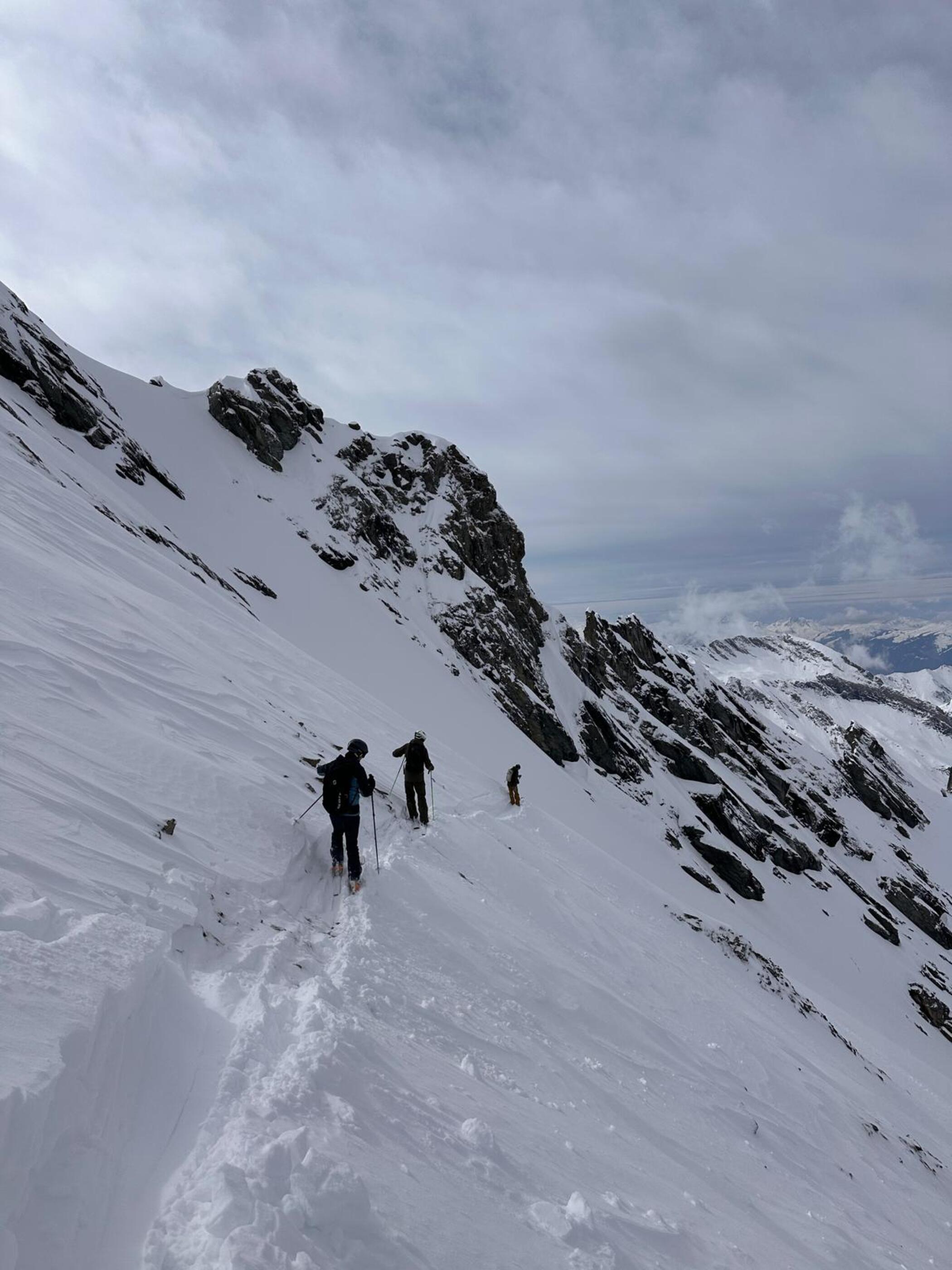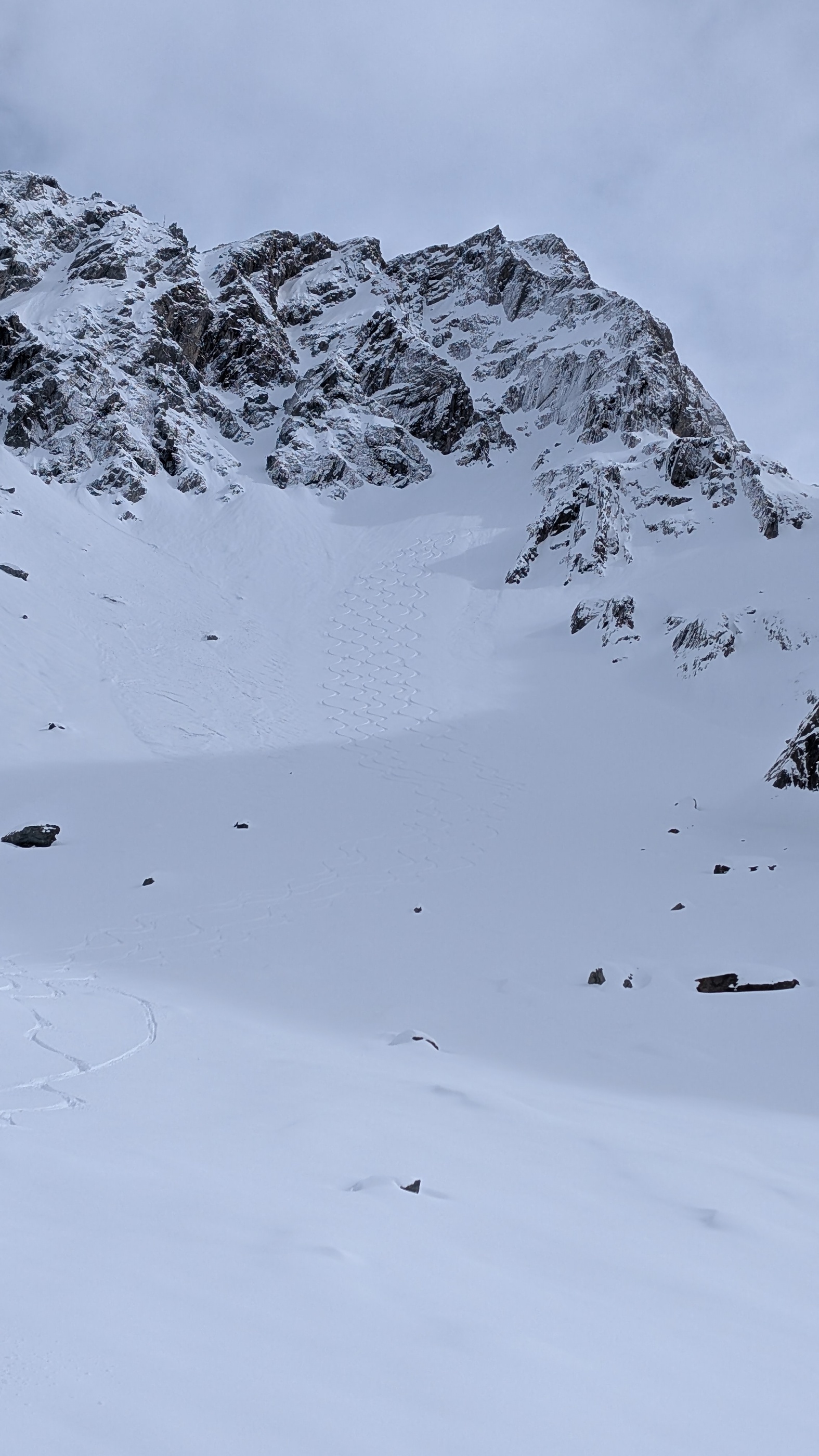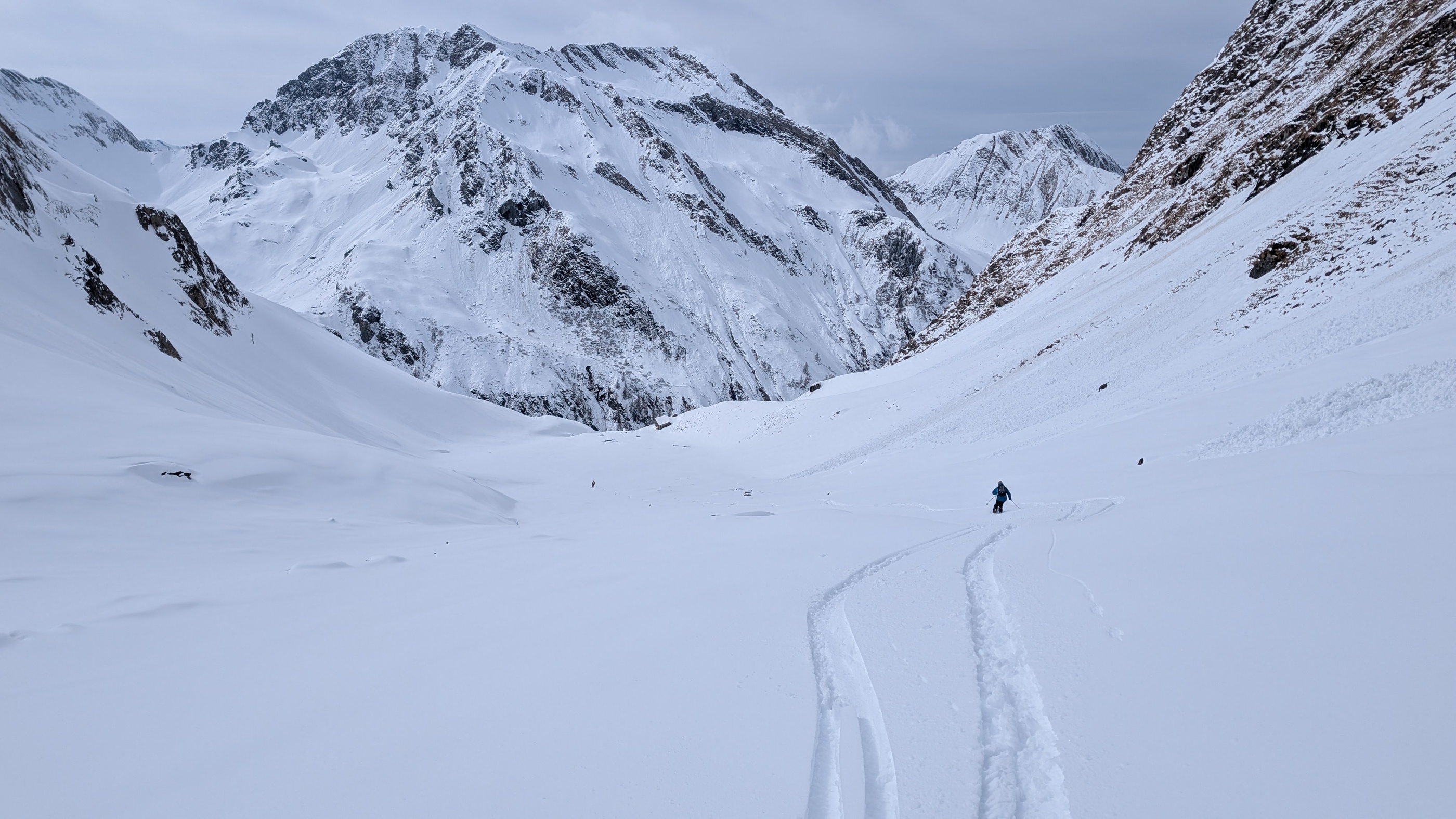 Und selbstverständlich nur einzeln zu befahren. Am Ende dieses Kars sind wir dann zwischen den Felsen nach rechts gequert, um in den 2. Hang zu gelangen.