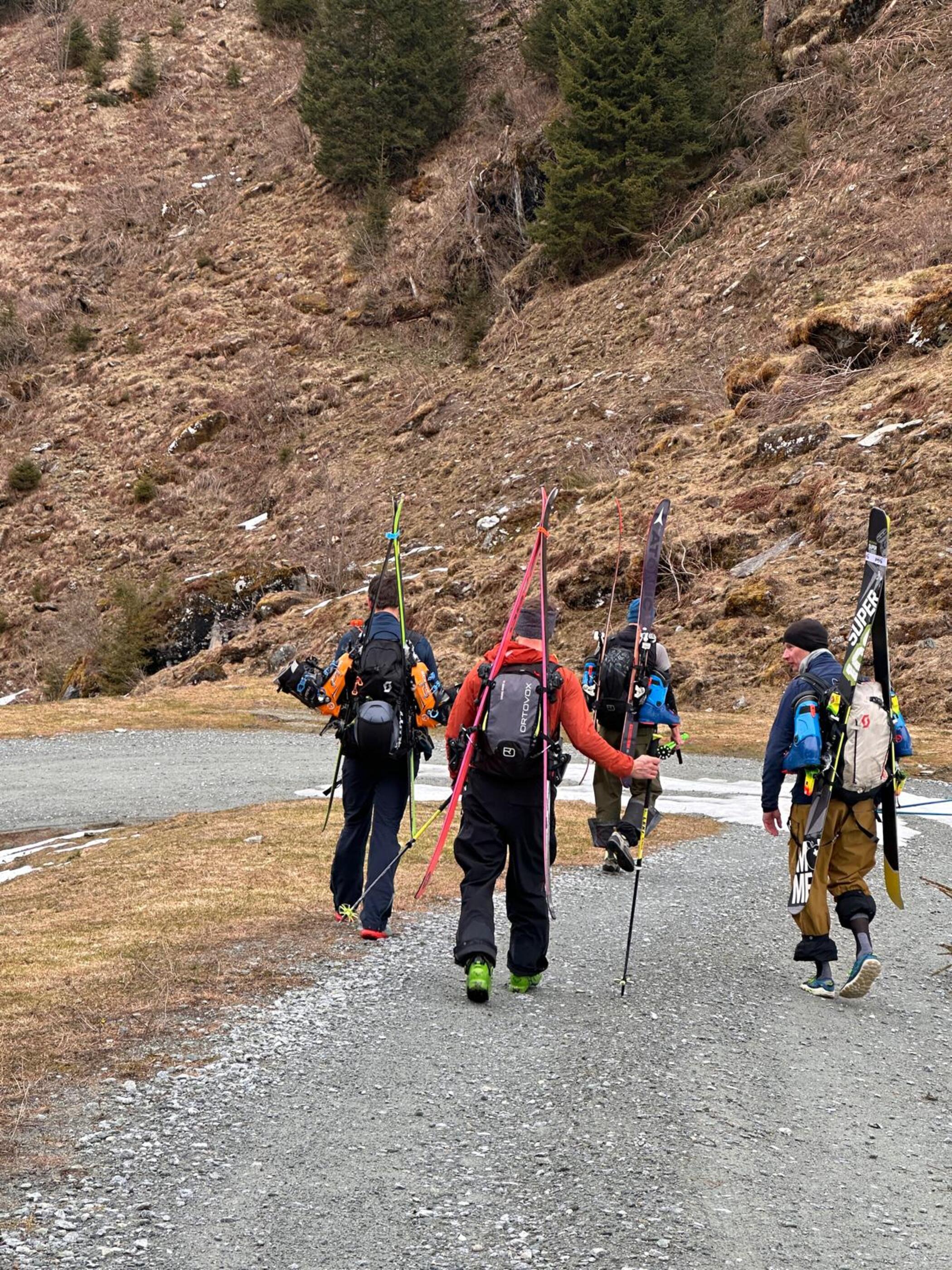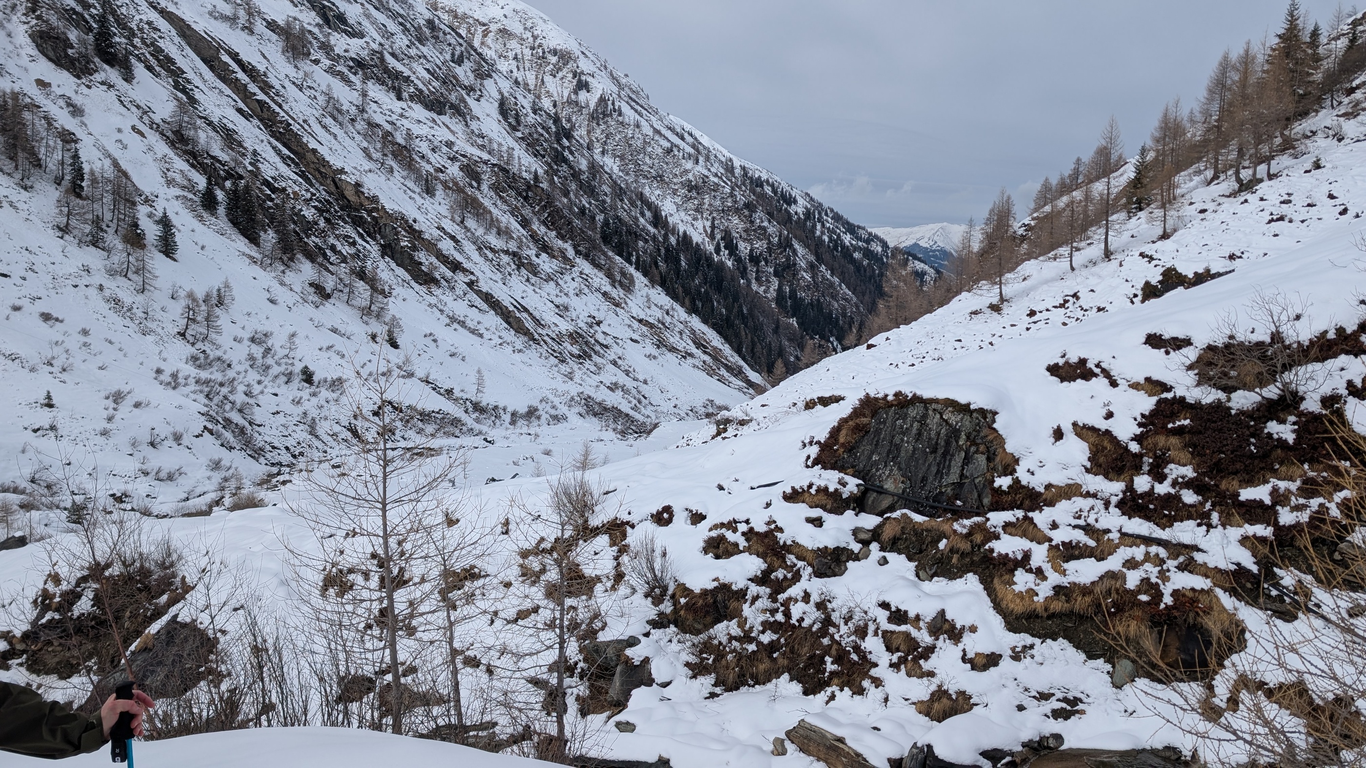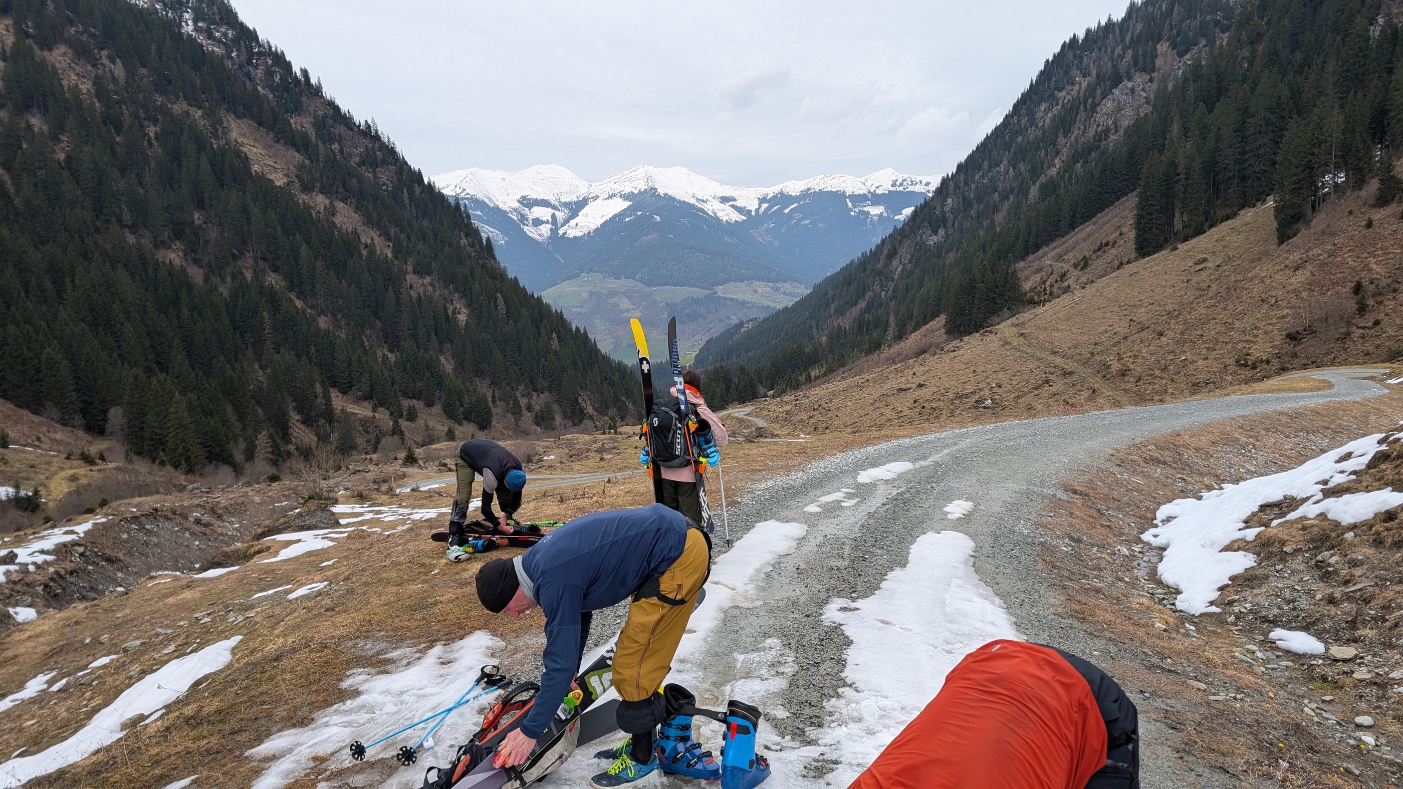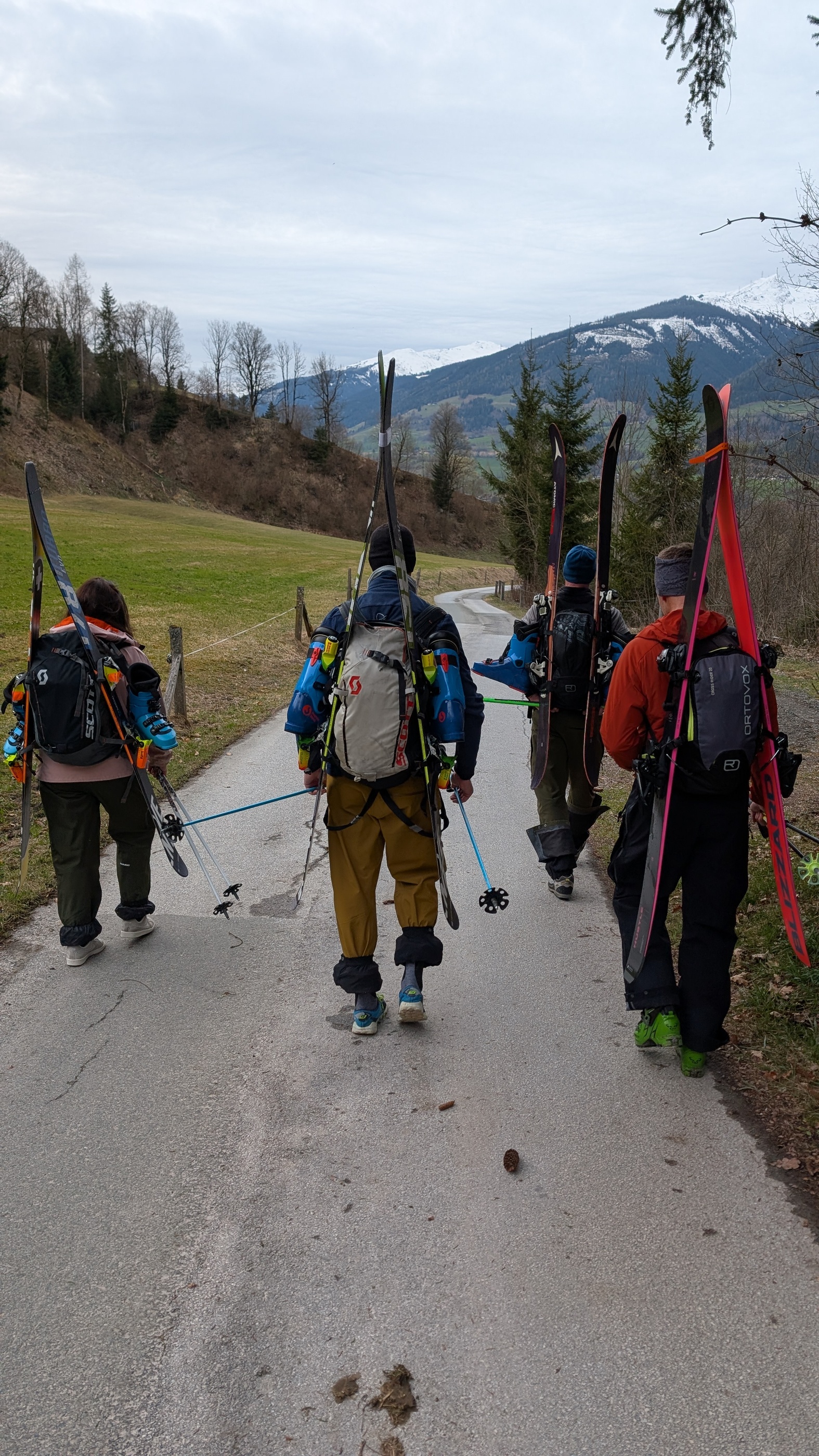 Und der ist dann auch schnell wie erwartet gänzlich schneefrei. Auf uns warten 6km Fußmarsch mit den Ski am Rucksack. T packt da in Bochum gerade ihren Koffer für eine Woche Beachvolleyball in Portugal...