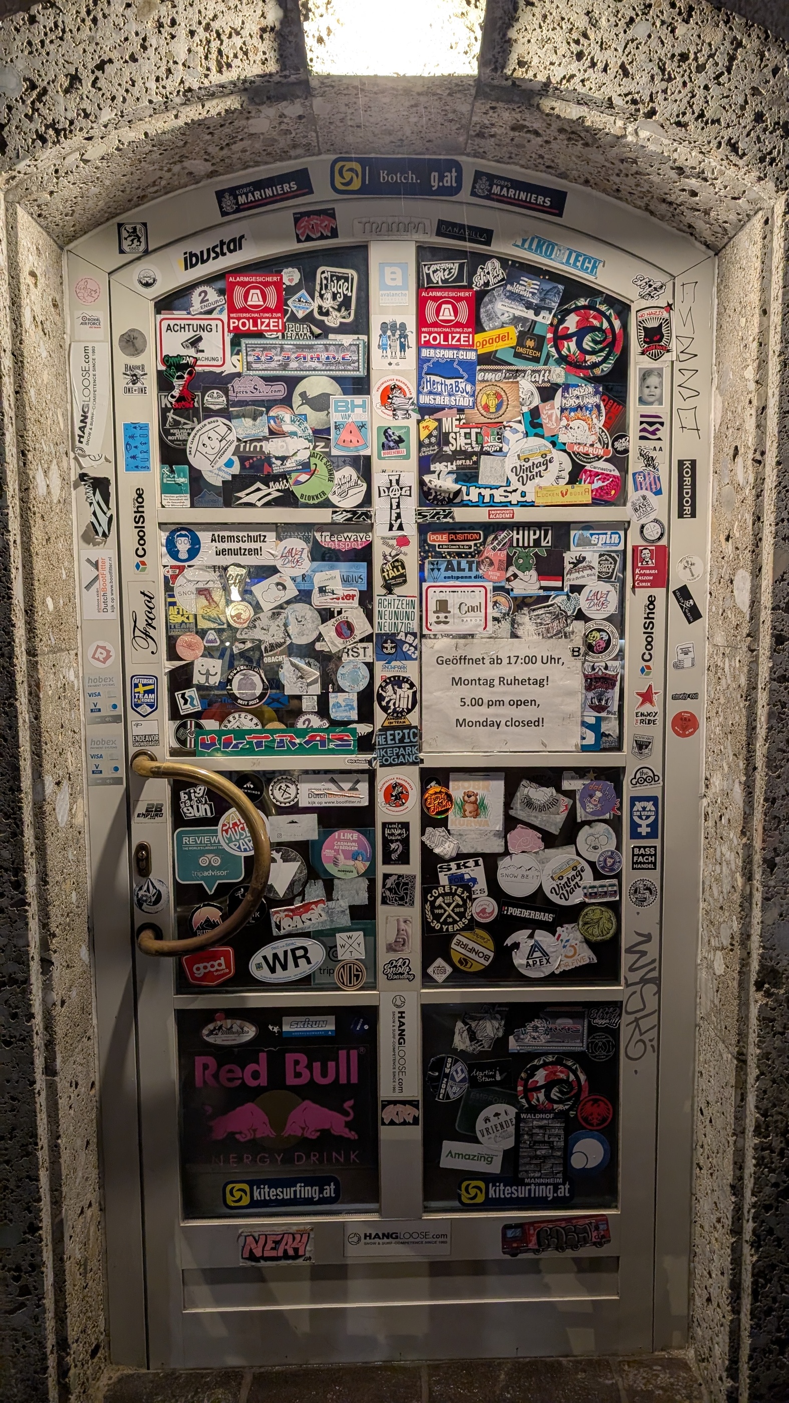 17:30 Uhr - ein Tag vor der Zeitumstellung, daher ist es bereits dämmrig, als ich vor dieser Tür in Kaprun stehe. Es könnte auch der Eingang in eine Kneipe in meinem geliebten bochumer Stadtteil Ehrenfeld sein. Für einen Moment habe ich fast heimatliche Gefühle. Die Tür macht keinen Hehl daraus, dass sie der Eingang in einen der Szene-Schuppen im Ort ist - also mehr so Marke "Tattoos, Piercings und Dreadlooks" als "Après-Ski und Ballerman". Allemal der perfekte Ort für die Einstimmung auf den morgigen Tag - und für eine gute Pizza. Kurzum: Die Wahl gefällt mir, aber ich hatte sie gar nicht getroffen sondern @freeriderin.