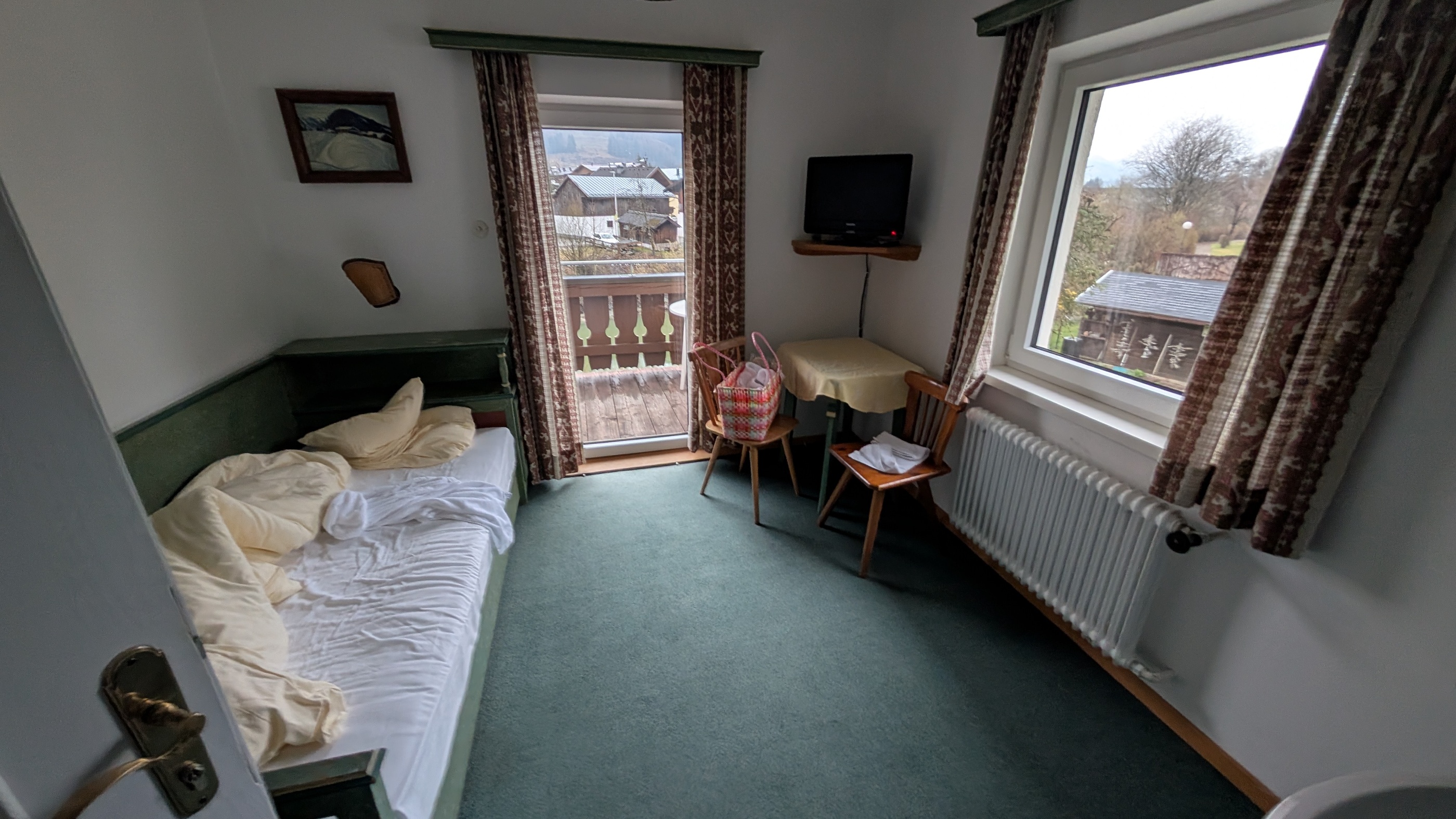 Ich bin grundsätzlich nicht abgeneigt, bei der Unterkunftswahl auch mal ein bisschen in Komfort zu investieren (zumal ich die Woche zuvor fünf Tage mit einem Freund auf einer Alpenvereinshütte im Lager genächtigt hatte), allerdings erscheint mir das an diesem Abend nicht sinnvoll. Nach dem Abendessen mit der Truppe würde ich aus sozialer Indikation noch das Zweitliga-Spiel von Fortuna Düsseldorf mit anschauen und dann direkt in mein Bett durchgehen, aus dem ich dann am nächsten Morgen direkt wieder auschecke. Der ultimative Tipp von @freeriderin, dem ich gefolgt bin: Wenn man über die Homepage des Sporthotel Woferlgut ein Zimmer in der ... sagen wir ... nostalgischen Pension Alpenblick bucht (Homepage: "Traditionelle Ausstattung"), bekommt man das Frühstück im 4*-Hotel und auch nach dem Checkout kann man für den Rest des Tages dort die riesige Wellnessanlage nutzen. Super!