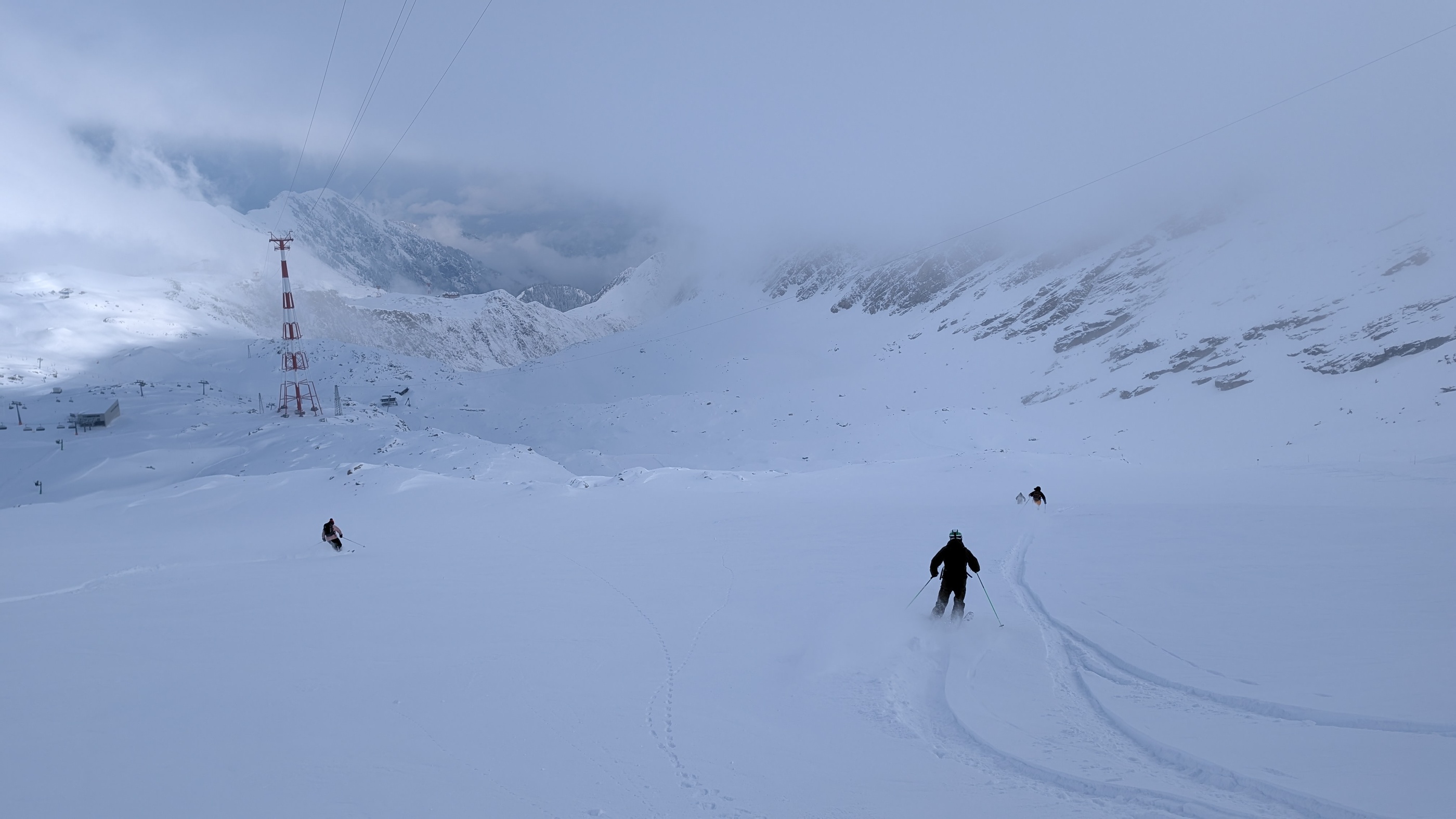 Der nächste Morgen: Der ganz große Neuschnee kam erst am Folgetag, aber es hatte in der Nacht durchaus im Stau seine 40cm gegeben plus Windverfrachtungen, die auch explizit im Lawinenlagebericht für die entsprechenden Expositionen bewarnt wurden. Schneefallgrenze, oder besser Schneeliegenbleib-Grenze nicht ganz klar, ich tippe auf 1700m. Mein Vorsatz, mich mit den anderen zur obligatorischen ersten Gondel am Parkplatz der Gletscherbahn zu treffen, zerschellte ein wenig am wirklich reichhaltigen Frühstücksbuffet und ich bildete die Nachhut. Asche auf mein Haupt.