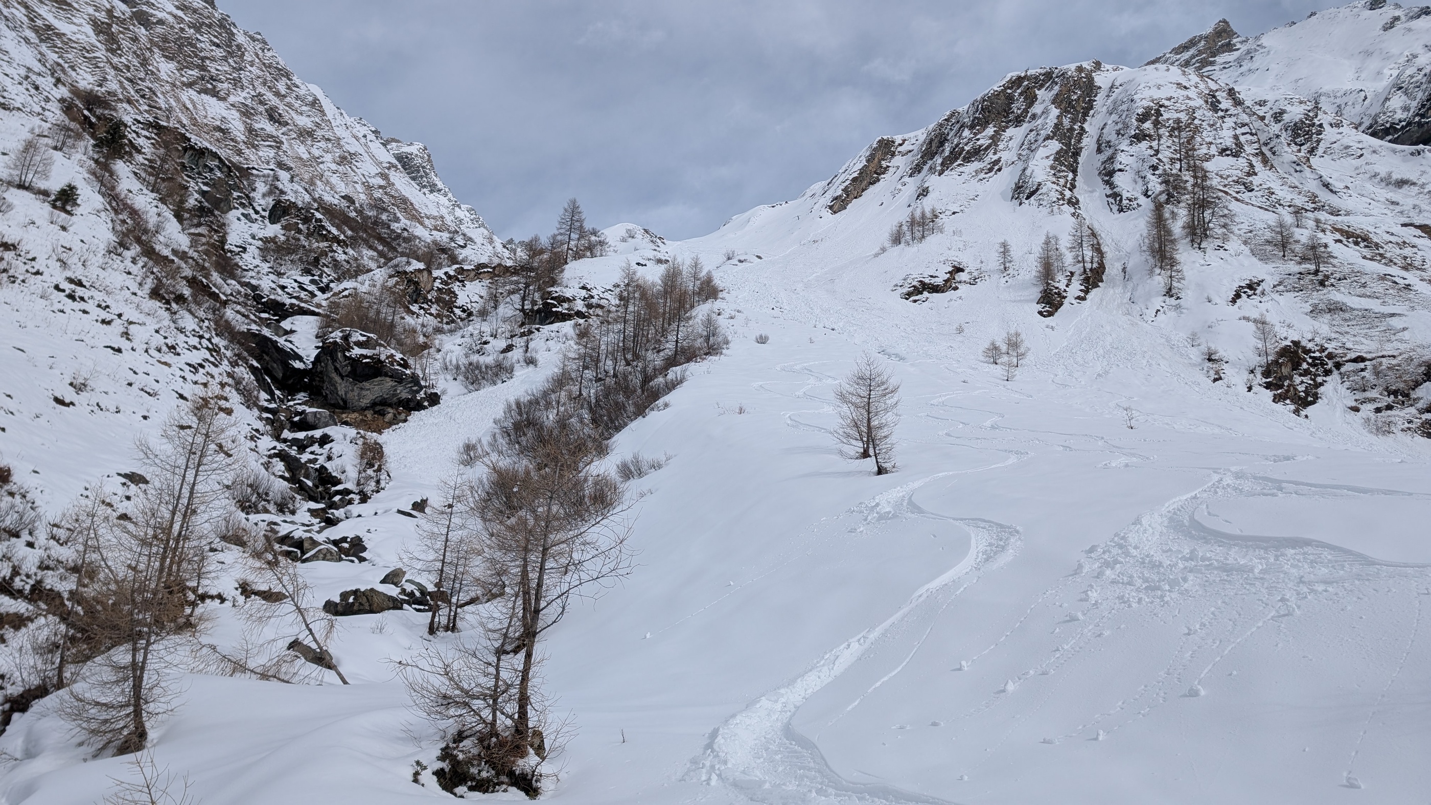 Interessante und in den 35+ Grad Hängen natürlich respekterfordernde Abfahrt, die ich auf der Hangneigungskarte gut nachvollziehen konnte. Sicherlich nochmal spassiger wenn es auch bis ganz unten Schnee hat ;)